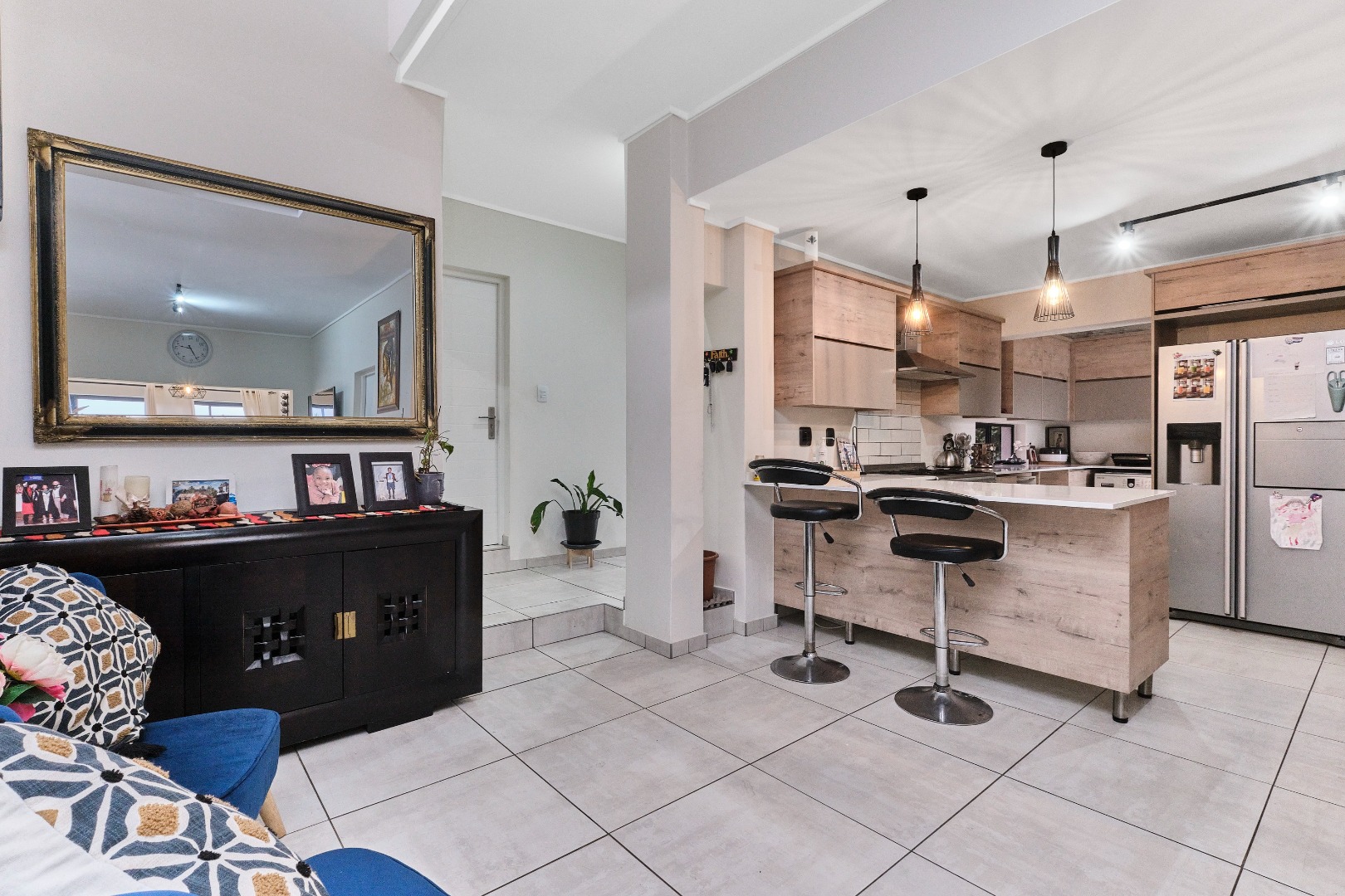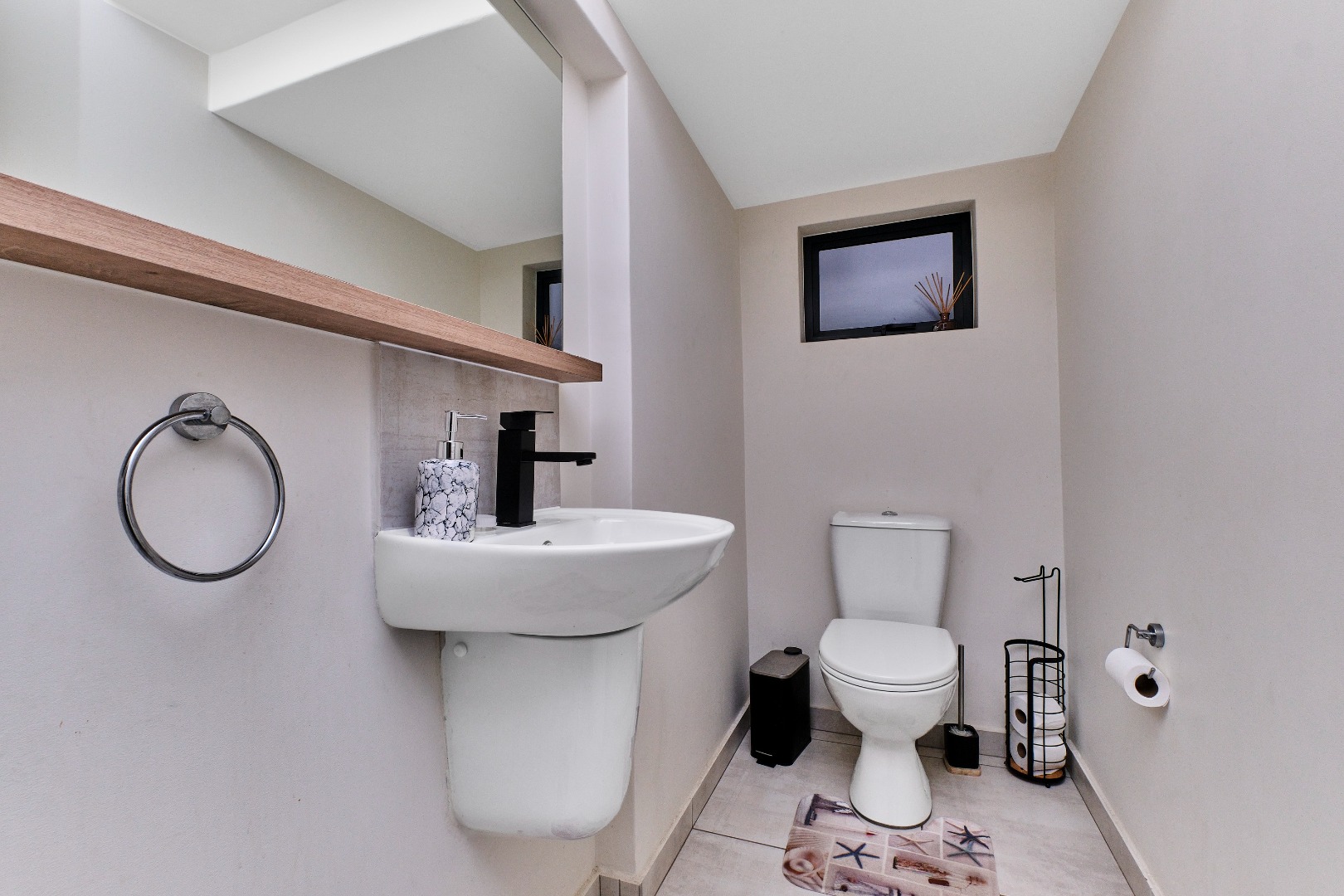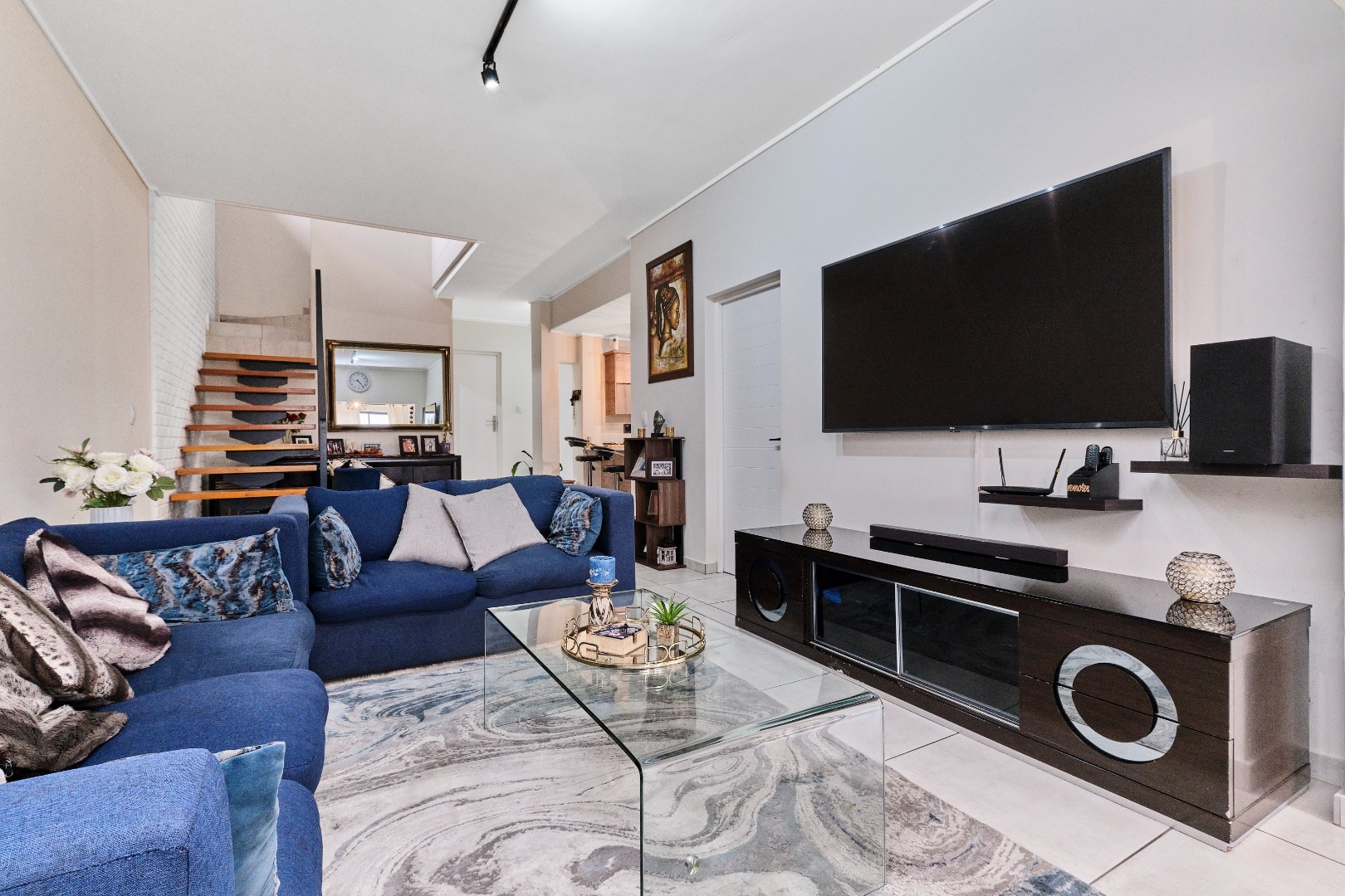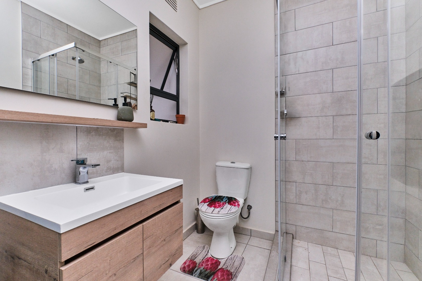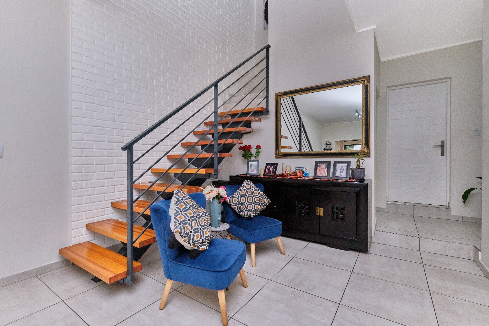 As you enter, you are welcomed by a stylish reception area that flows seamlessly into an open-plan lounge and dining area, ideal for family living and entertaining. The lounge opens out to a lush, well-maintained garden, perfect for relaxation or outdoor gatherings. The spacious kitchen is a chef’s delight, featuring a scullery, ample cupboard space, three appliance connections, space for a double-door fridge, and a gas stove. A guest toilet and a generously sized bedroom complete the downstairs layout.