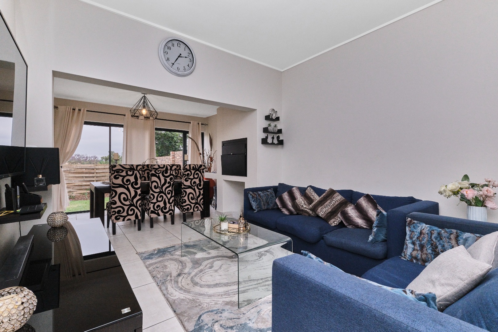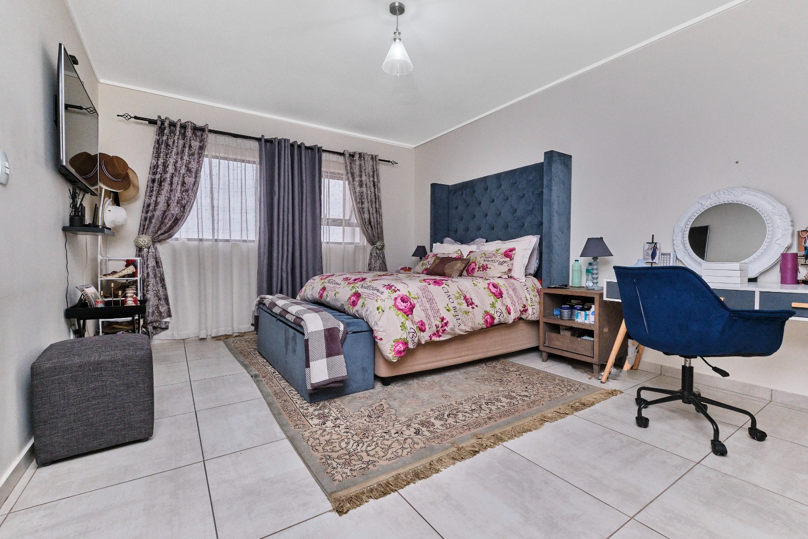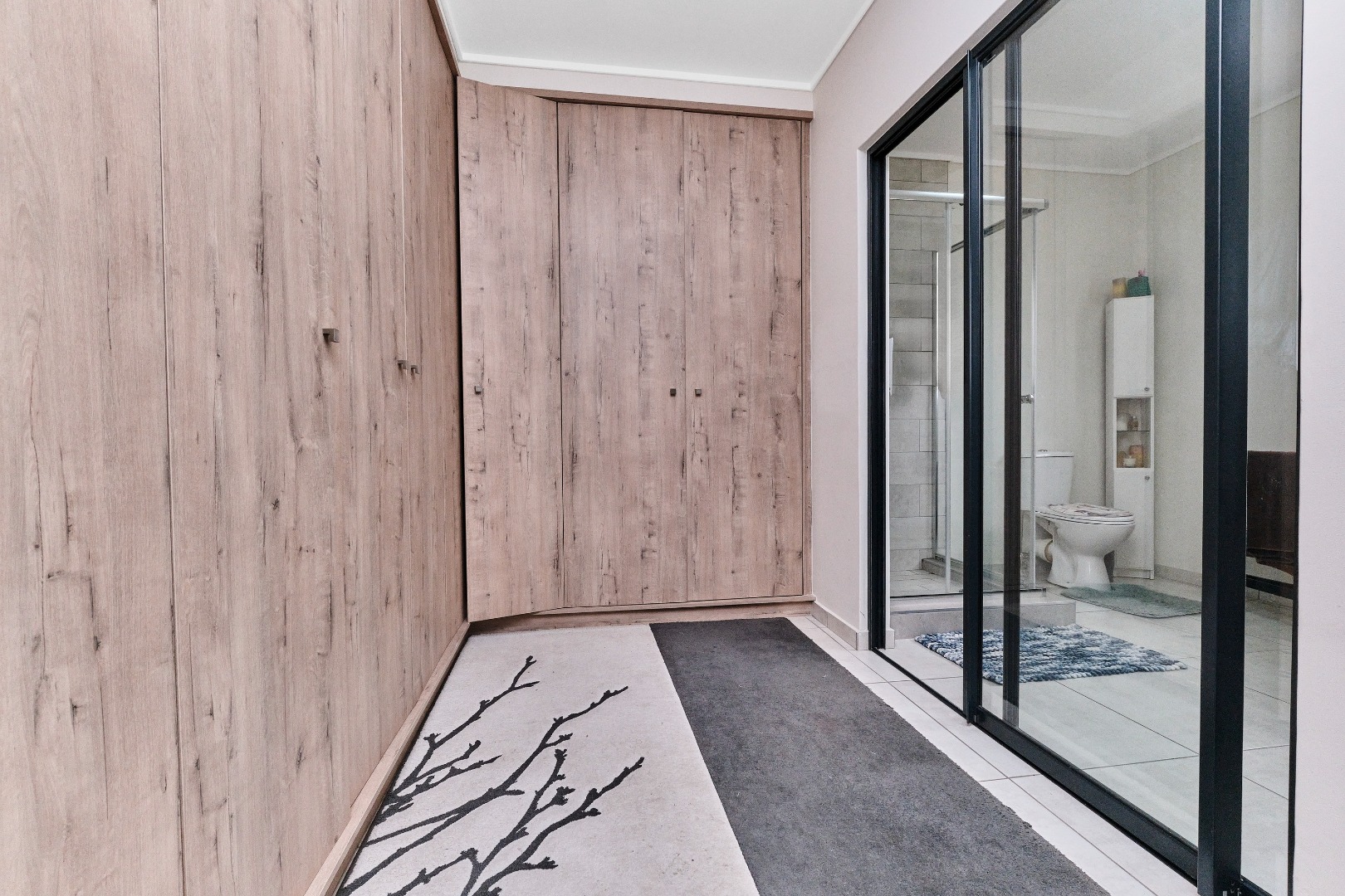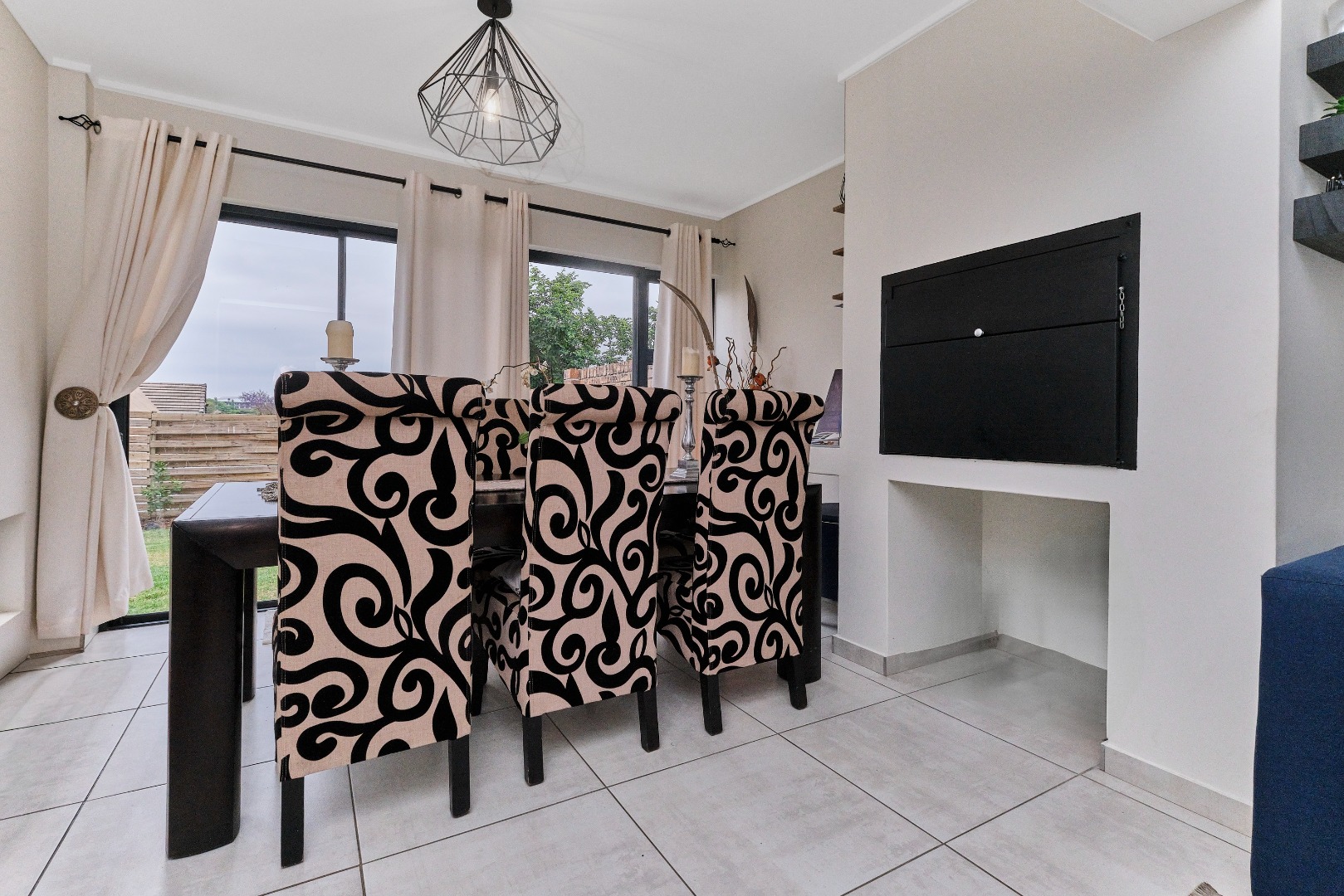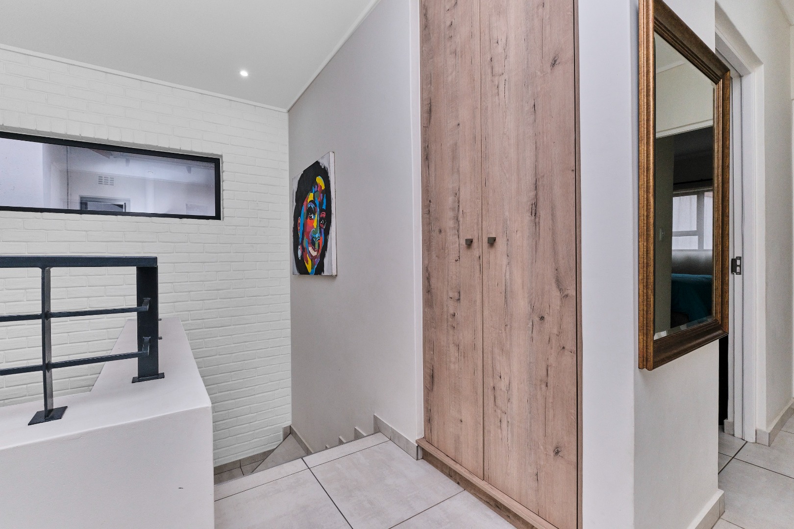 As you enter, you are welcomed by a stylish reception area that flows seamlessly into an open-plan lounge and dining area, ideal for family living and entertaining. The lounge opens out to a lush, well-maintained garden, perfect for relaxation or outdoor gatherings. The spacious kitchen is a chef’s delight, featuring a scullery, ample cupboard space, three appliance connections, space for a double-door fridge, and a gas stove. A guest toilet and a generously sized bedroom complete the downstairs layout.