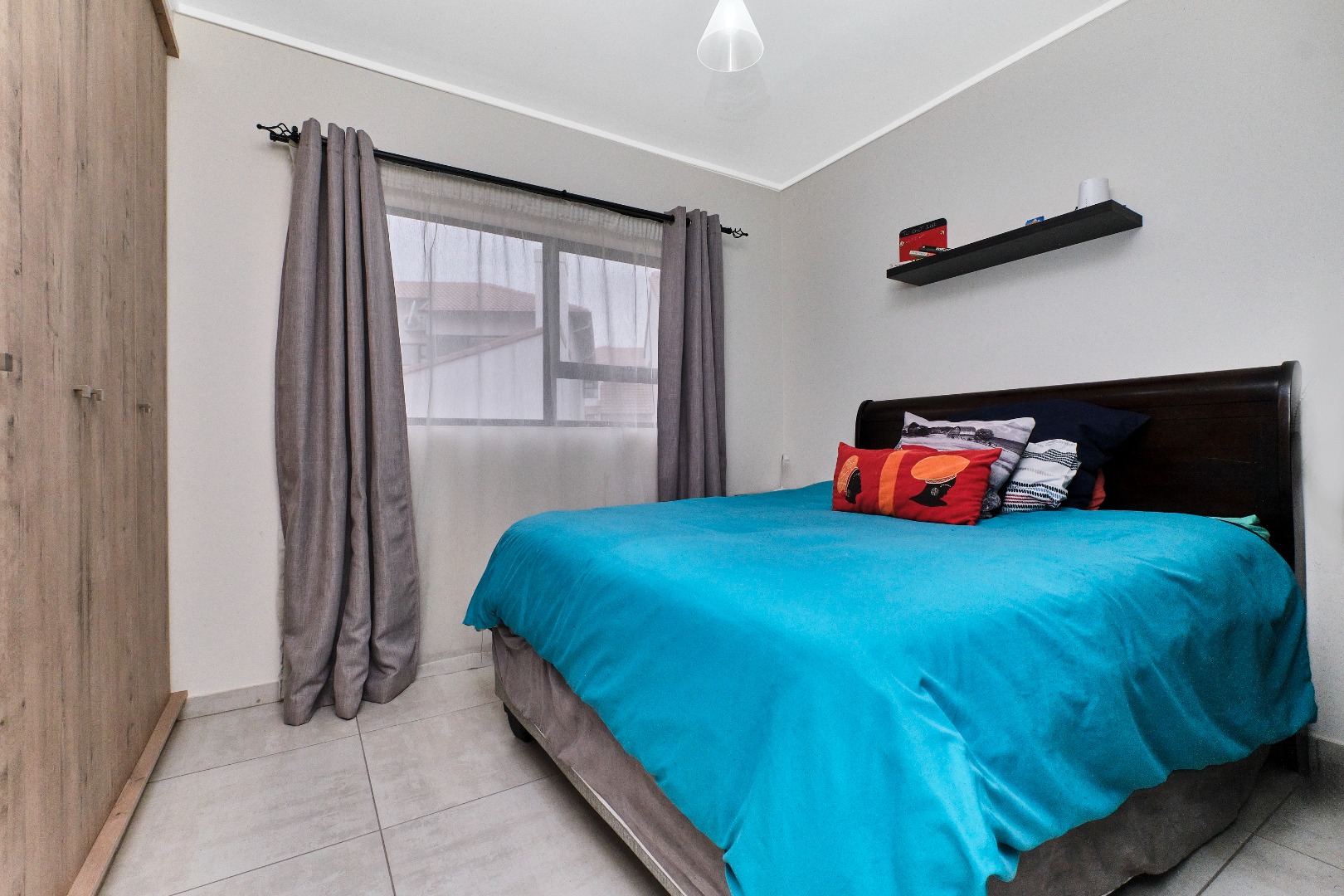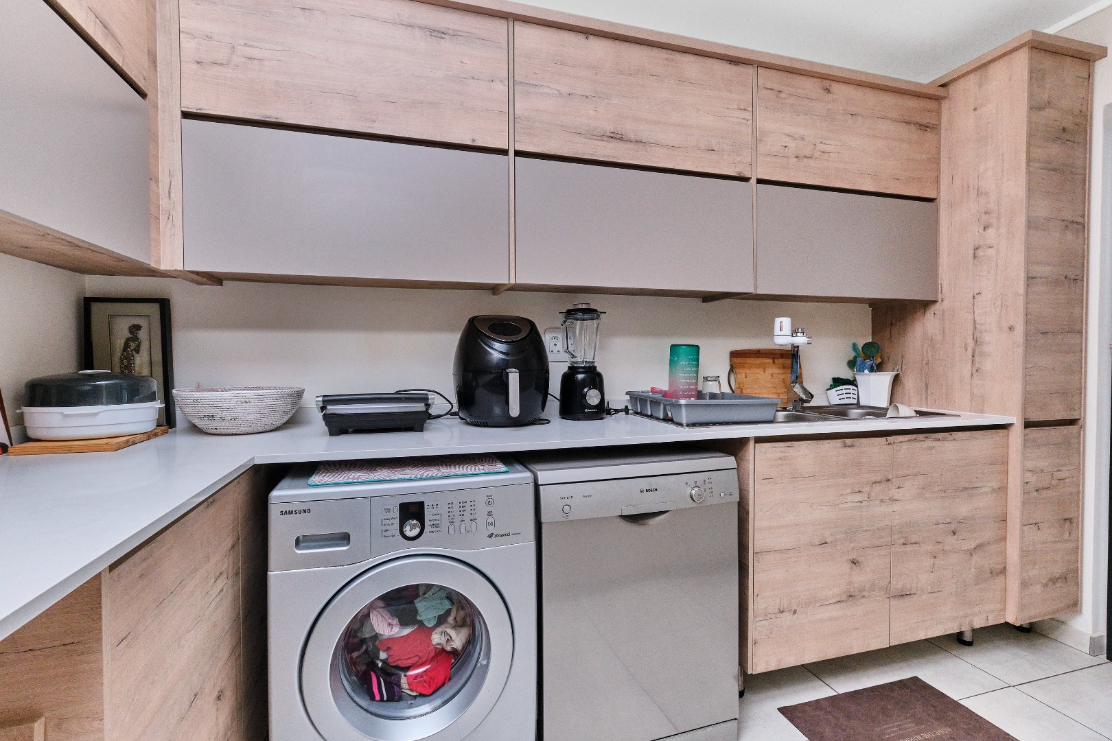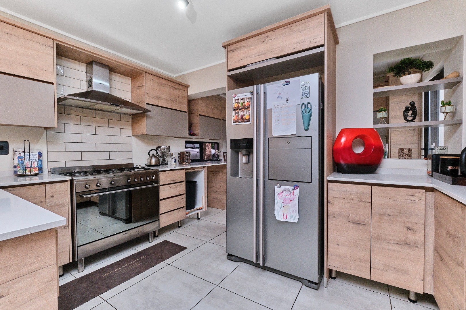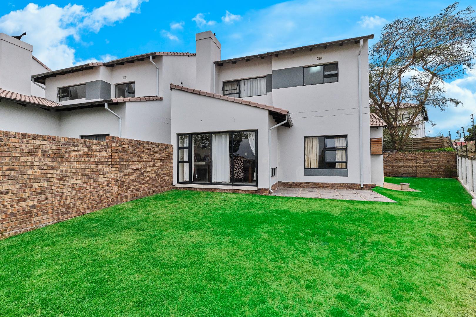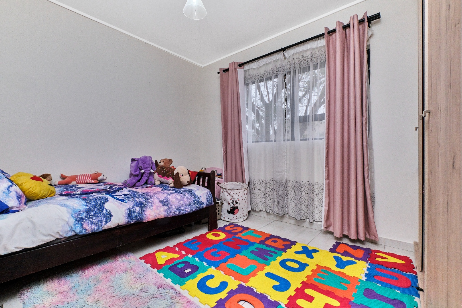 As you enter, you are welcomed by a stylish reception area that flows seamlessly into an open-plan lounge and dining area, ideal for family living and entertaining. The lounge opens out to a lush, well-maintained garden, perfect for relaxation or outdoor gatherings. The spacious kitchen is a chef’s delight, featuring a scullery, ample cupboard space, three appliance connections, space for a double-door fridge, and a gas stove. A guest toilet and a generously sized bedroom complete the downstairs layout.