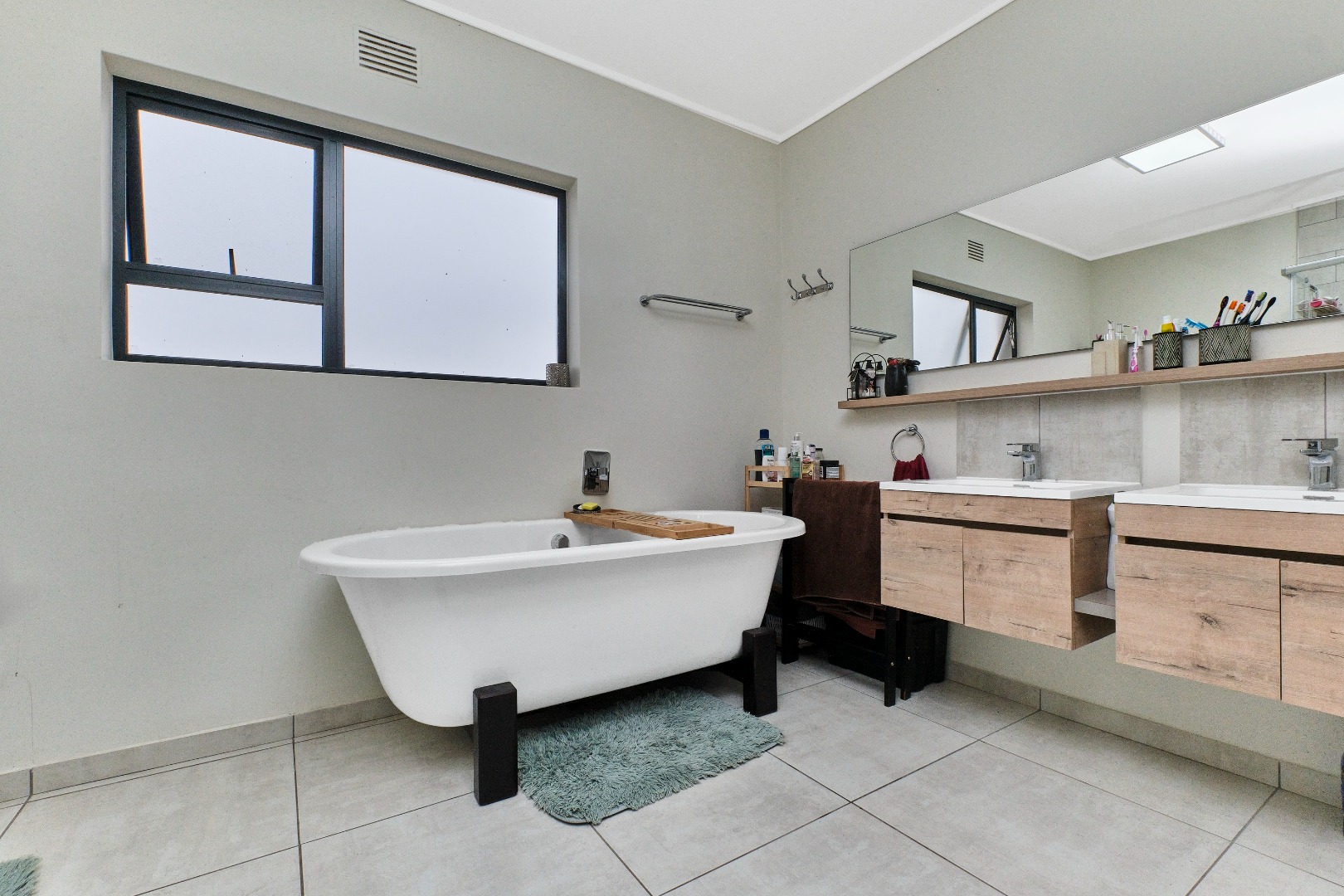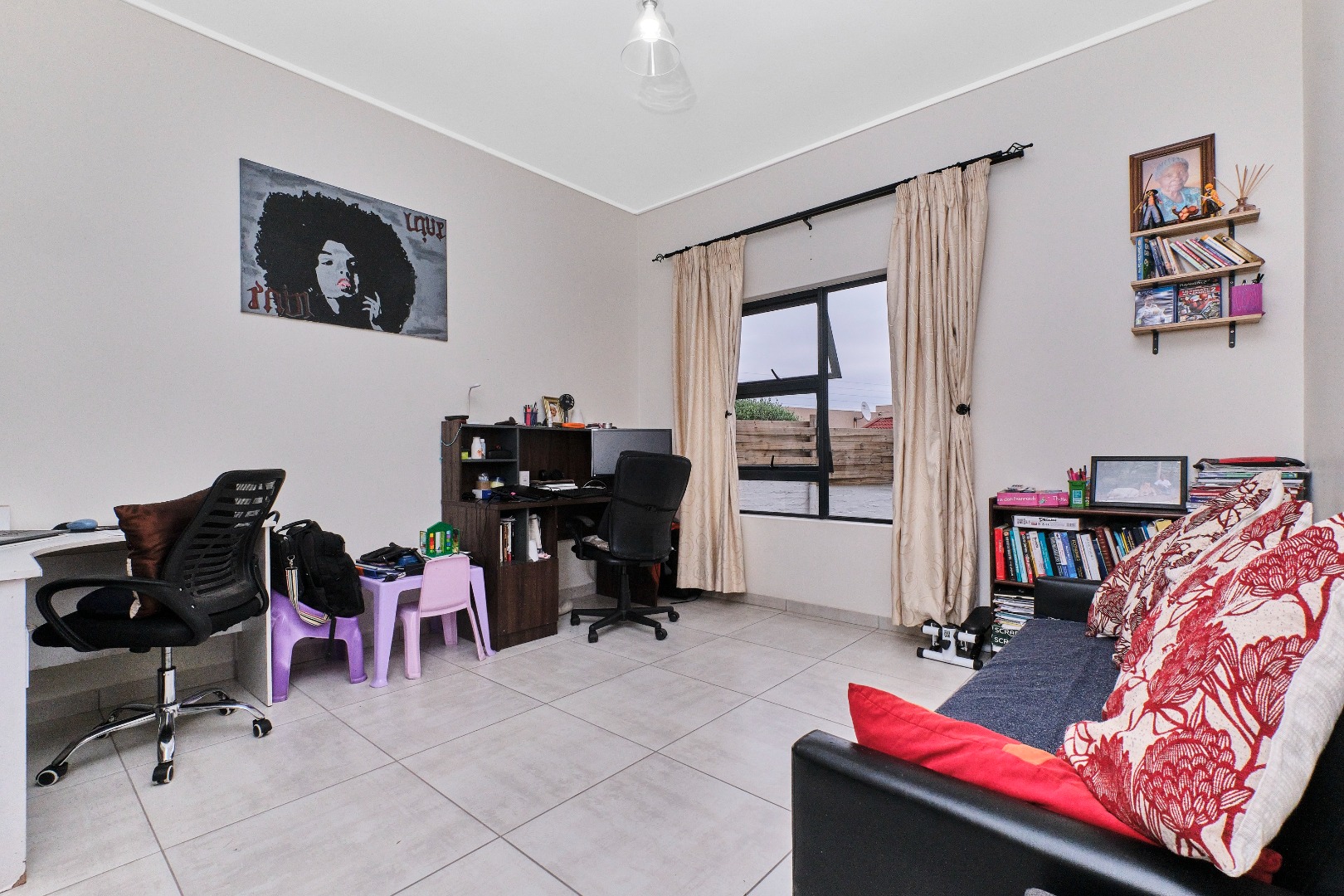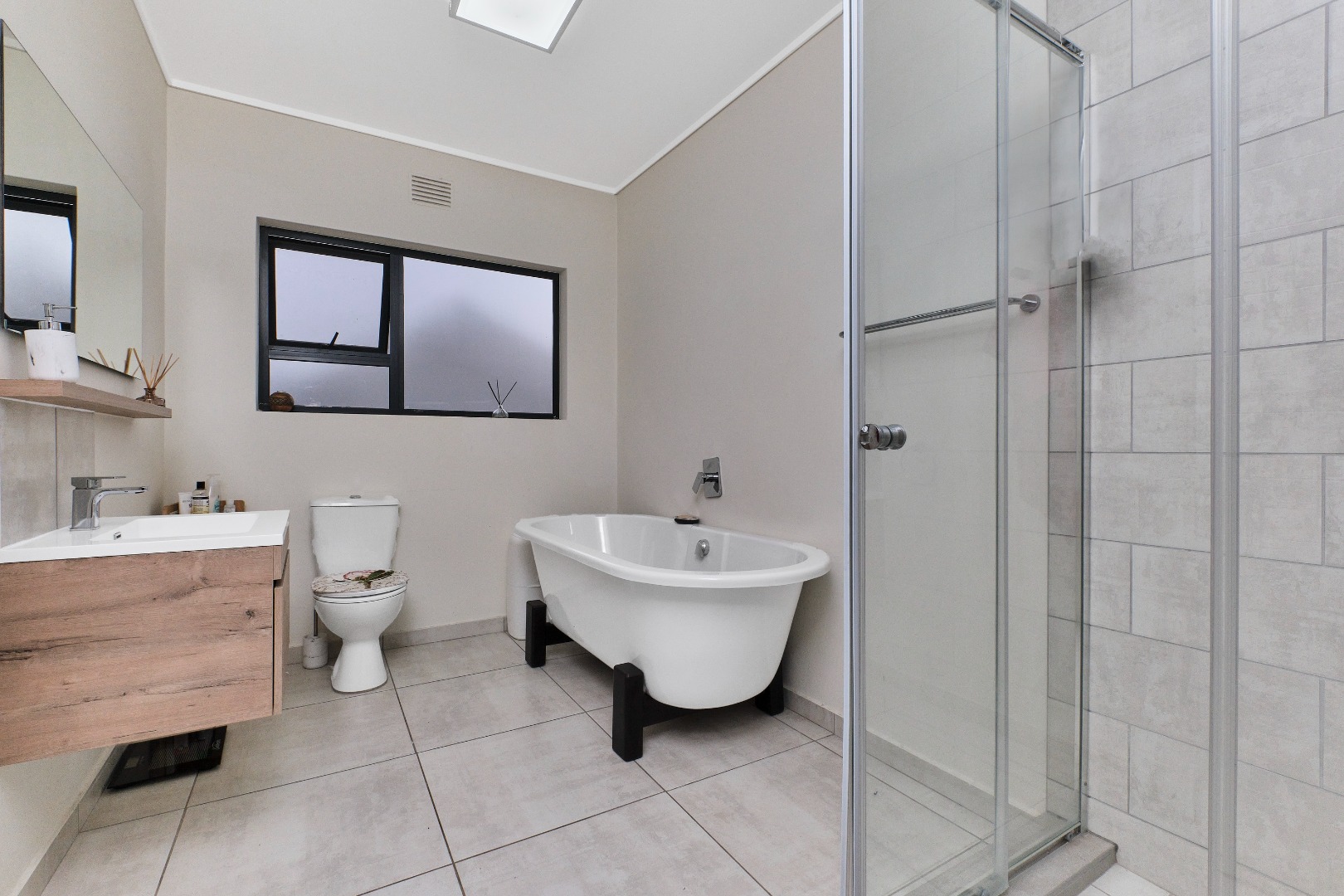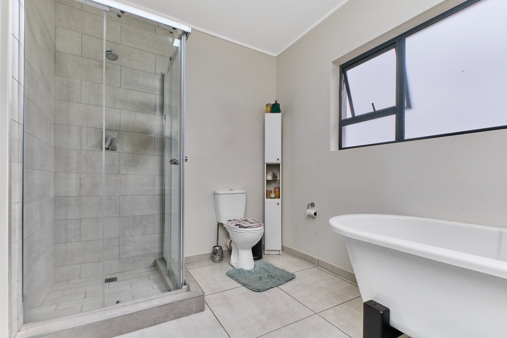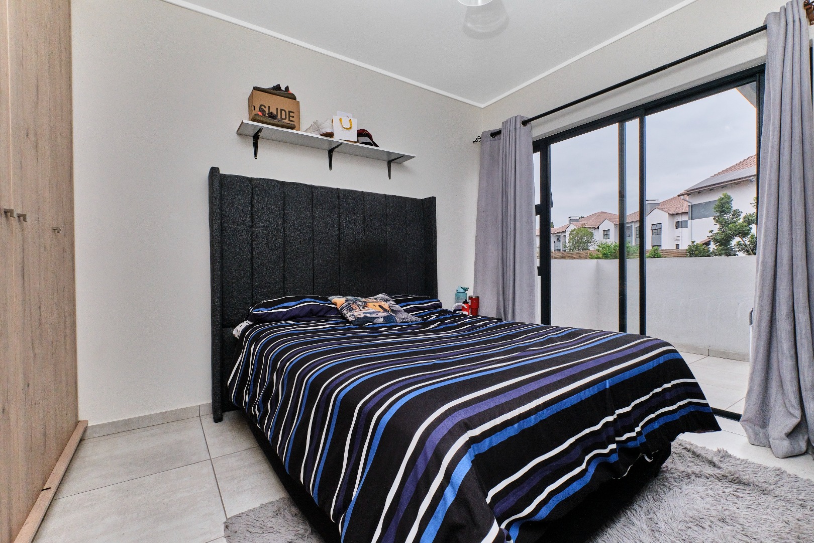 As you enter, you are welcomed by a stylish reception area that flows seamlessly into an open-plan lounge and dining area, ideal for family living and entertaining. The lounge opens out to a lush, well-maintained garden, perfect for relaxation or outdoor gatherings. The spacious kitchen is a chef’s delight, featuring a scullery, ample cupboard space, three appliance connections, space for a double-door fridge, and a gas stove. A guest toilet and a generously sized bedroom complete the downstairs layout.