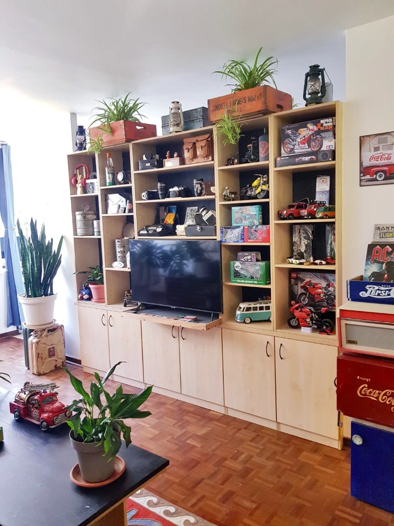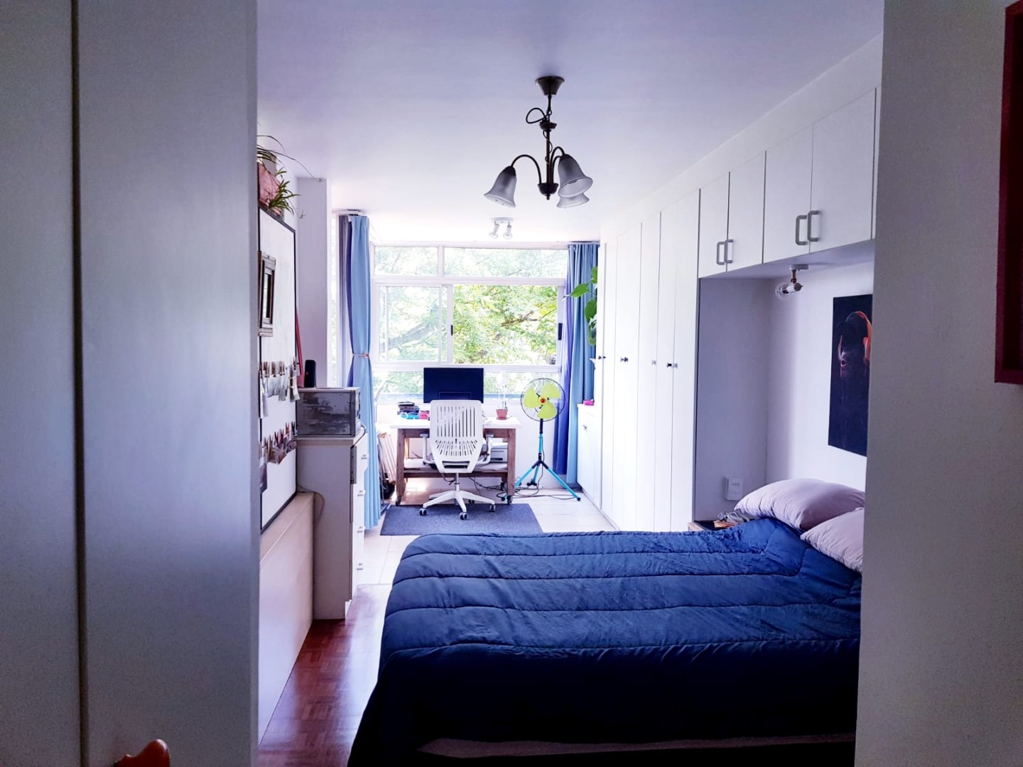 Your cozy bedroom offers a peaceful retreat, complete with a dedicated home office area / dressing room / enclosed balcony by a large window, giving you lovely green views while you work or relax. There's also plenty of built-in wardrobe storage to keep things neat and tidy, and the beautiful hardwood floors continue the warm, inviting feel. The apartment includes one well-appointed full bathroom with both a bath and shower.
