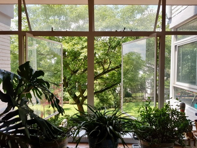 Your cozy bedroom offers a peaceful retreat, complete with a dedicated home office area / dressing room / enclosed balcony by a large window, giving you lovely green views while you work or relax. There's also plenty of built-in wardrobe storage to keep things neat and tidy, and the beautiful hardwood floors continue the warm, inviting feel. The apartment includes one well-appointed full bathroom with both a bath and shower.