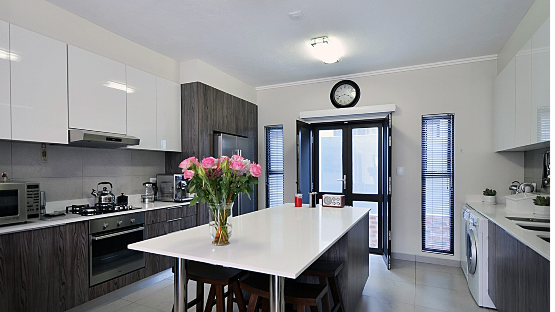 Living spaces are expansive and filled with natural light. The lounge and dining room open directly onto a large covered terrace fitted with a gas braai, creating a natural extension of the home and the perfect setting for hosting. The garden is private, green and easy to maintain, ideal for children, pets or simply enjoying time outside without high upkeep.