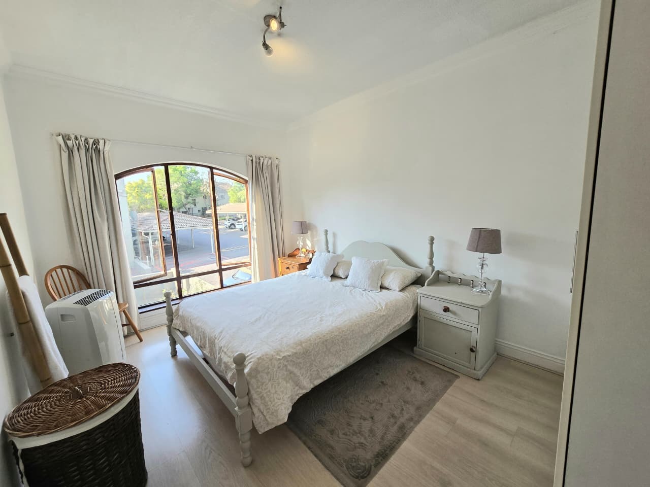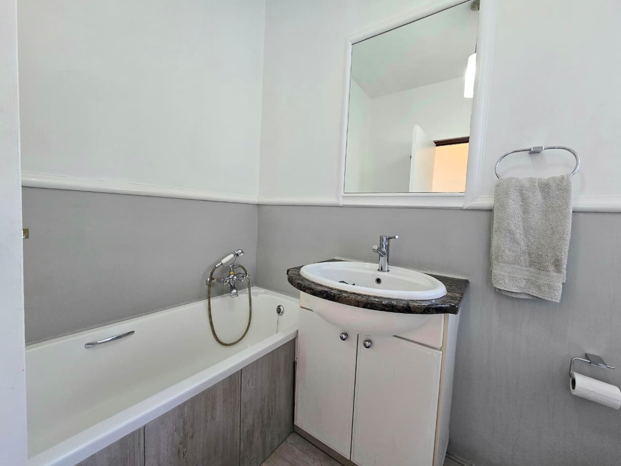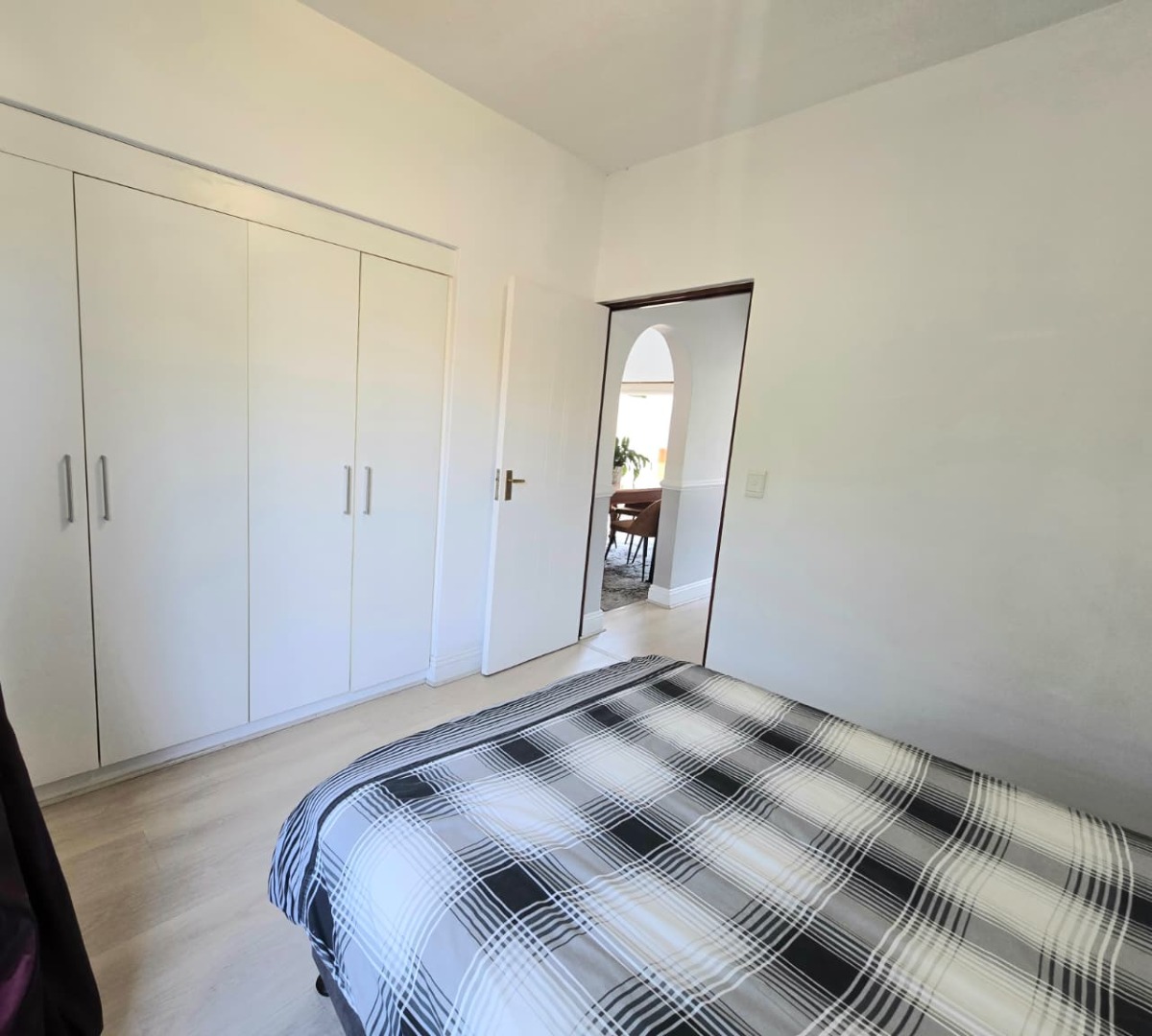 The two generously sized bedrooms, both featuring light-colored laminate flooring and plenty of natural light. The main bedroom even boasts a large arched window, adding a touch of character and brightness. There's also ample storage with built-in wardrobes, keeping everything neat and tidy. The bathroom is clean and functional, offering a shower, bathtub and a vanity, with natural light from a window.