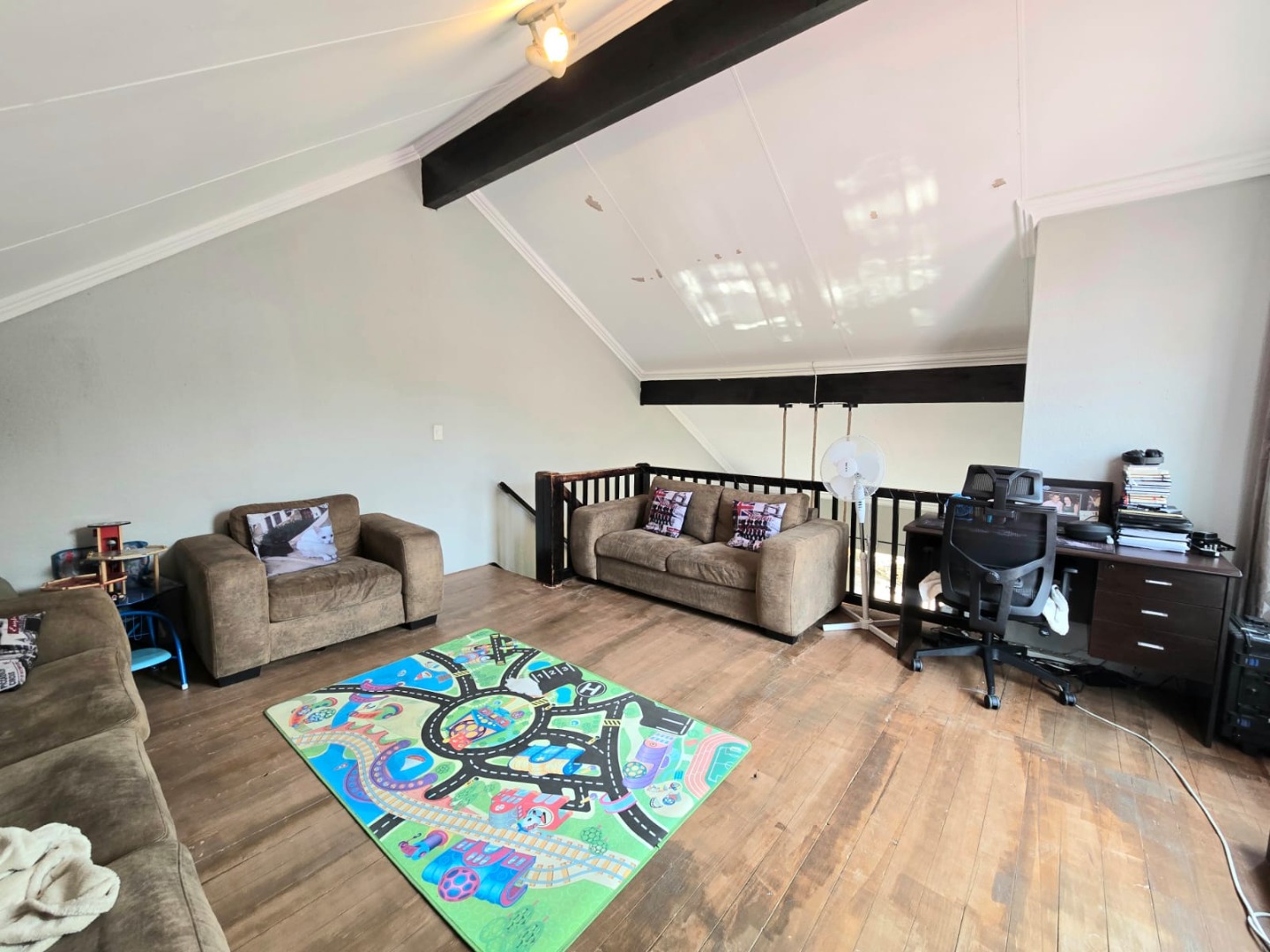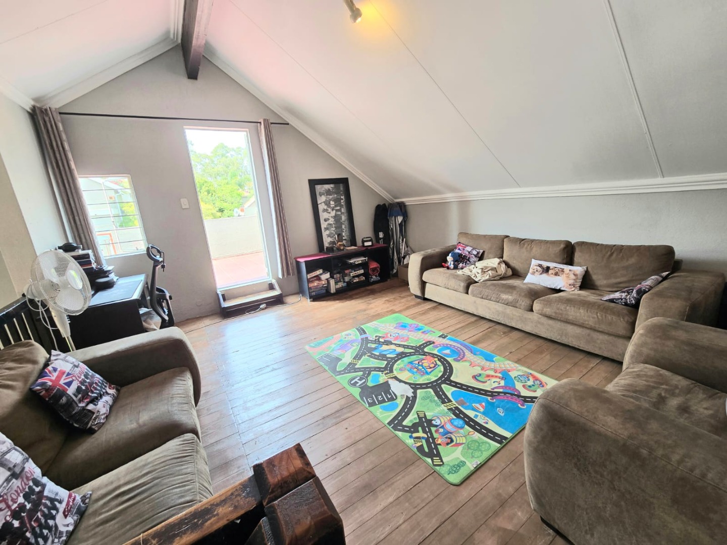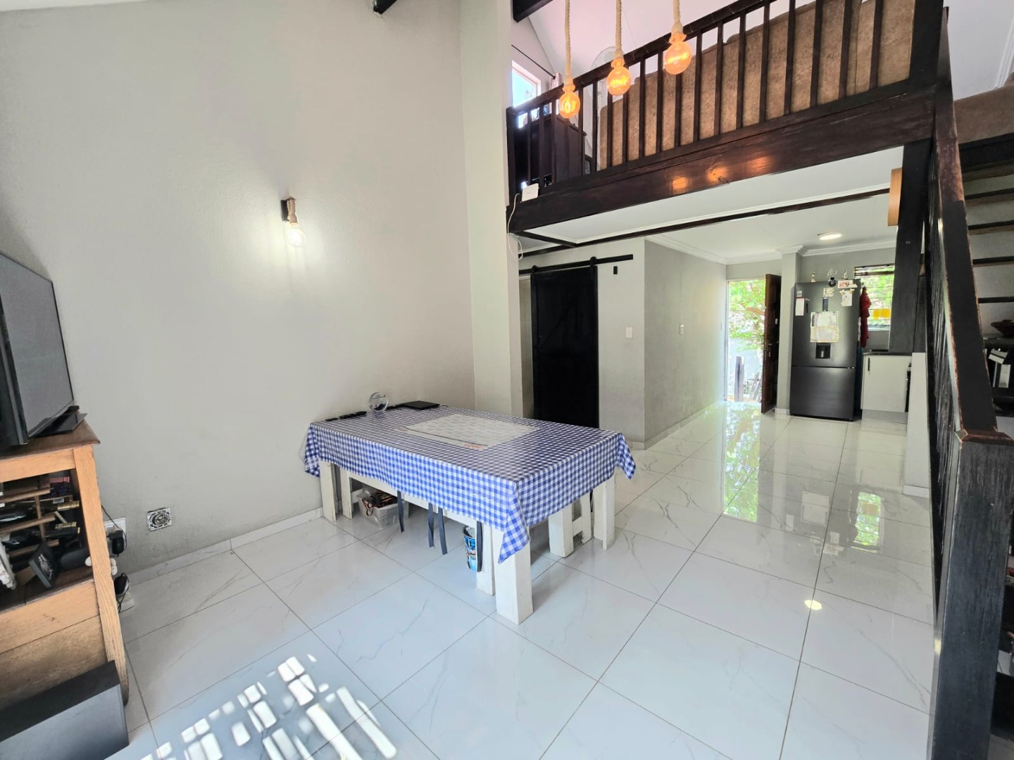 Step inside to discover a spacious open-plan living area flooded with natural light, complemented by a sleek, contemporary kitchen complete with a glass stove top. The spacious upstairs loft leads out to a generously sized balcony.