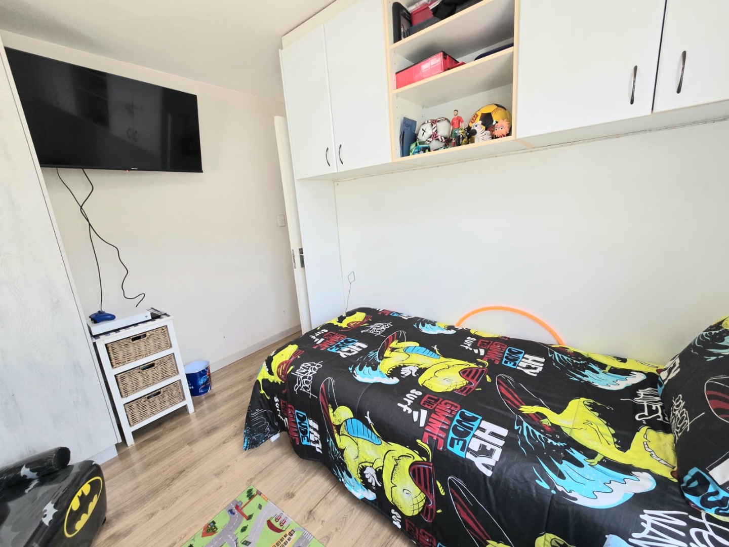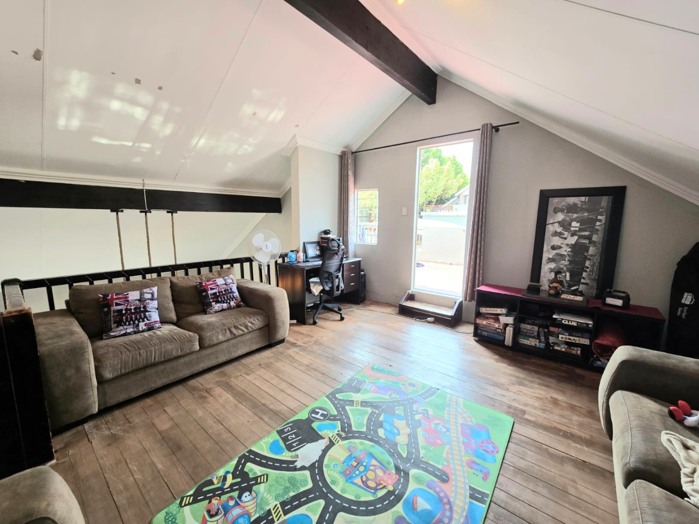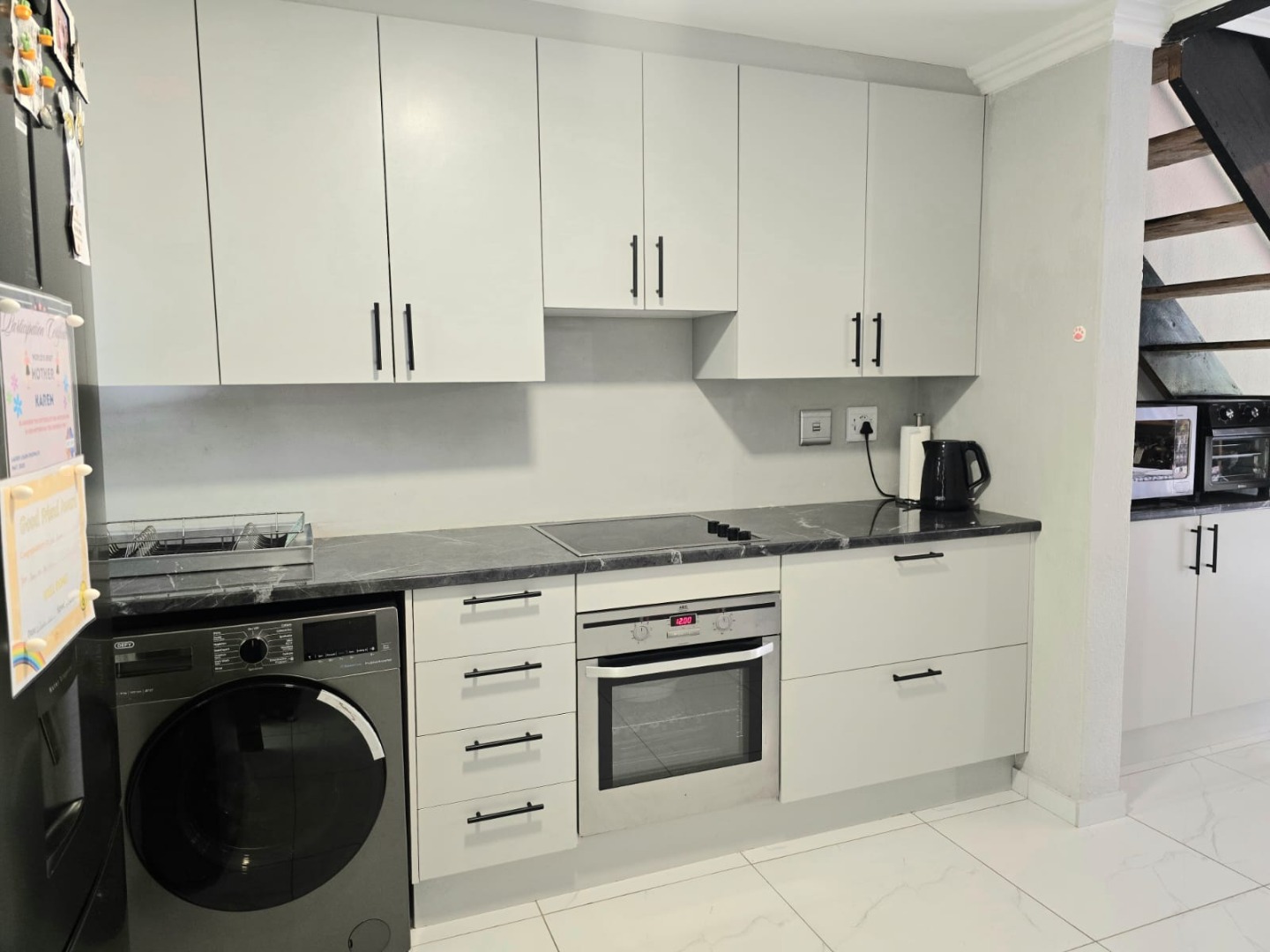Step inside to discover a spacious open-plan living area flooded with natural light, complemented by a sleek, contemporary kitchen complete with a glass stove top. The spacious upstairs loft leads out to a generously sized balcony.