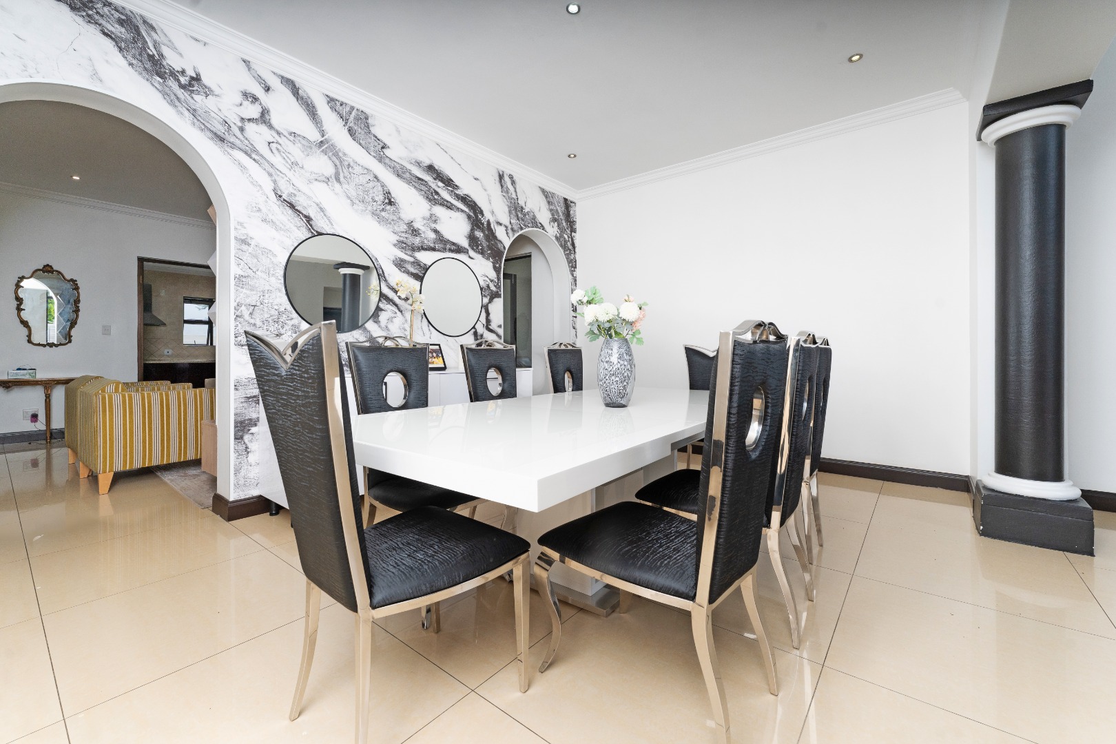 - Living Areas: There are three lounges and a dining room, some of which in similar properties may feature fireplaces. The dining room includes feature wallpaper throughout.