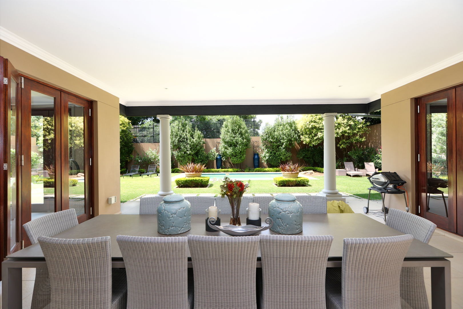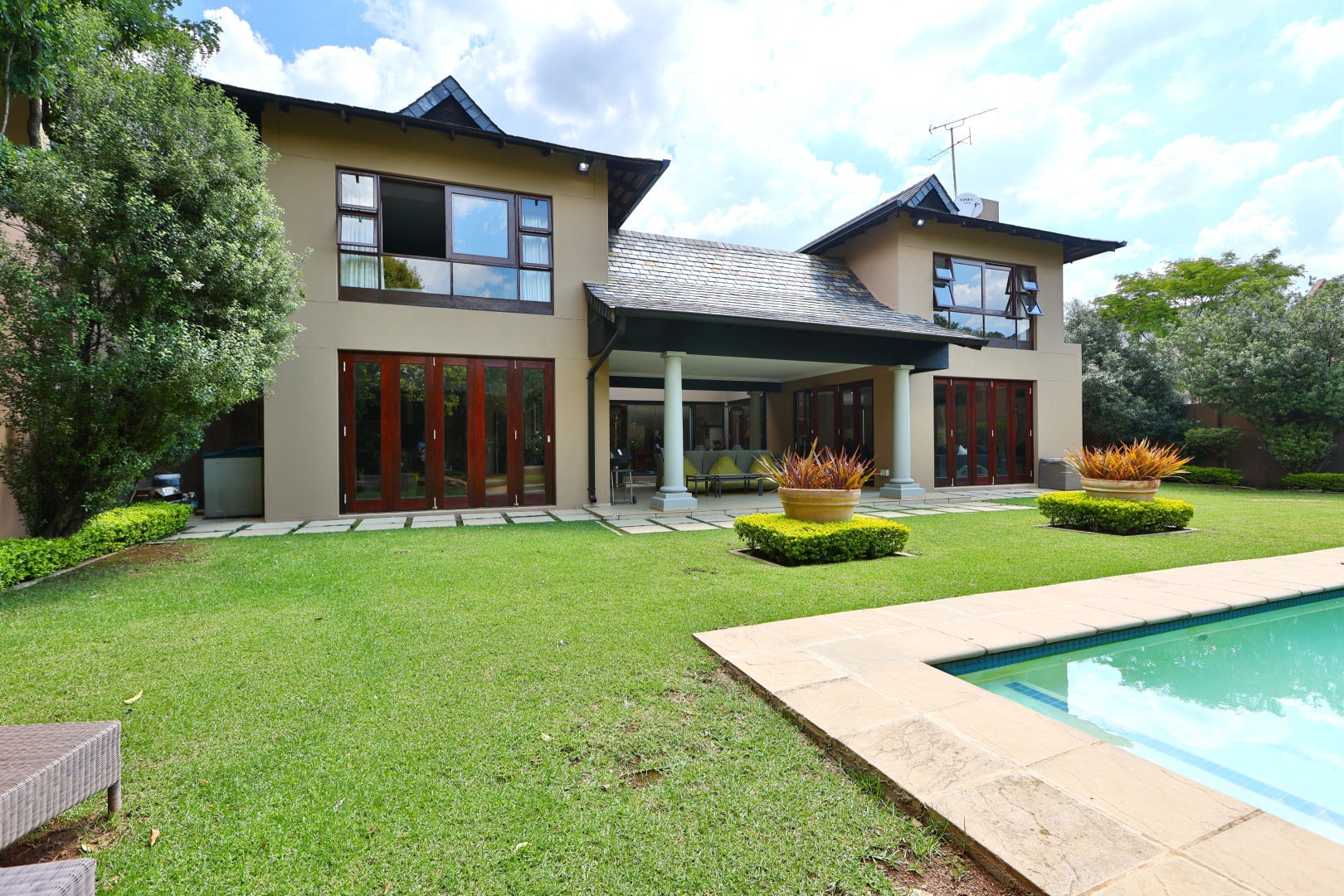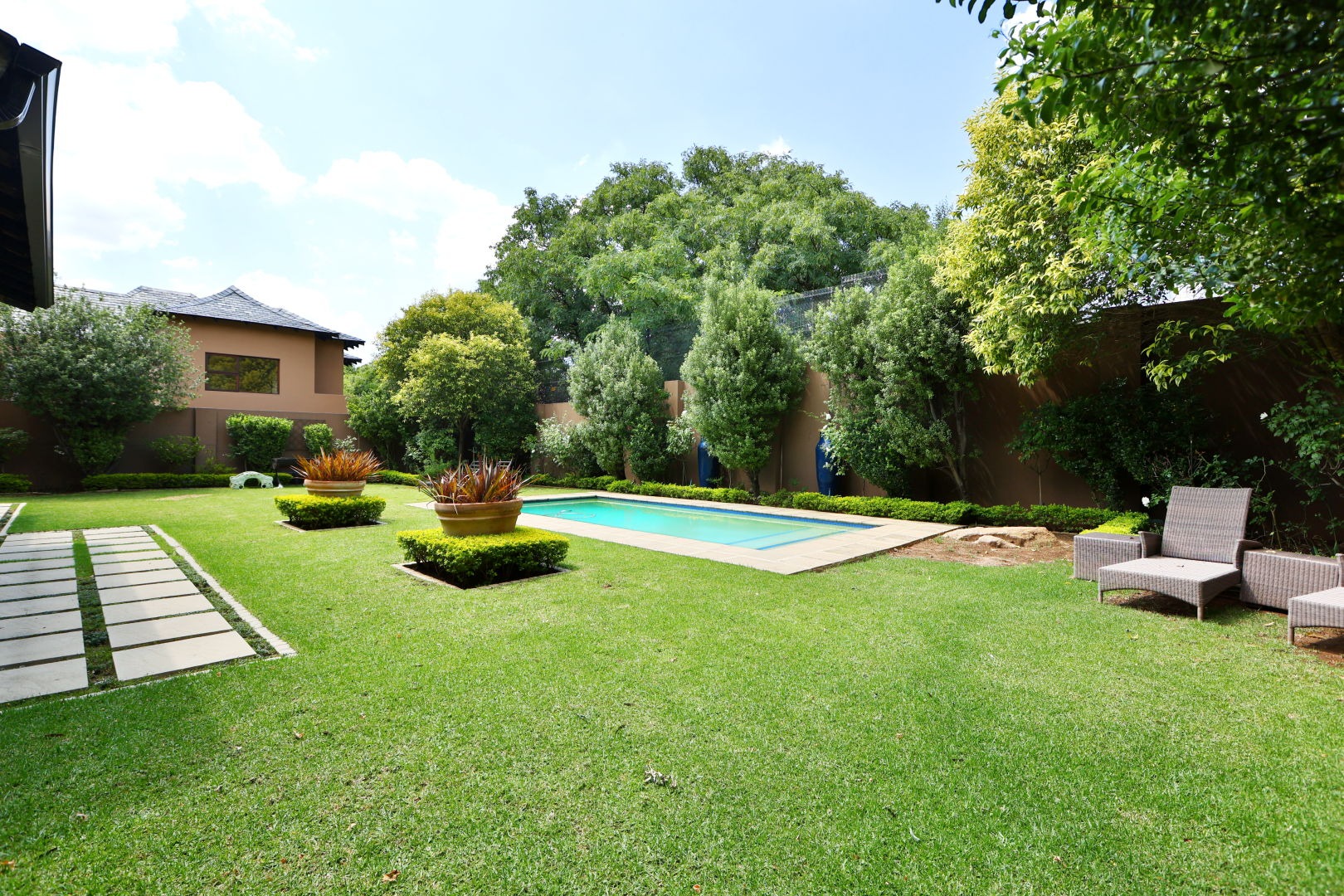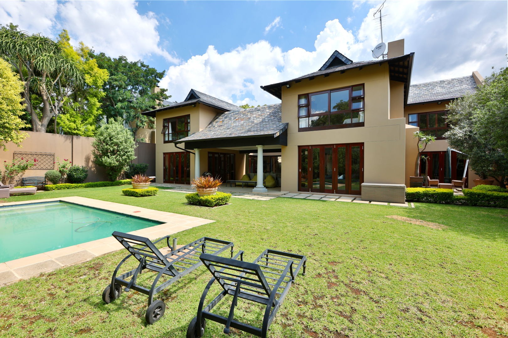 The landscaped garden wraps the home in greenery and frames a sparkling swimming pool, creating a serene outdoor sanctuary. A double garage provides secure parking and the property includes staff accommodation for additional convenience.