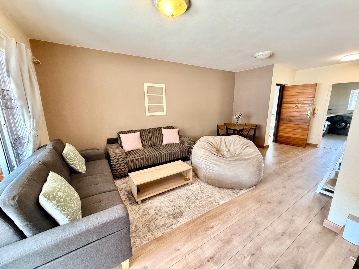 The interior boasts an intelligently designed open-plan layout, fostering a sense of spaciousness and connectivity throughout the principal living areas. A well-appointed kitchen seamlessly integrates with the dining and lounge spaces, creating an ideal setting for both relaxation and entertaining. Expansive sliding doors lead to a private balcony, offering picturesque scenic views and an integrated built-in braai, perfect for al fresco dining. The inclusion of a laminated living room further enhances the versatility of the living accommodation.