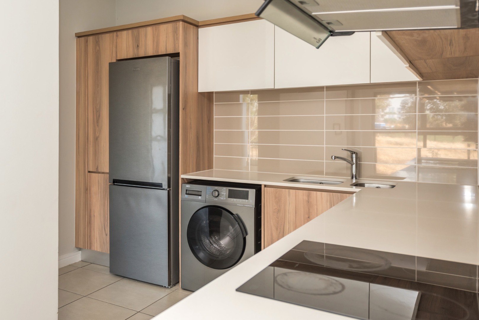 This 47m² apartment offers a well-designed layout with one bedroom and one bathroom featuring a modern shower and vanity. The open-plan kitchen flows into the lounge and out onto a covered balcony, perfect for relaxing or entertaining. The kitchen is fitted with Caesarstone countertops, an electric oven, hob, extractor fan, and comes with appliances included in the sale: a fridge, dishwasher, and washing machine/tumble dryer combo.