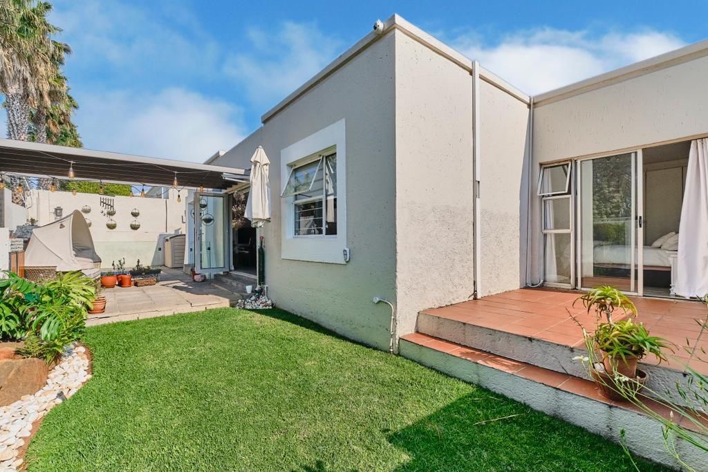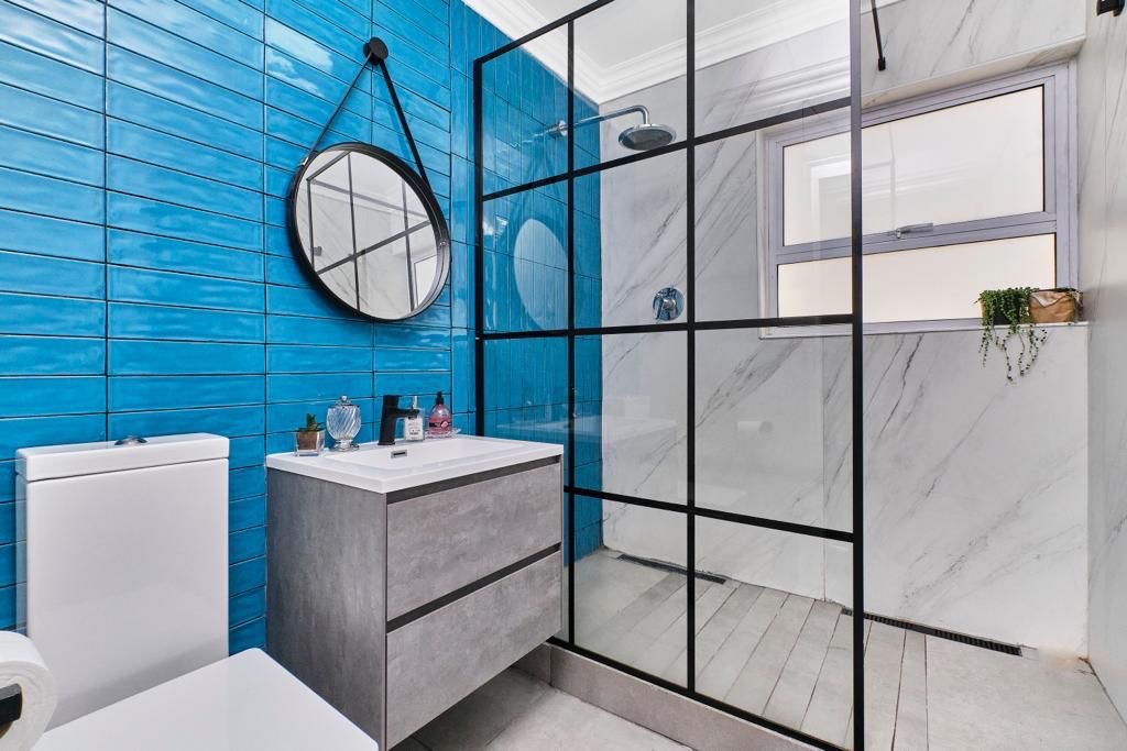 The home offers two well-proportioned bedrooms, each with built-in cupboards and air conditioning. The bathrooms have been stylishly modernised, with the guest bathroom featuring a striking walk-in shower enclosed in black matte steel-framed glass, complemented by a rainfall showerhead and industrial-style detailing. The main en-suite continues the theme, with access from the bedroom to a private patio ideal for quiet moments outdoors.
