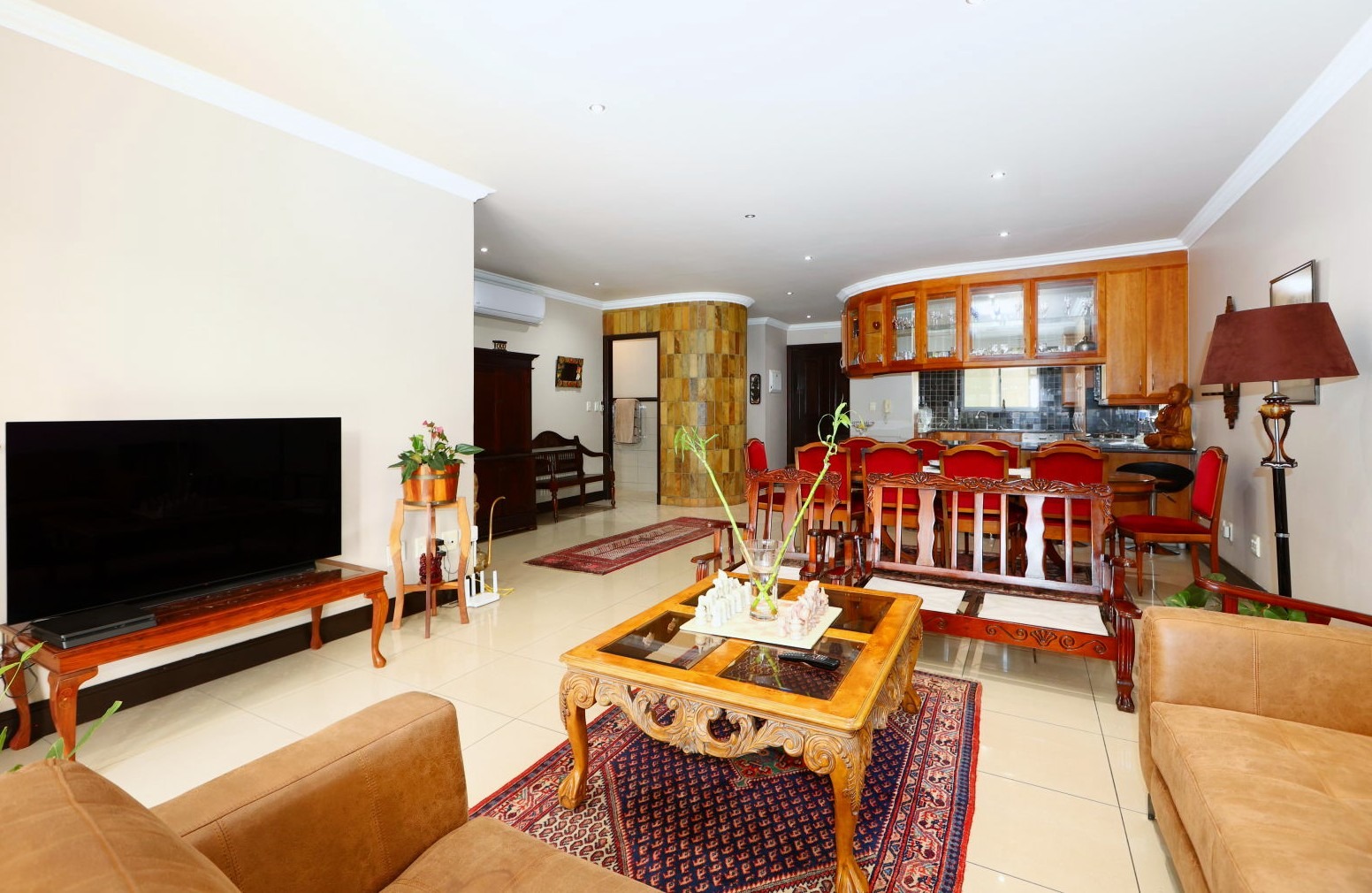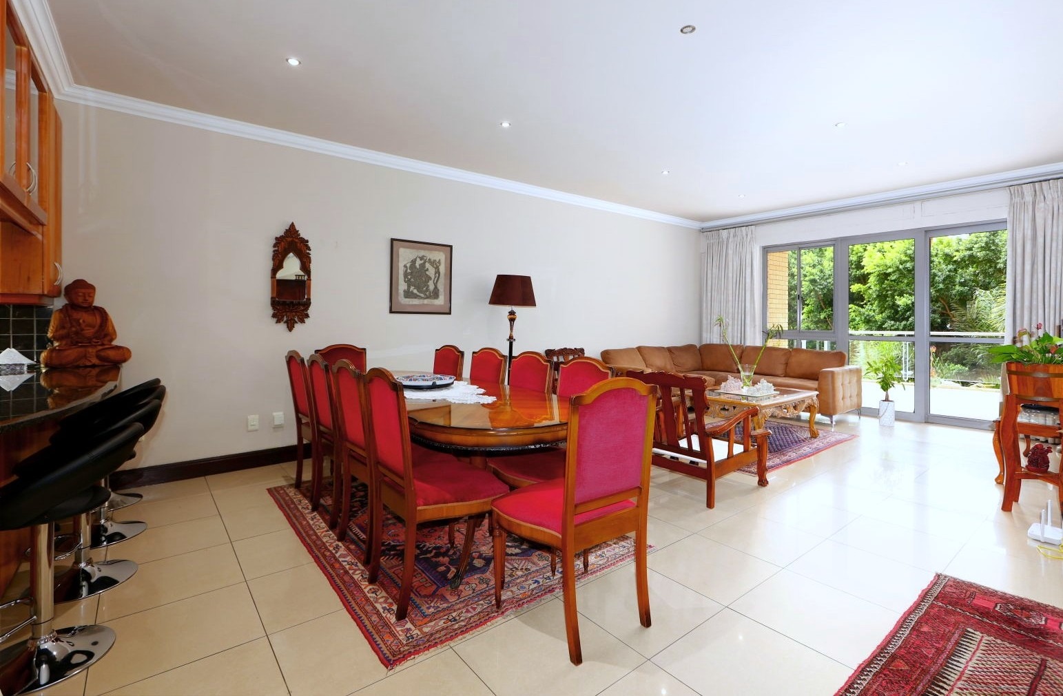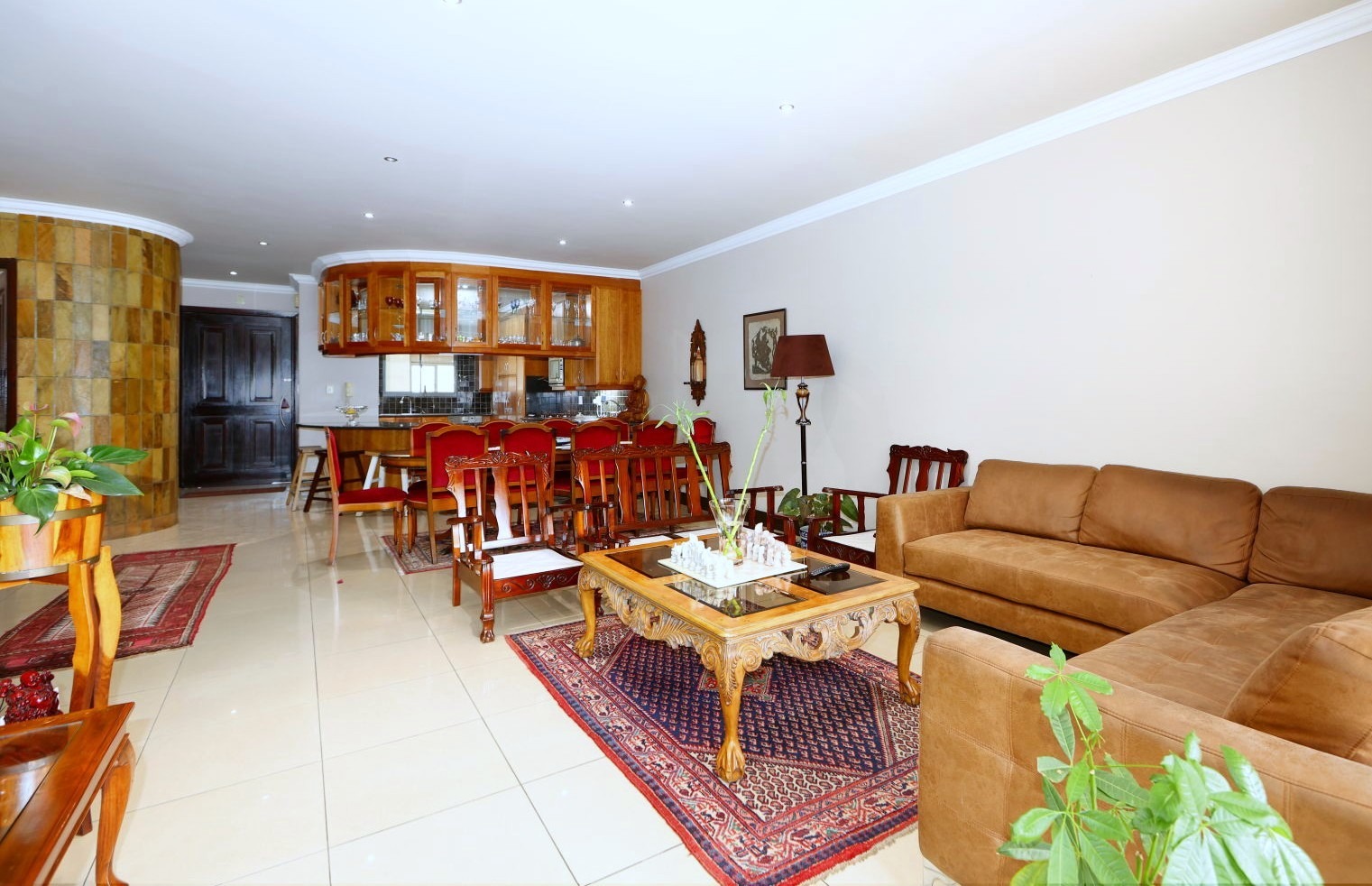 The interior boasts an elegant open-plan design, seamlessly integrating the spacious lounge area with a contemporary kitchen with integrated Miele appliances and a Gas hob, complete with a dedicated pantry. This thoughtful layout is conducive to both relaxed living and sophisticated entertaining. Residents will appreciate the inclusion of air conditioning for optimal climate control and the private balconies, offering an inviting space for relaxation and outdoor enjoyment. A convenient guest toilet further enhances the functionality of this exquisite home. Other features include a central vacuum system, a gas geyser and automated roller shutters.