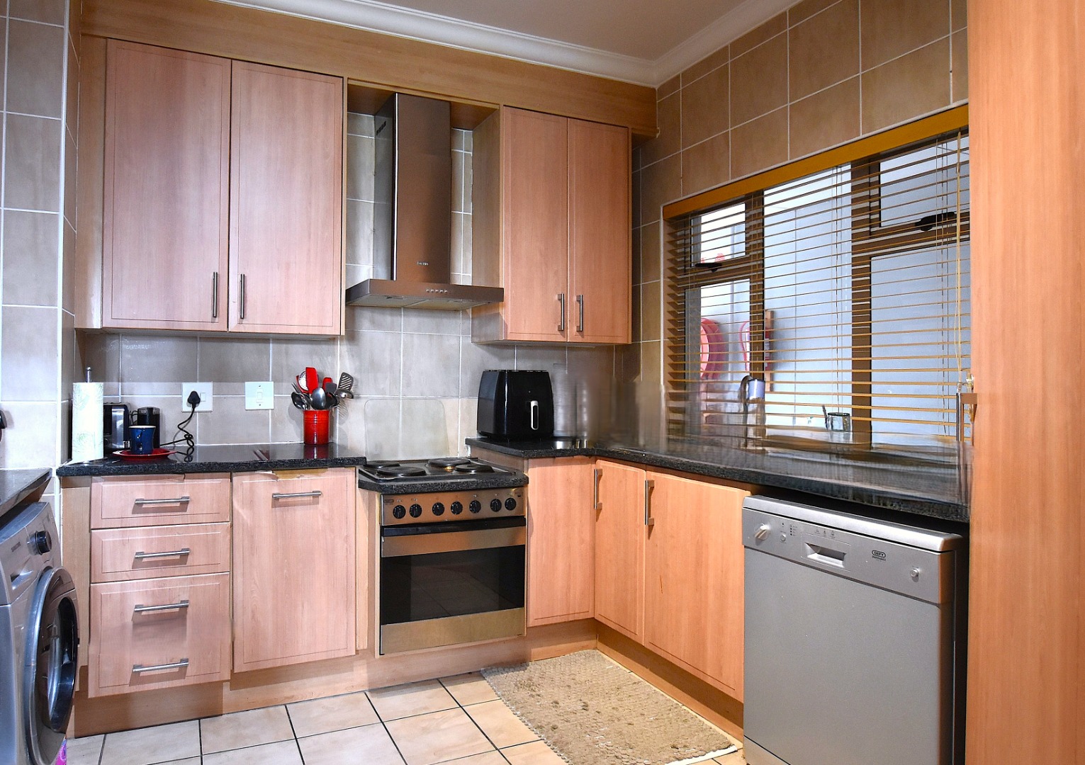 The kitchen is well-appointed with ample counter space, pantry, space for 3 appliances as well as oven, electric hob, extractor fan, all set on durable tiled flooring.