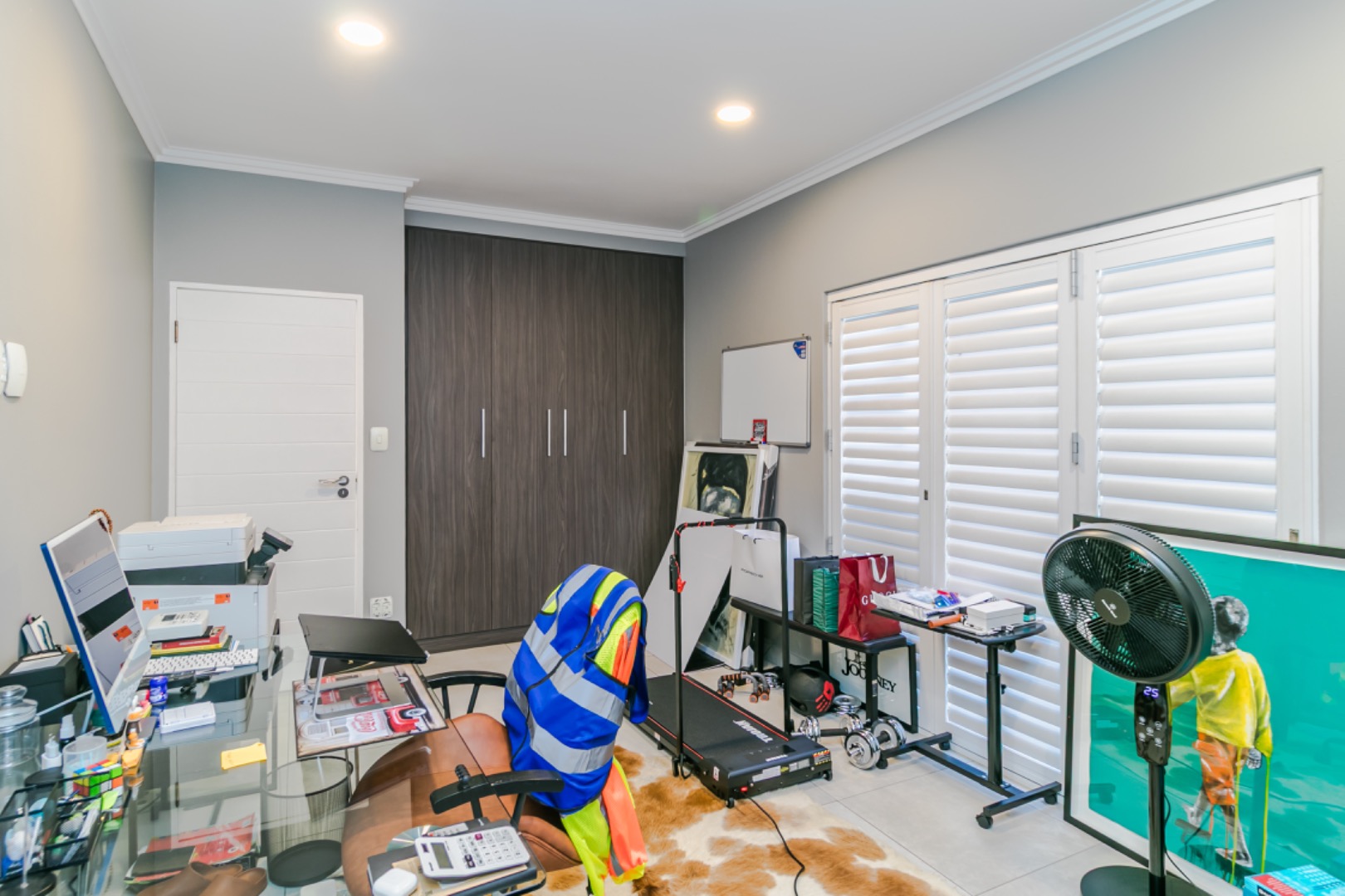 Contemporary finishes, abundant natural light filtered through stylish plantation shutters, recessed lighting, and air conditioning units create a pleasant atmosphere throughout the residence. A conveniently located guest toilet and dedicated staff quarters enhance the home's practicality.