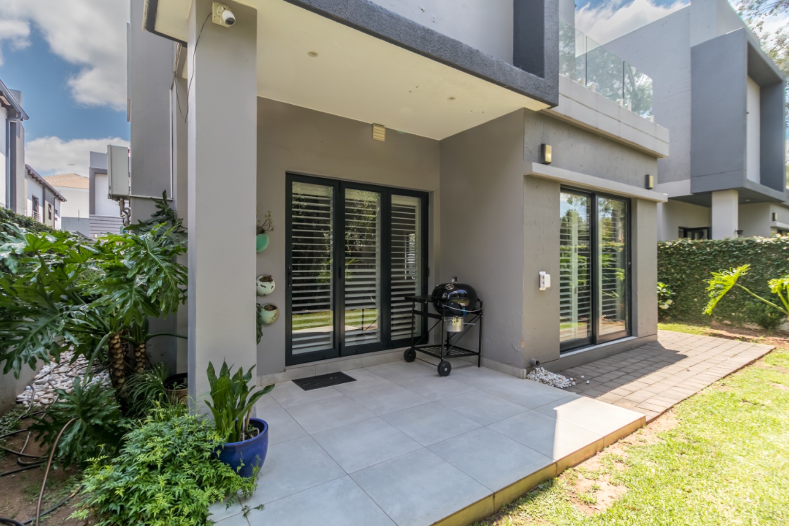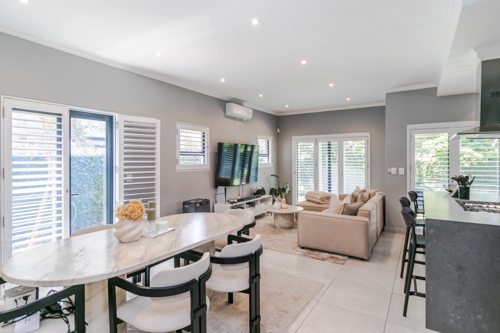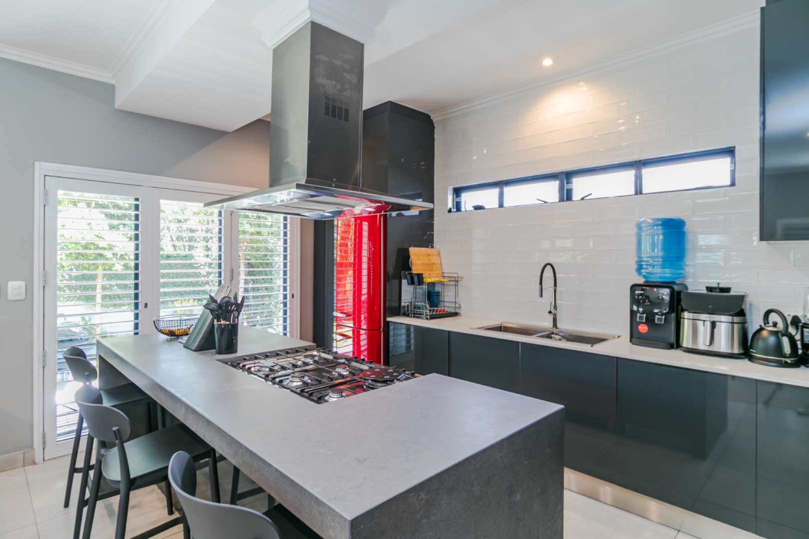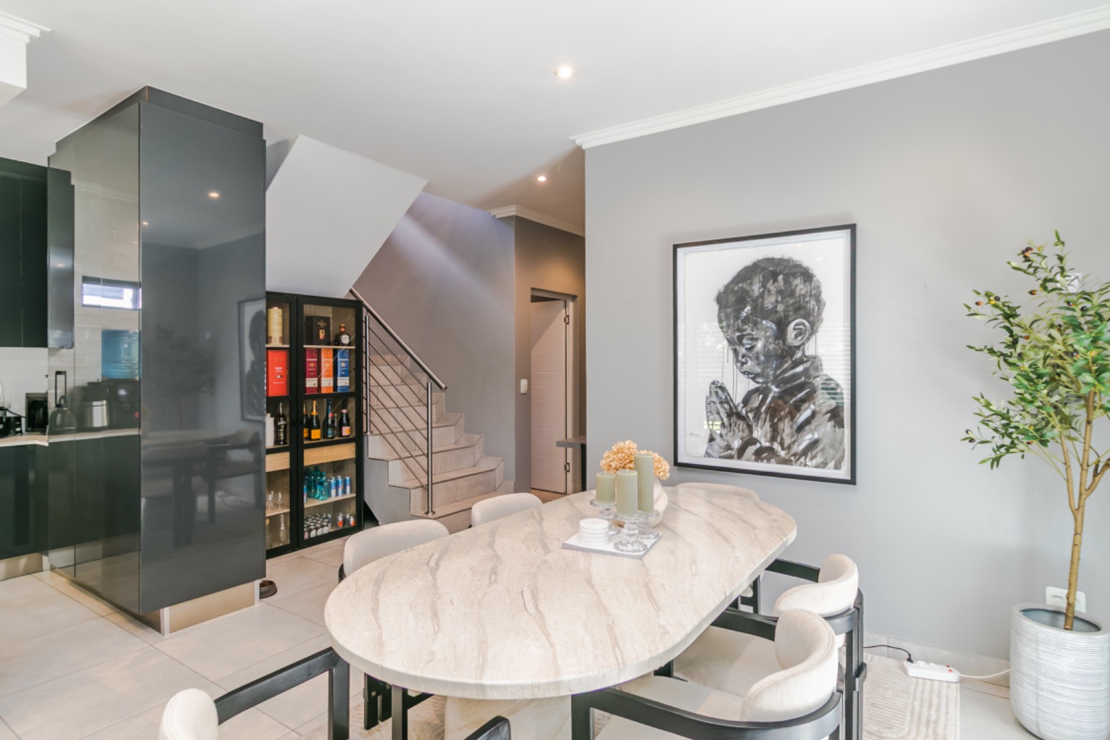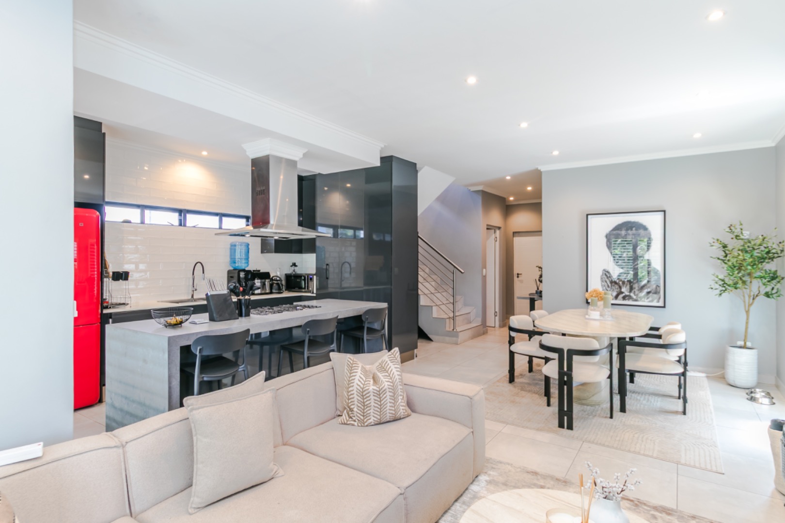 Experience contemporary elegance in this stunning 3-bedroom, 3.5-bathroom home, perfectly situated within a secure enclave in Petervale, Sandton. Covering 224 sqm of living space on a 242 sqm erf, this residence features a welcoming open-plan design that harmoniously integrates the modern kitchen, dining space, and a generous lounge. The sophisticated kitchen is adorned with dark high-gloss cabinetry, chic white subway tiles, a spacious island equipped with an integrated gas hob, and a striking red Smeg refrigerator, making it an ideal setting for culinary aficionados and social gatherings.