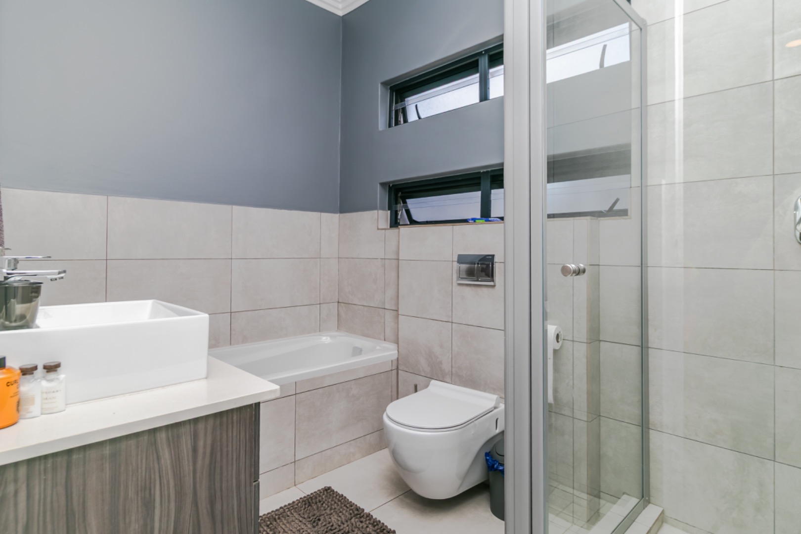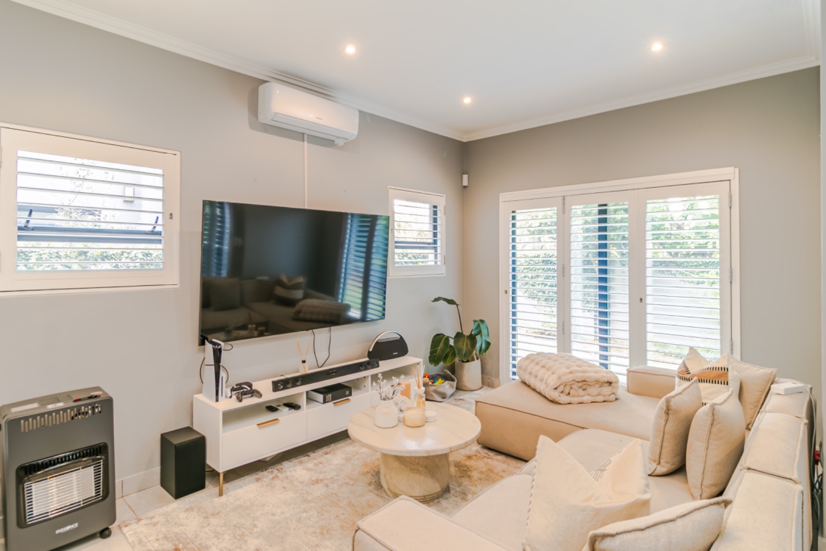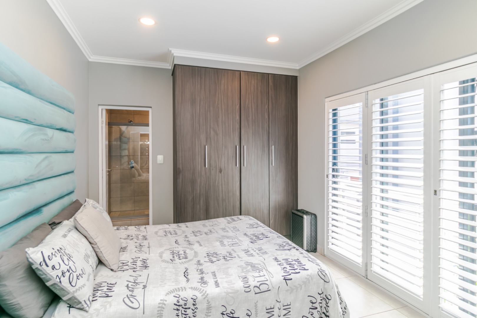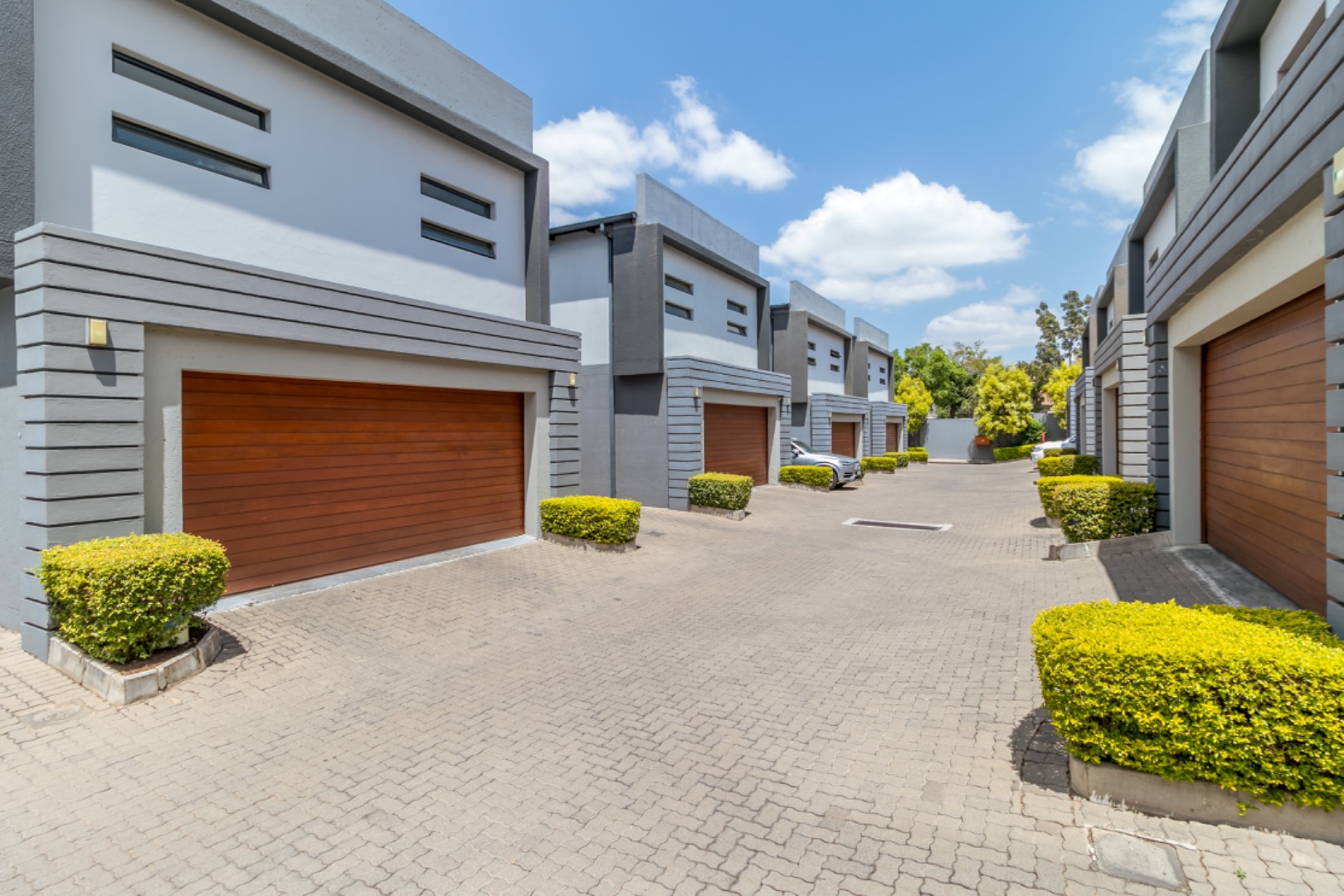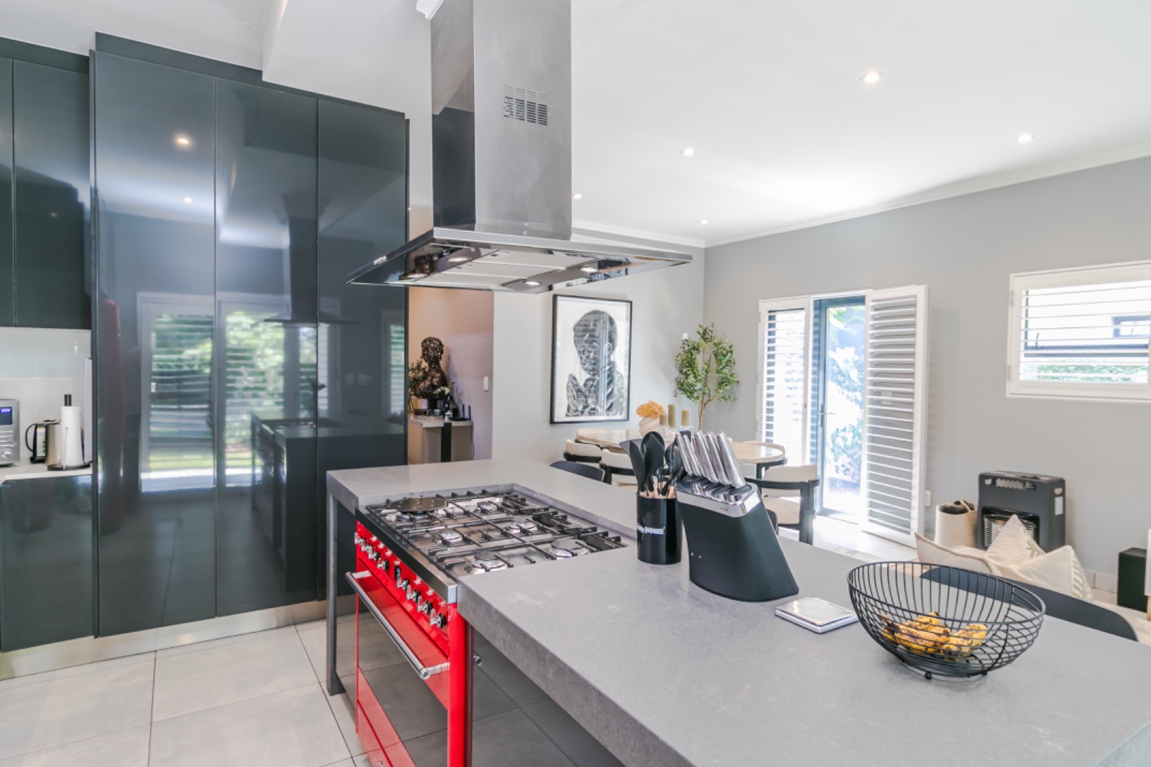 Experience contemporary elegance in this stunning 3-bedroom, 3.5-bathroom home, perfectly situated within a secure enclave in Petervale, Sandton. Covering 224 sqm of living space on a 242 sqm erf, this residence features a welcoming open-plan design that harmoniously integrates the modern kitchen, dining space, and a generous lounge. The sophisticated kitchen is adorned with dark high-gloss cabinetry, chic white subway tiles, a spacious island equipped with an integrated gas hob, and a striking red Smeg refrigerator, making it an ideal setting for culinary aficionados and social gatherings.