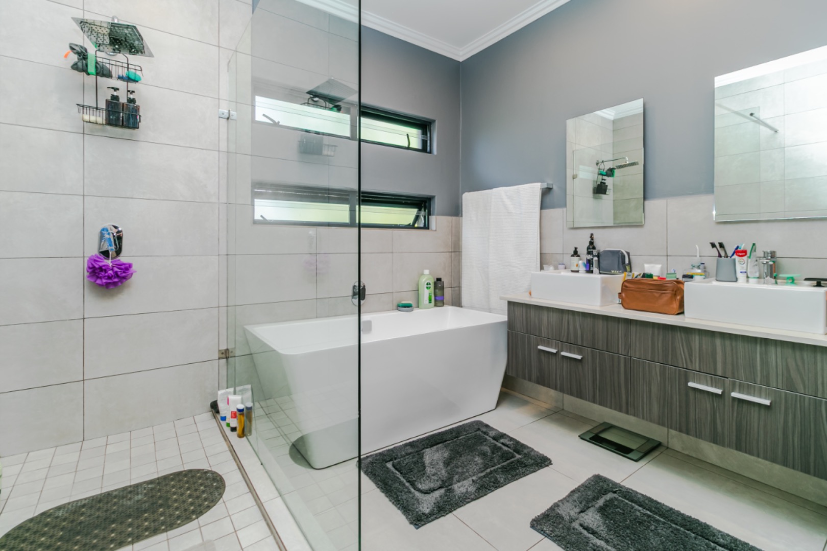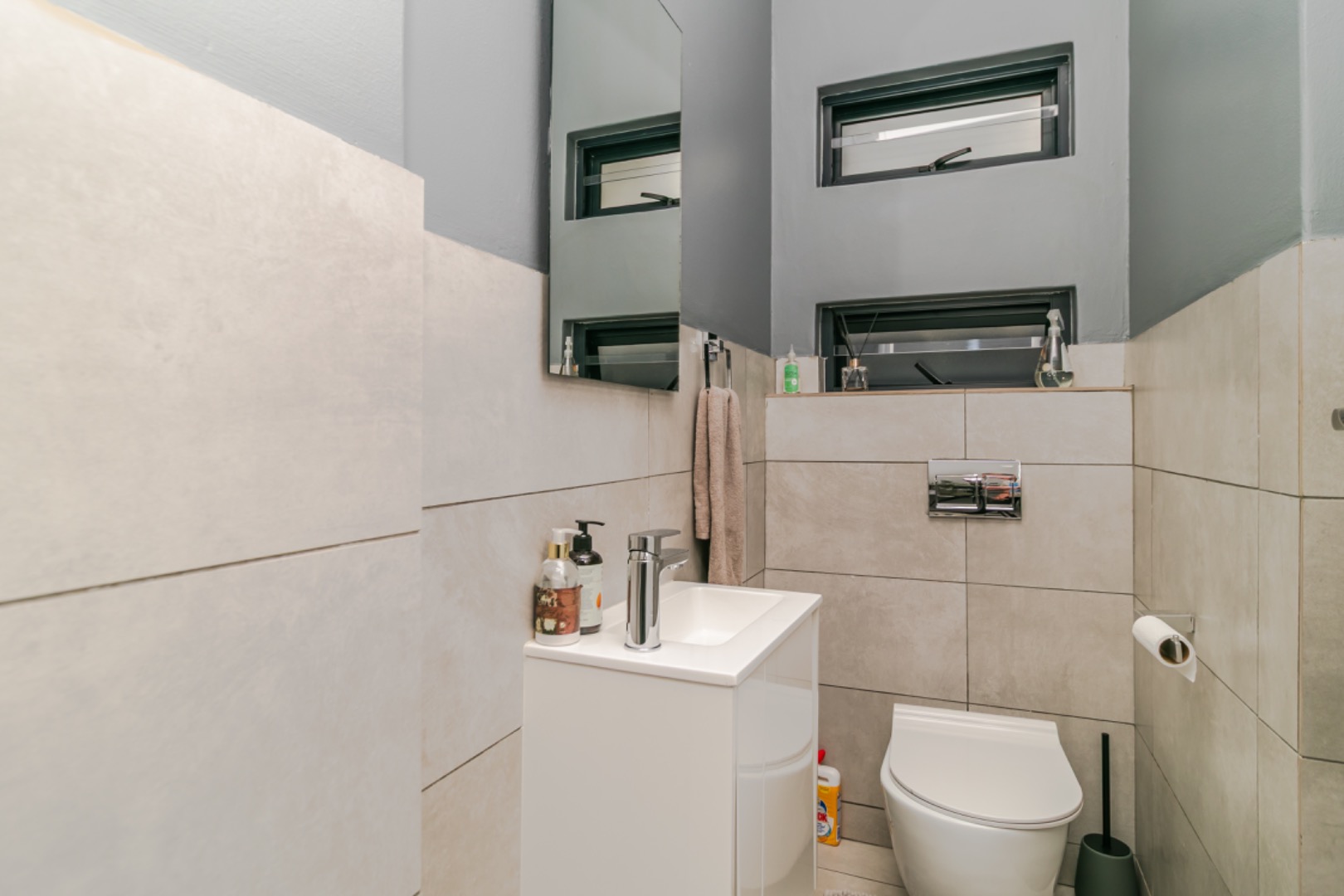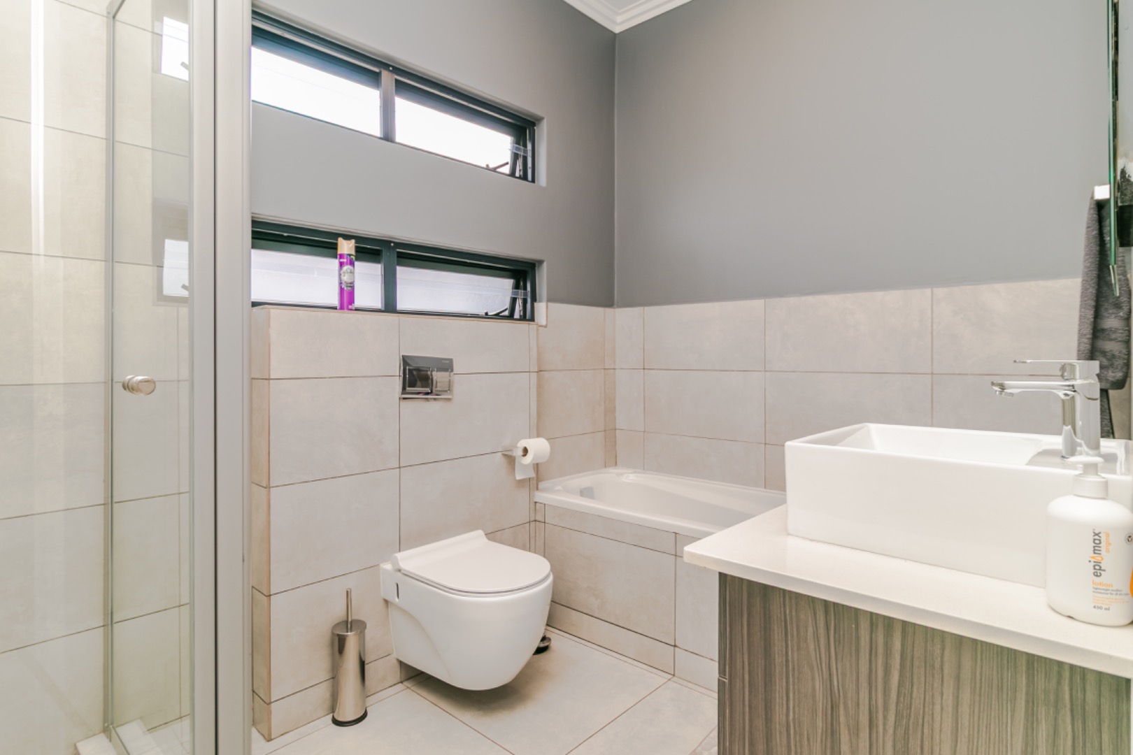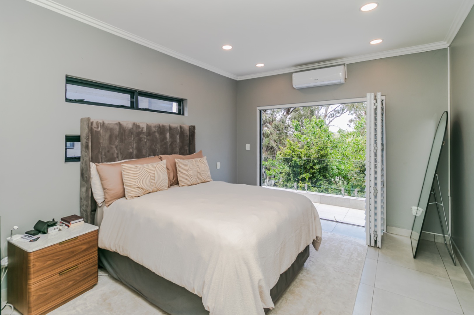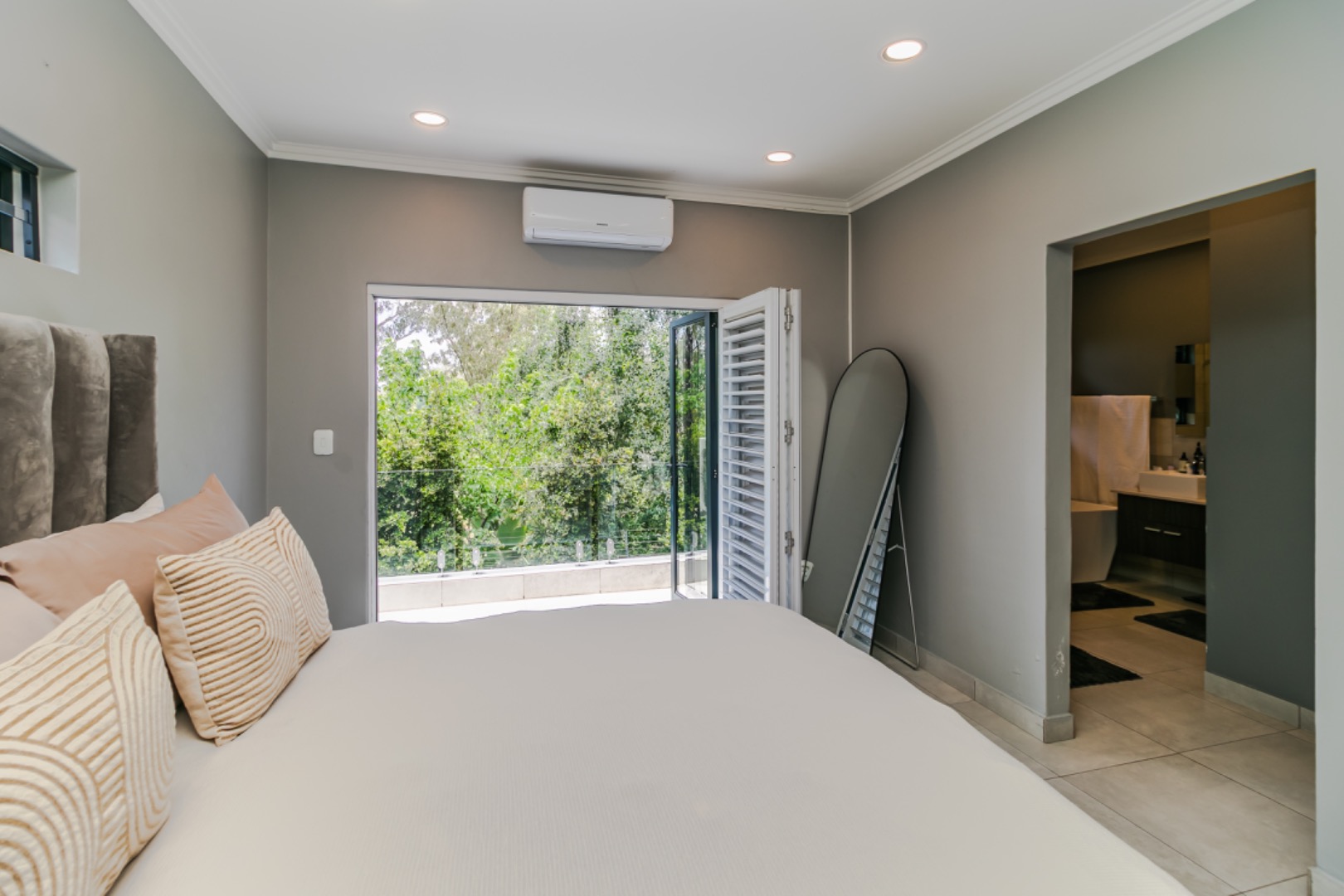 Experience contemporary elegance in this stunning 3-bedroom, 3.5-bathroom home, perfectly situated within a secure enclave in Petervale, Sandton. Covering 224 sqm of living space on a 242 sqm erf, this residence features a welcoming open-plan design that harmoniously integrates the modern kitchen, dining space, and a generous lounge. The sophisticated kitchen is adorned with dark high-gloss cabinetry, chic white subway tiles, a spacious island equipped with an integrated gas hob, and a striking red Smeg refrigerator, making it an ideal setting for culinary aficionados and social gatherings.