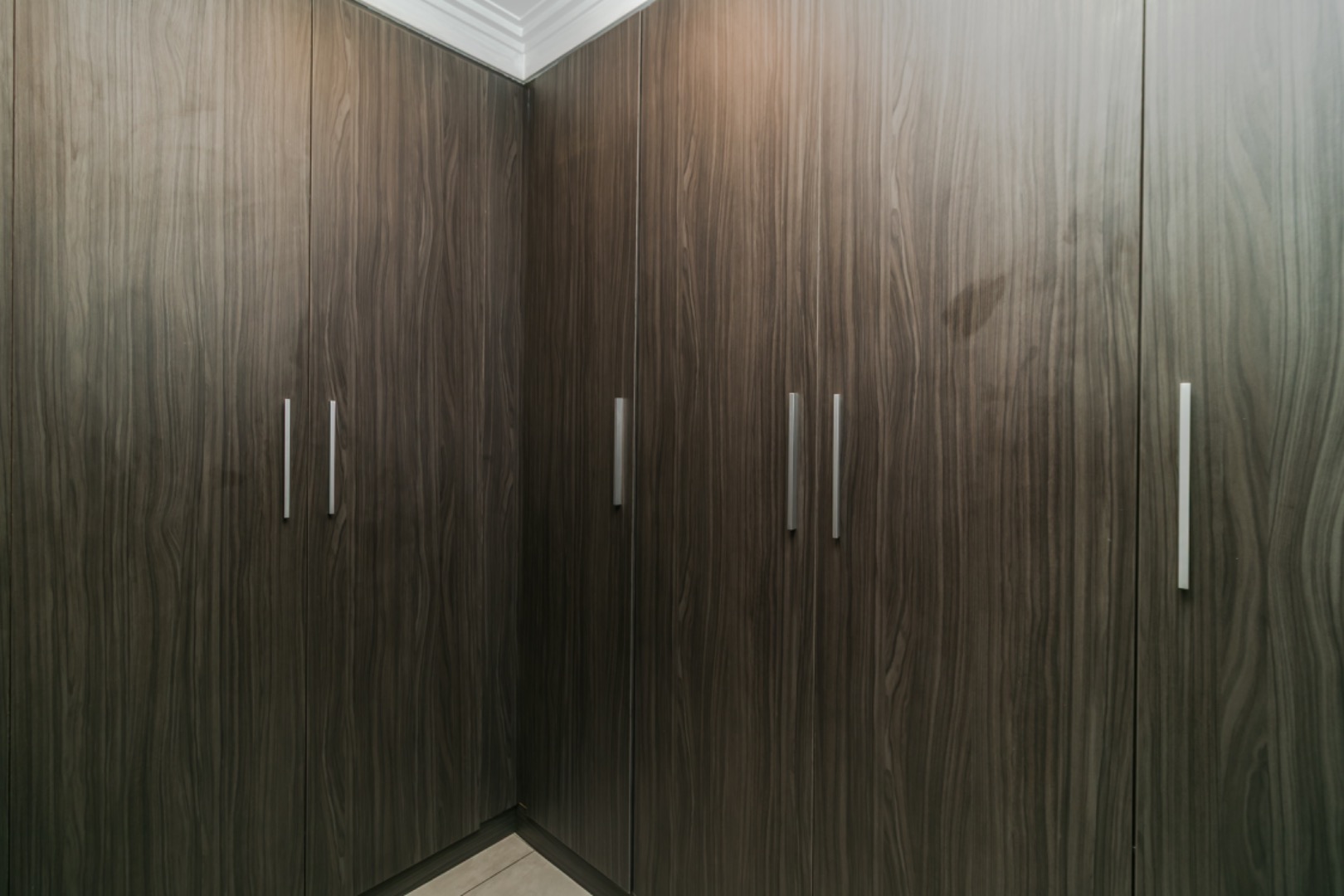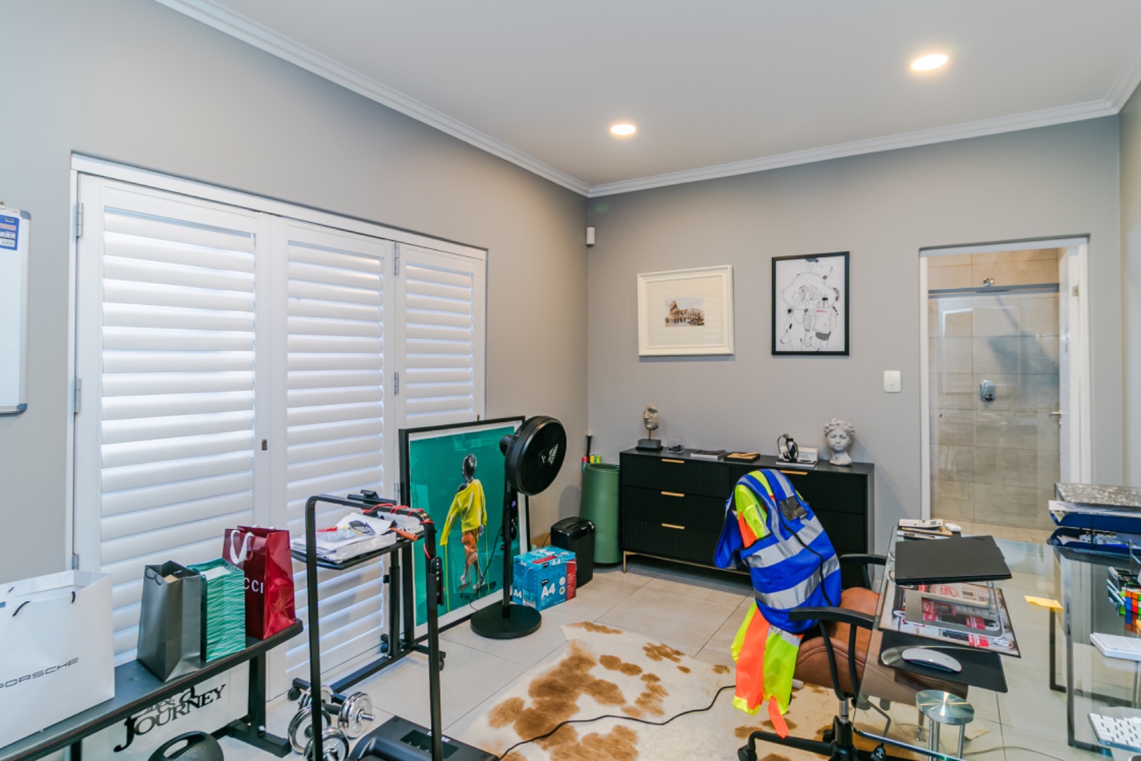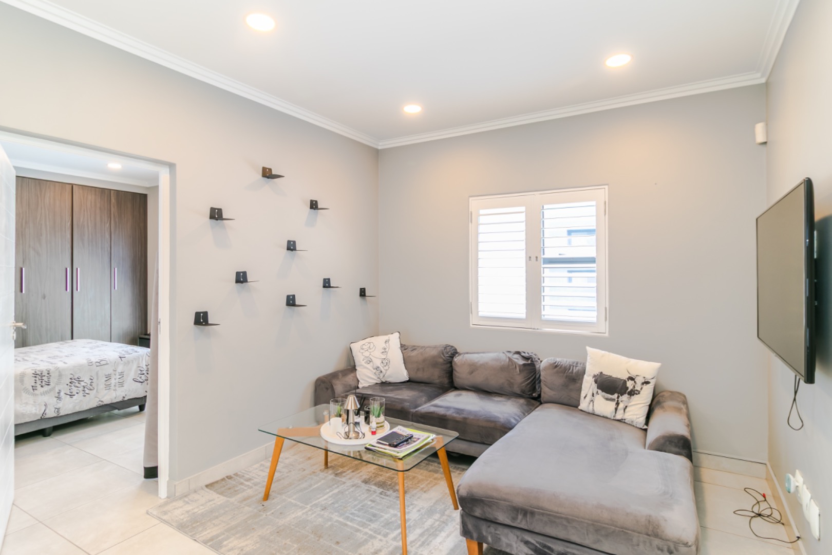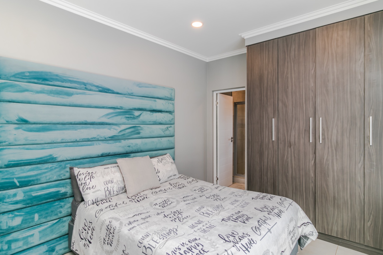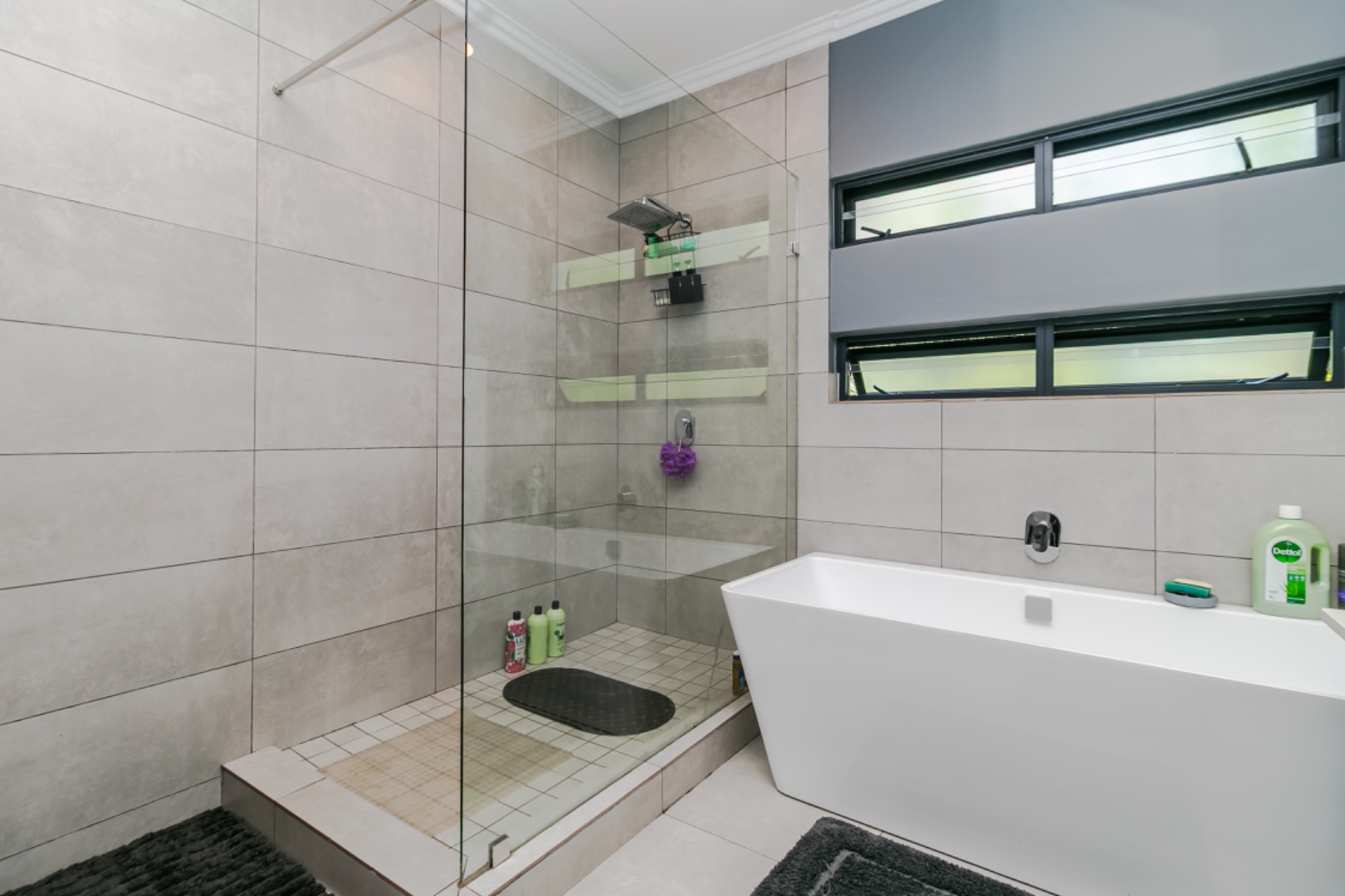 Experience contemporary elegance in this stunning 3-bedroom, 3.5-bathroom home, perfectly situated within a secure enclave in Petervale, Sandton. Covering 224 sqm of living space on a 242 sqm erf, this residence features a welcoming open-plan design that harmoniously integrates the modern kitchen, dining space, and a generous lounge. The sophisticated kitchen is adorned with dark high-gloss cabinetry, chic white subway tiles, a spacious island equipped with an integrated gas hob, and a striking red Smeg refrigerator, making it an ideal setting for culinary aficionados and social gatherings.