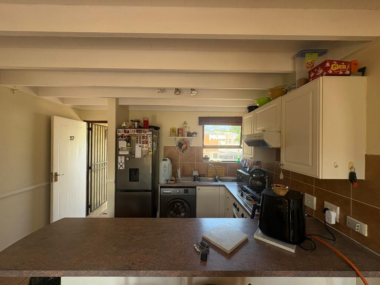 Discover this inviting 1.5-bedroom loft apartment right in time for summer, offering comfort and functionality within a secure complex. The open-plan living area seamlessly integrates the lounge, dining space, and kitchen. High vaulted ceilings with exposed beams enhance the sense of space, complemented by durable tiled flooring throughout these main areas. Natural light streams in through a large arched window and glass doors. A prominent wooden staircase leads to a versatile mezzanine level, ideal for a study or additional living space. The functional kitchen features ample white cabinetry, a breakfast bar, and dedicated appliance space.