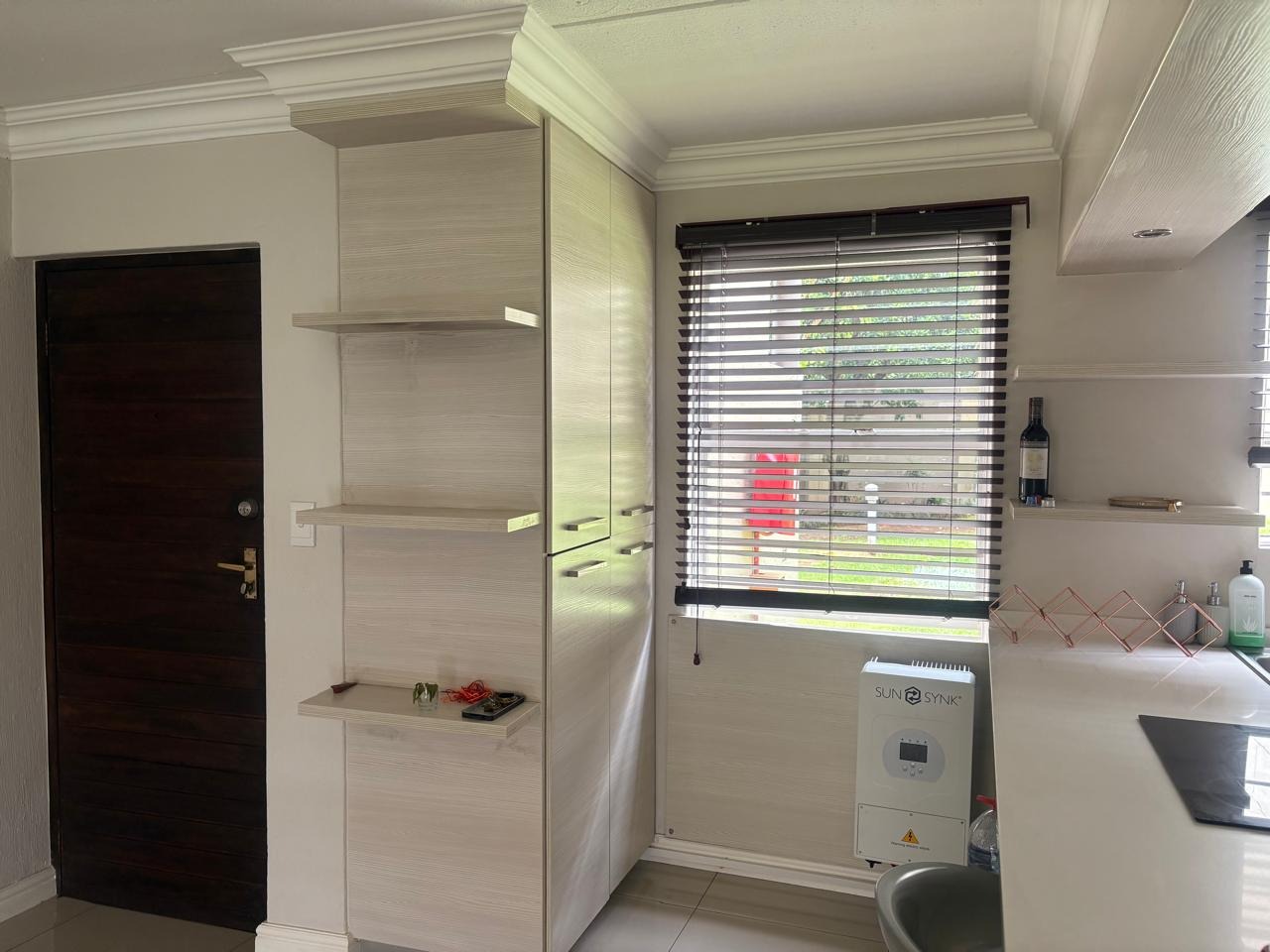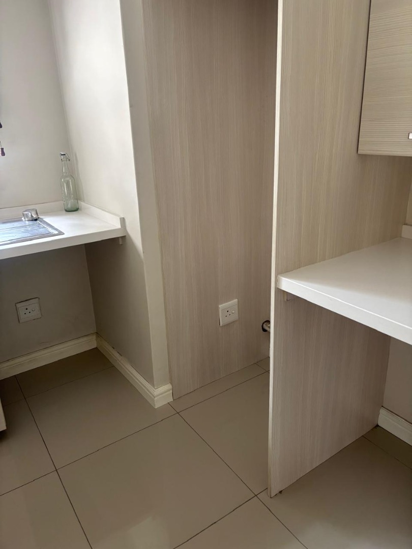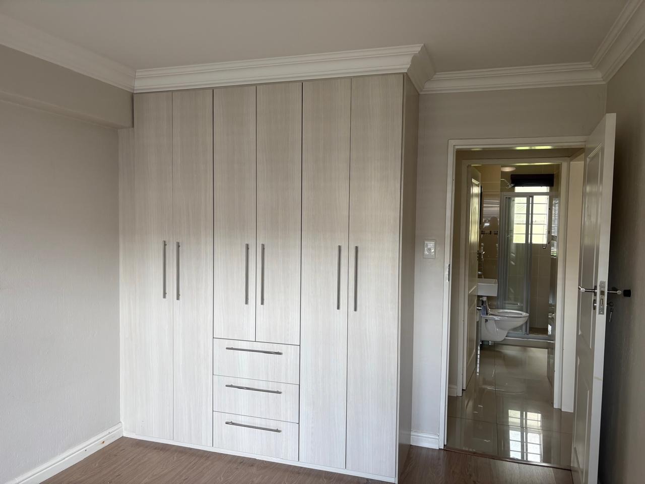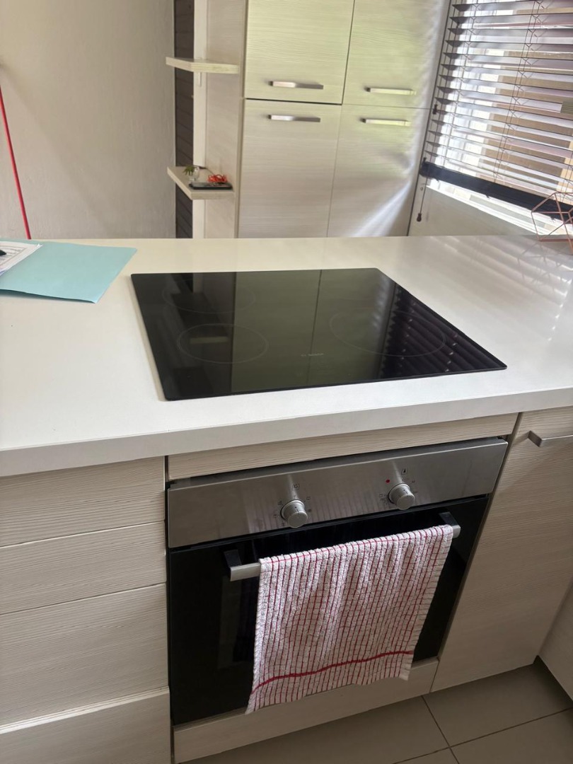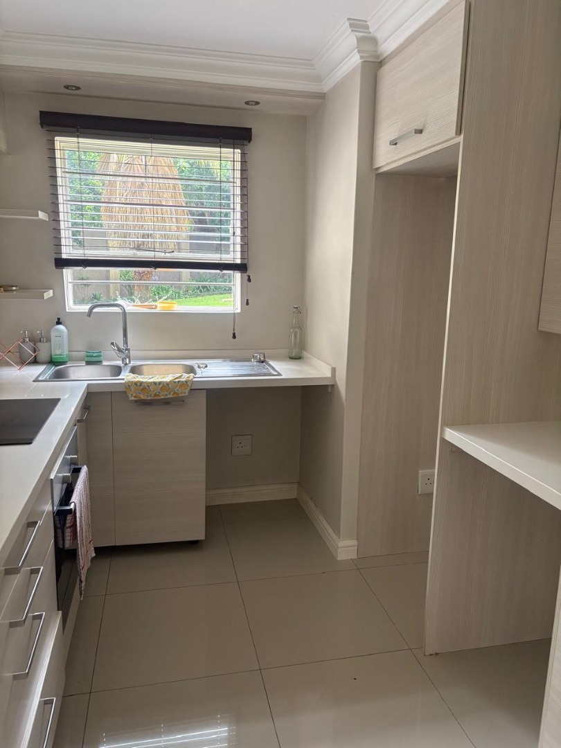 Discover modern living in this stylish 84 sqm apartment, ideally situated within a secure estate in Sandton Central. The interior boasts an open-plan layout, featuring contemporary tiled flooring and neutral-toned walls throughout the living areas. The kitchen is a highlight, equipped with sleek light wood-grain cabinetry, pristine white Caesarstone countertops, a built-in extractor fan, hob and oven - that can also be used during loadshedding, and a practical dual sink. Recessed lighting adds a refined touch, while a breakfast bar with 2 stools, seamlessly connects to the lounge, which offers direct access to a private covered patio through a glass door, perfect for relaxation or entertaining.