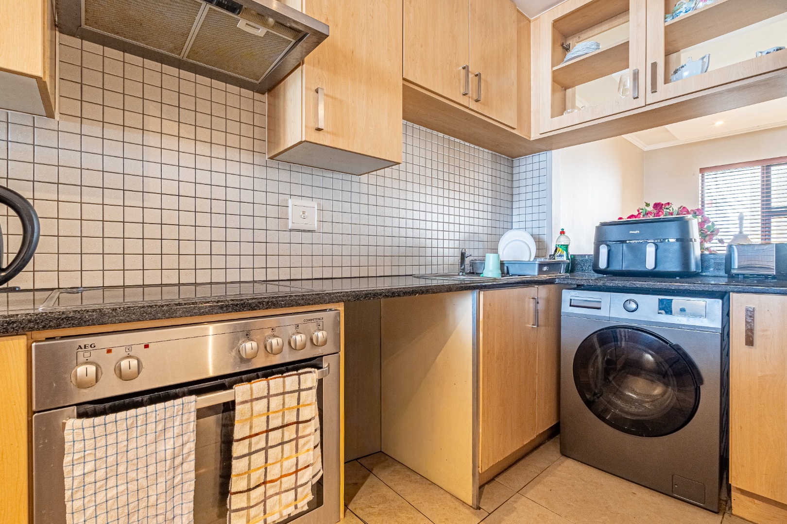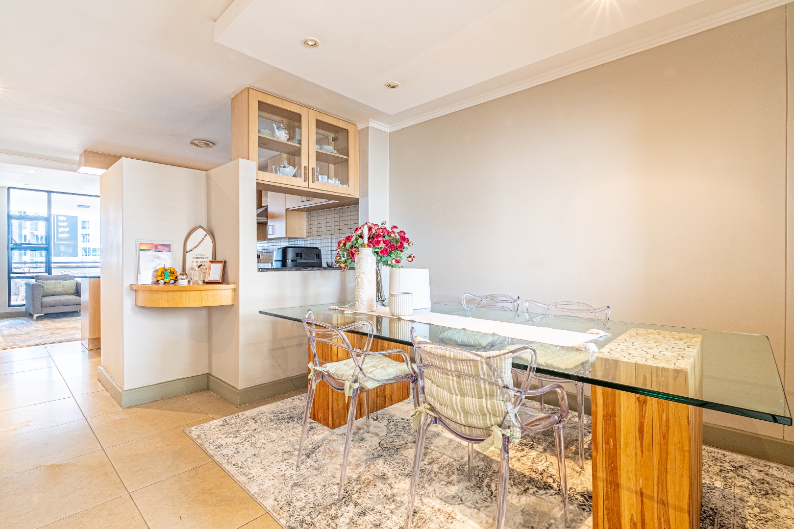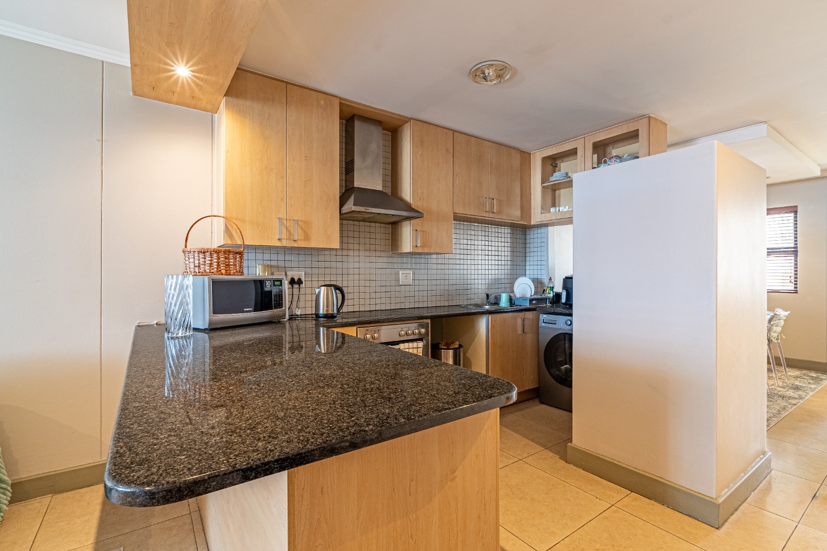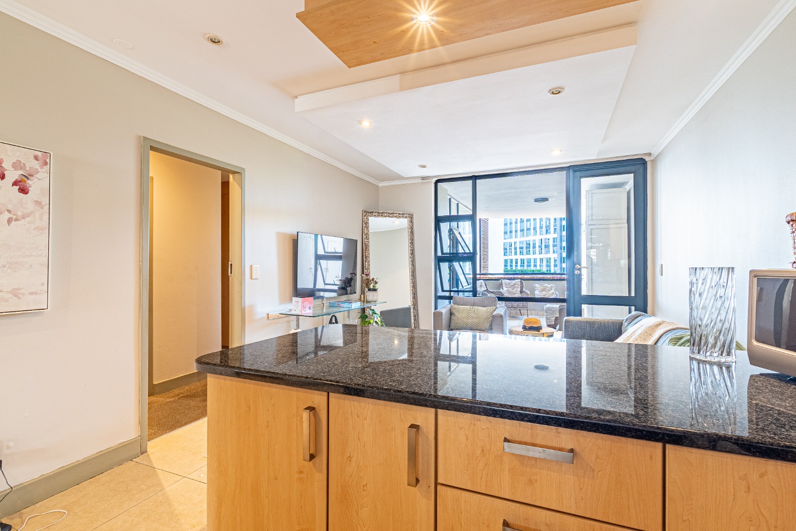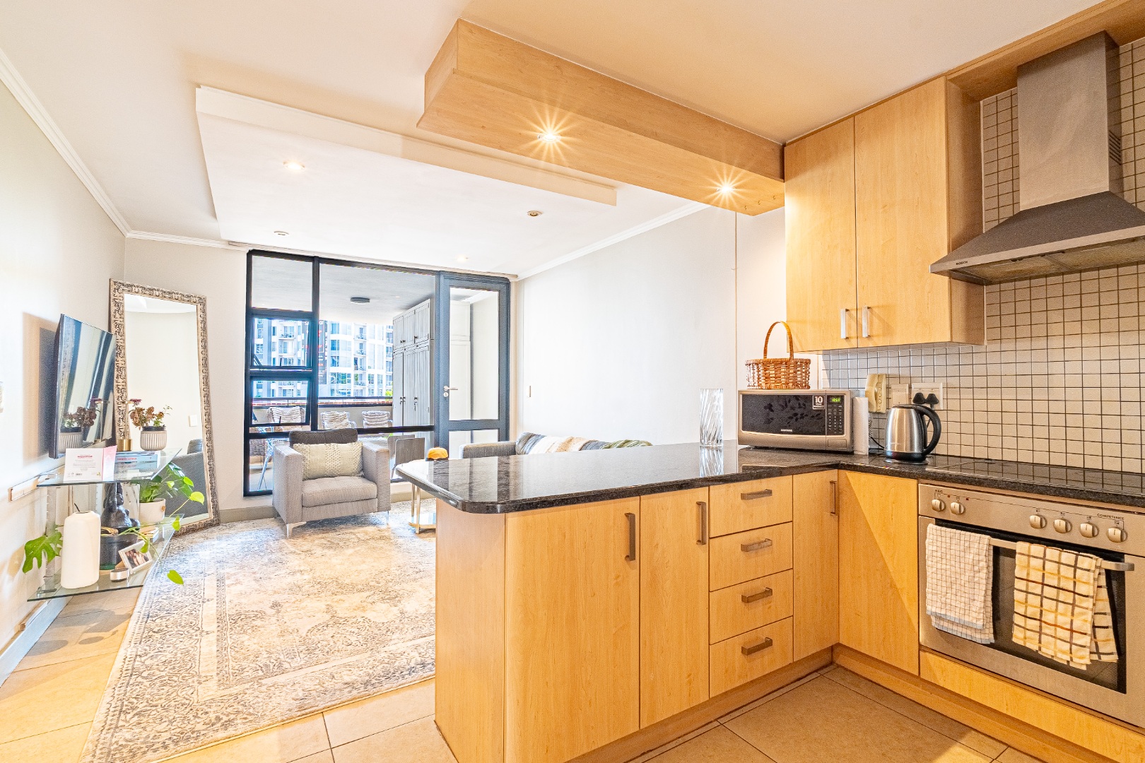 This modern 2-bedroom, 2-bathroom apartment offers a sophisticated urban lifestyle in Sandton Central. Spanning 107 sqm, the residence features an open-plan layout seamlessly connecting living, dining, and kitchen areas, enhancing natural light. The contemporary kitchen is well-appointed with light wood cabinetry, dark granite countertops, an integrated oven and hob, complemented by a tiled backsplash. Recessed lighting throughout creates a bright, welcoming atmosphere, ideal for relaxation and entertaining.