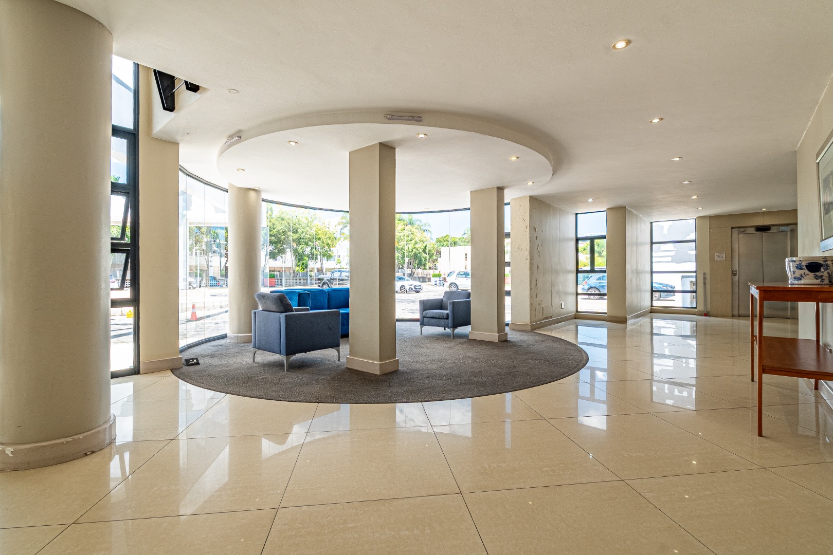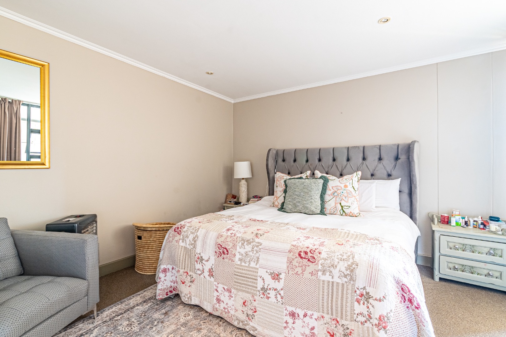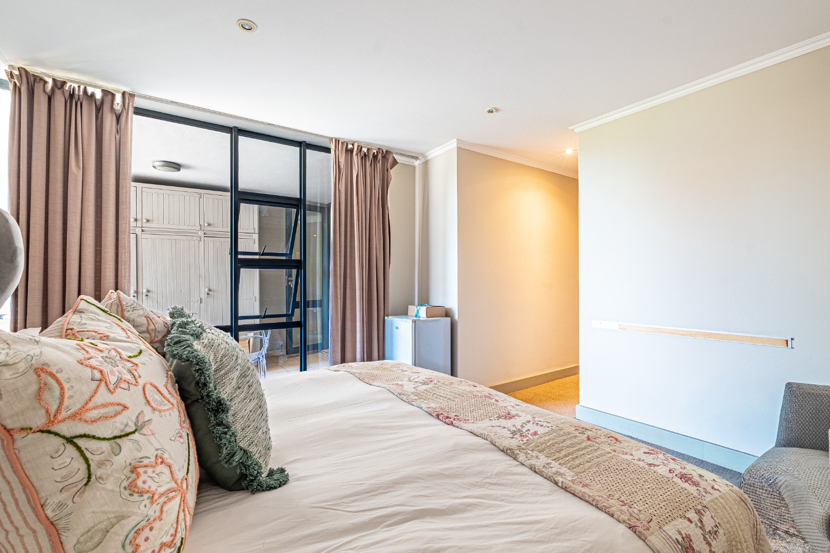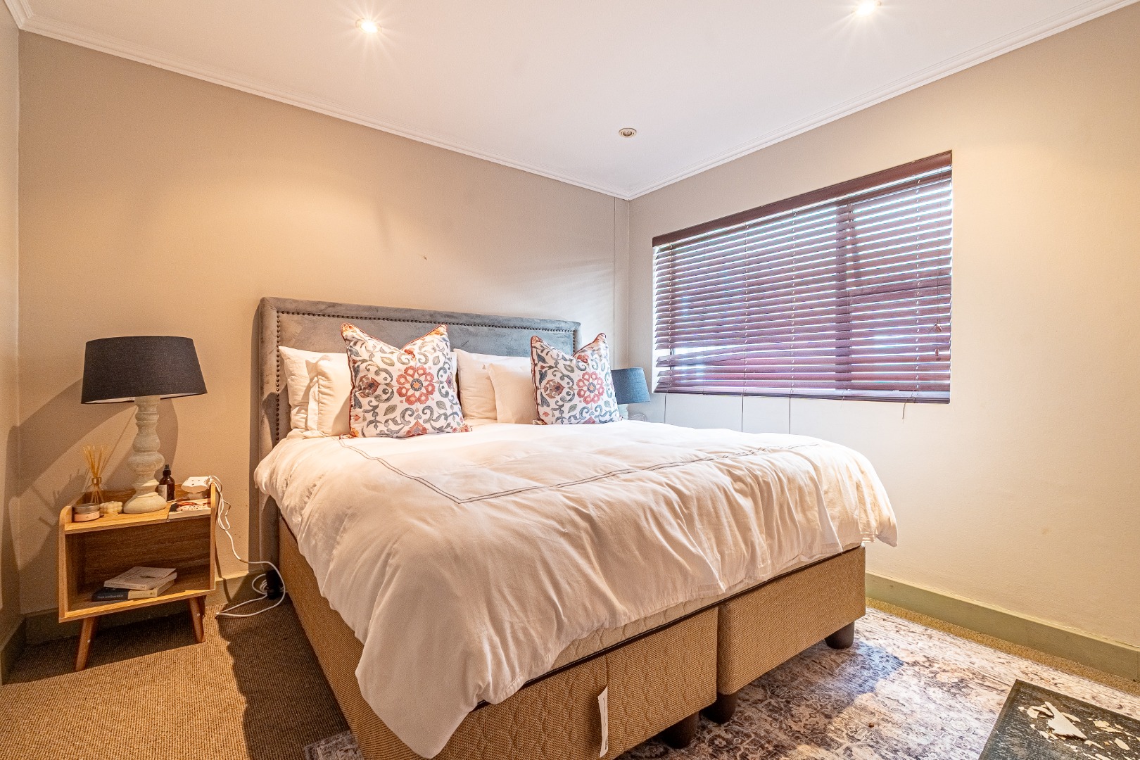 The apartment includes two comfortable bedrooms, one with an ensuite bathroom for added privacy. Both bathrooms feature modern finishes. Neutral wall colours and recessed lighting in the bedrooms ensure a tranquil retreat.