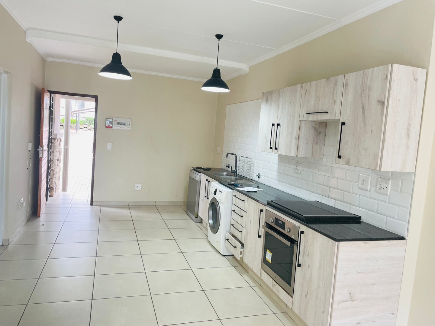 Step inside to discover a thoughtfully designed interior featuring clean lines and quality finishes. The open-plan living area seamlessly integrates with a compact yet highly functional kitchen. This modern kitchen is equipped with light wood-grain cabinetry, dark granite countertops, a stylish white subway tile backsplash, and integrated stainless steel appliances including an oven and electric stovetop. Tiled flooring extends throughout, ensuring easy maintenance and a cohesive aesthetic. Natural light floods the space, enhanced by modern pendant lighting.