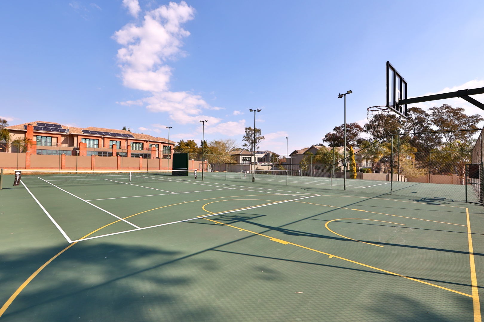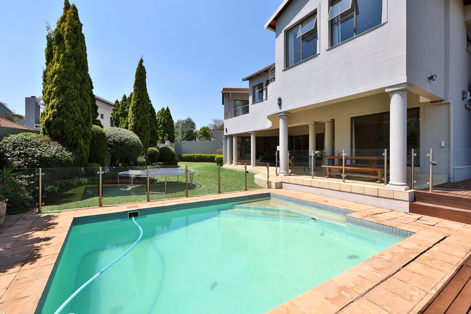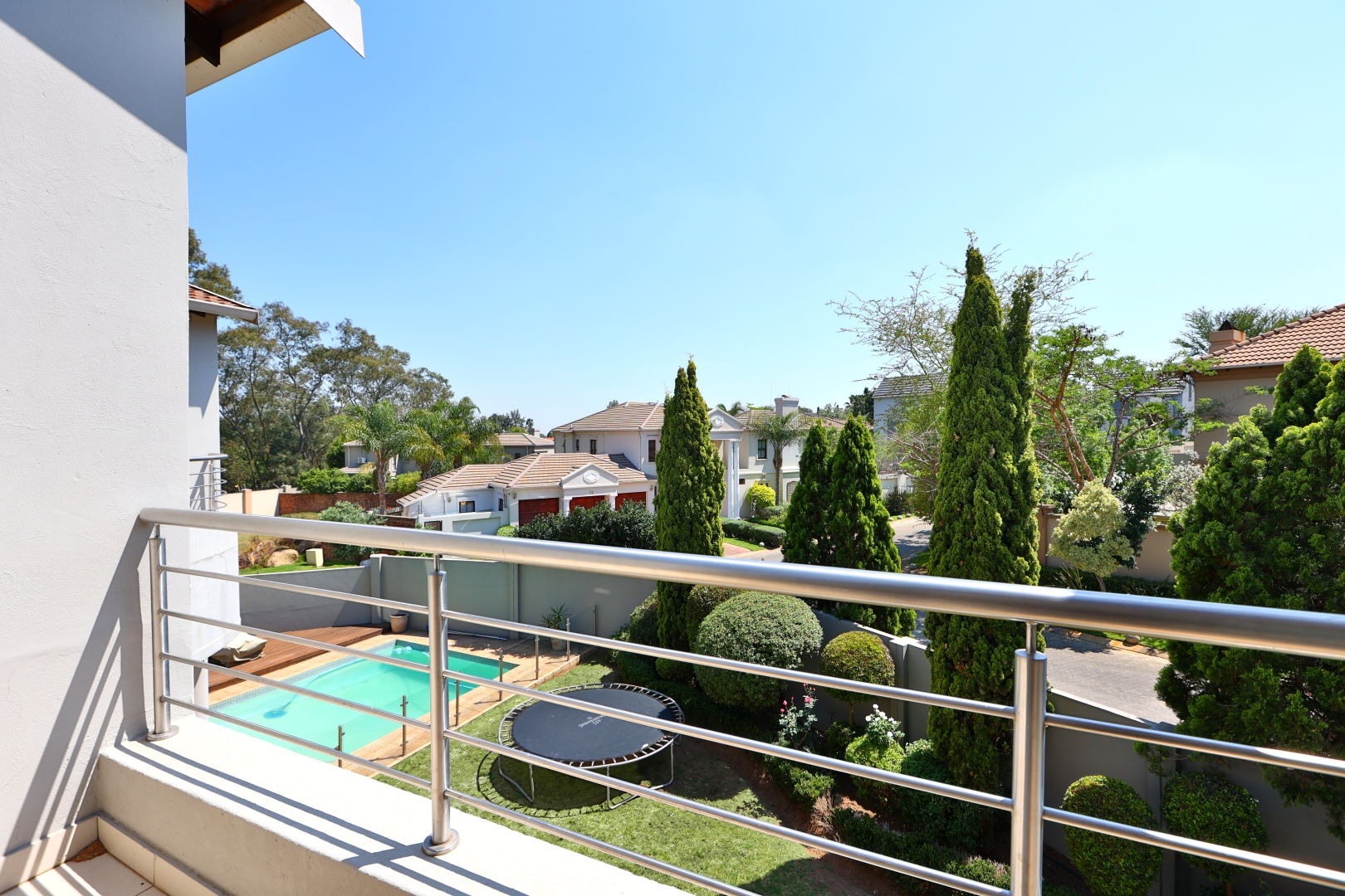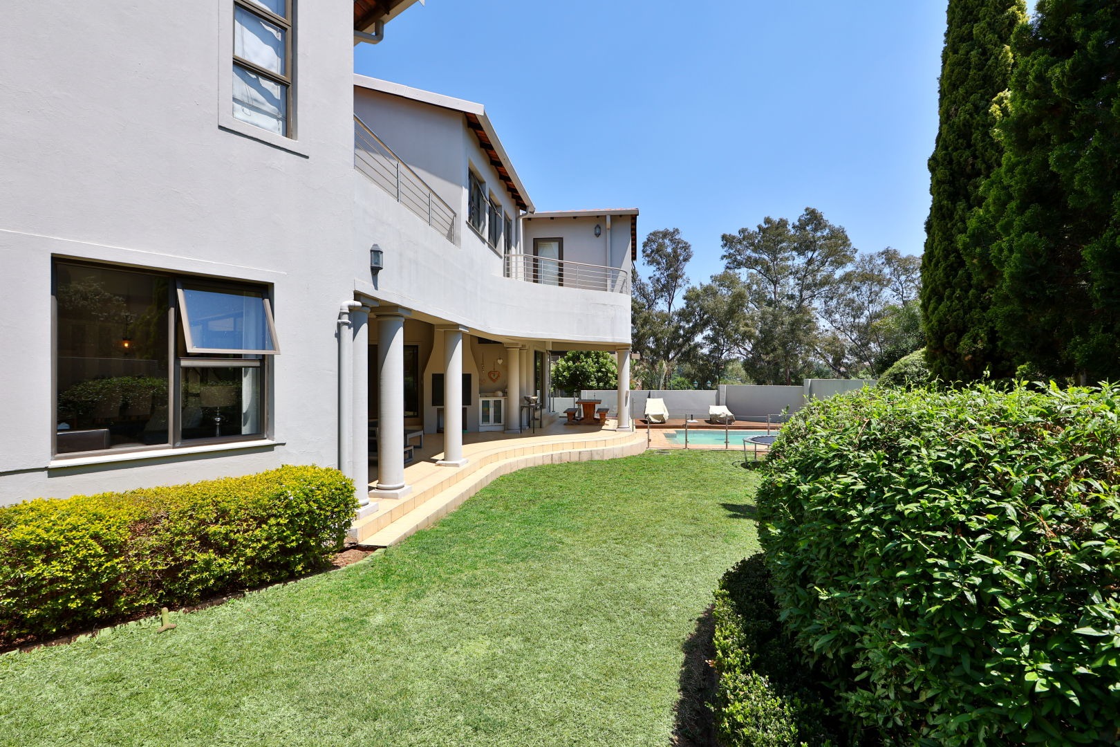 Outdoor living is a highlight, with a private swimming pool, a spacious covered patio perfect for entertaining, and a large, well-landscaped garden. Balconies provide scenic views, and a built-in braai area is ideal for South African outdoor gatherings. The property also includes staff quarters and a club house within the estate.
