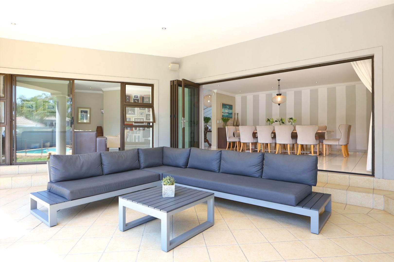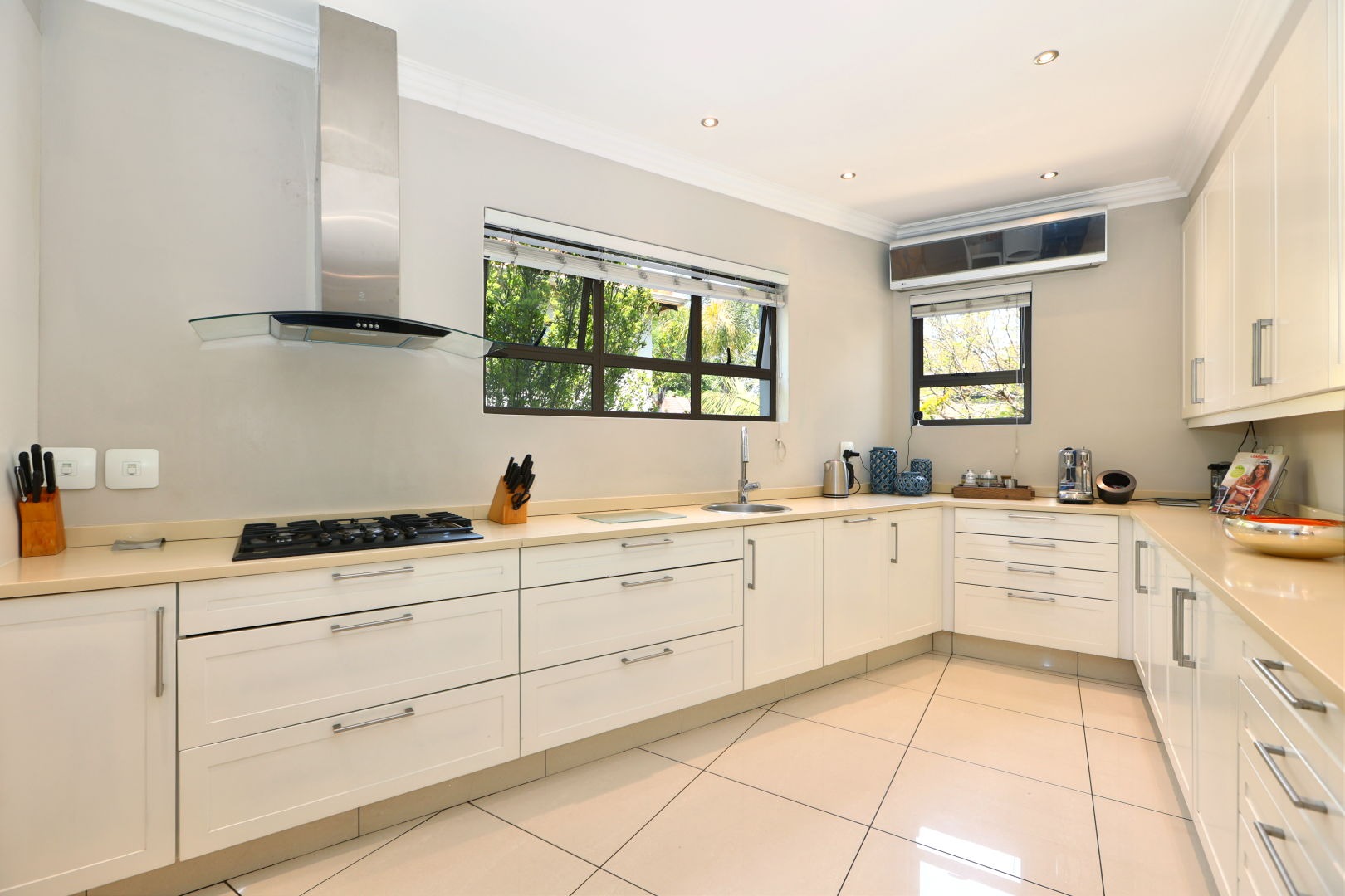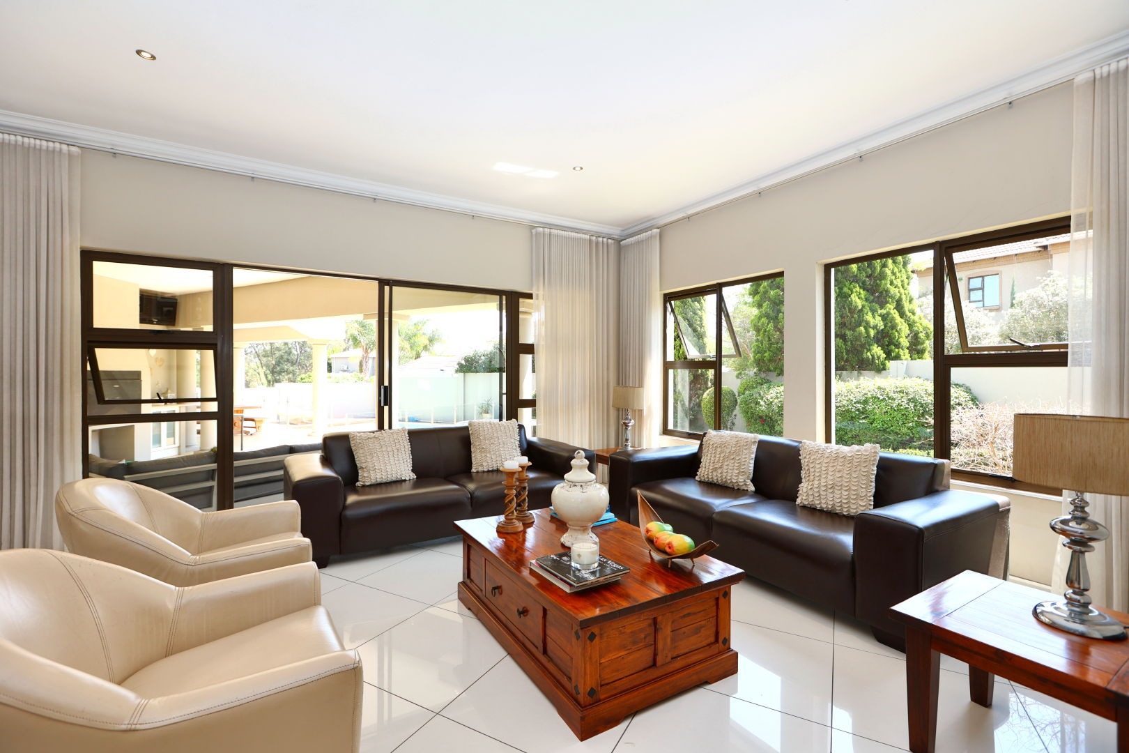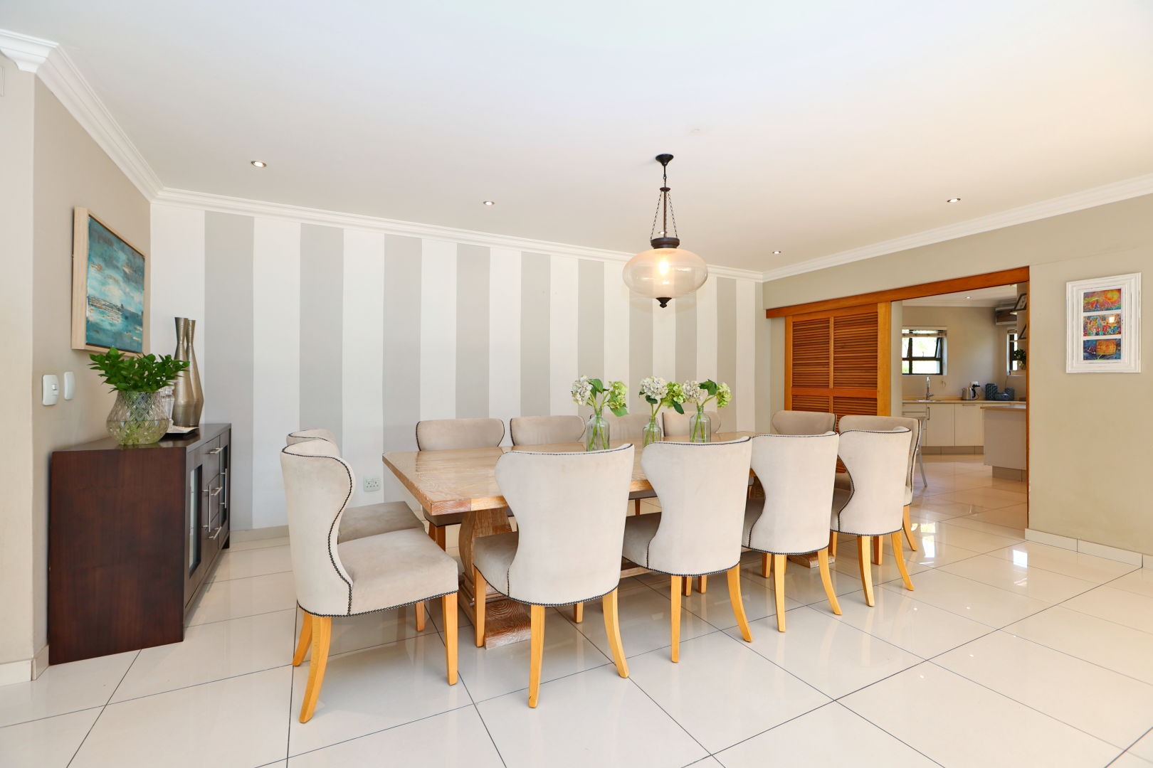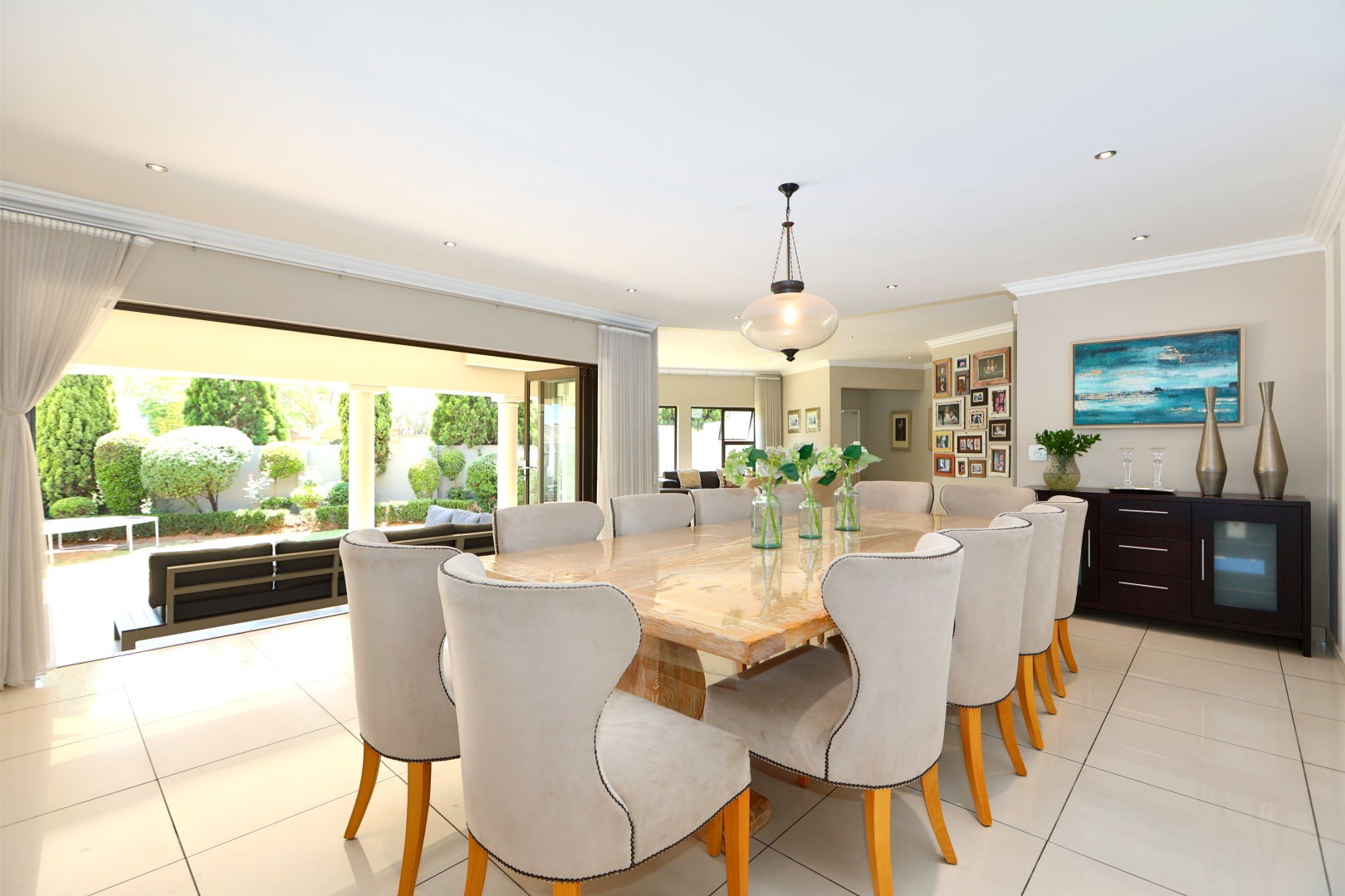 The expansive 571 sqm floor plan features an inviting entrance hall leading to three spacious lounges and a dedicated dining room, all benefiting from abundant natural light and clean tiled flooring. The modern kitchen is a culinary delight with extensive light cabinetry, ample counter space, a gas hob, and integrated stainless steel ovens, seamlessly connecting to a scullery for added convenience and storage. An open-plan design enhances the flow for entertaining.