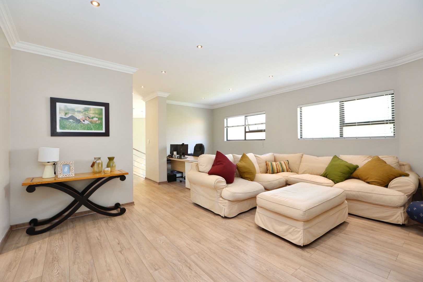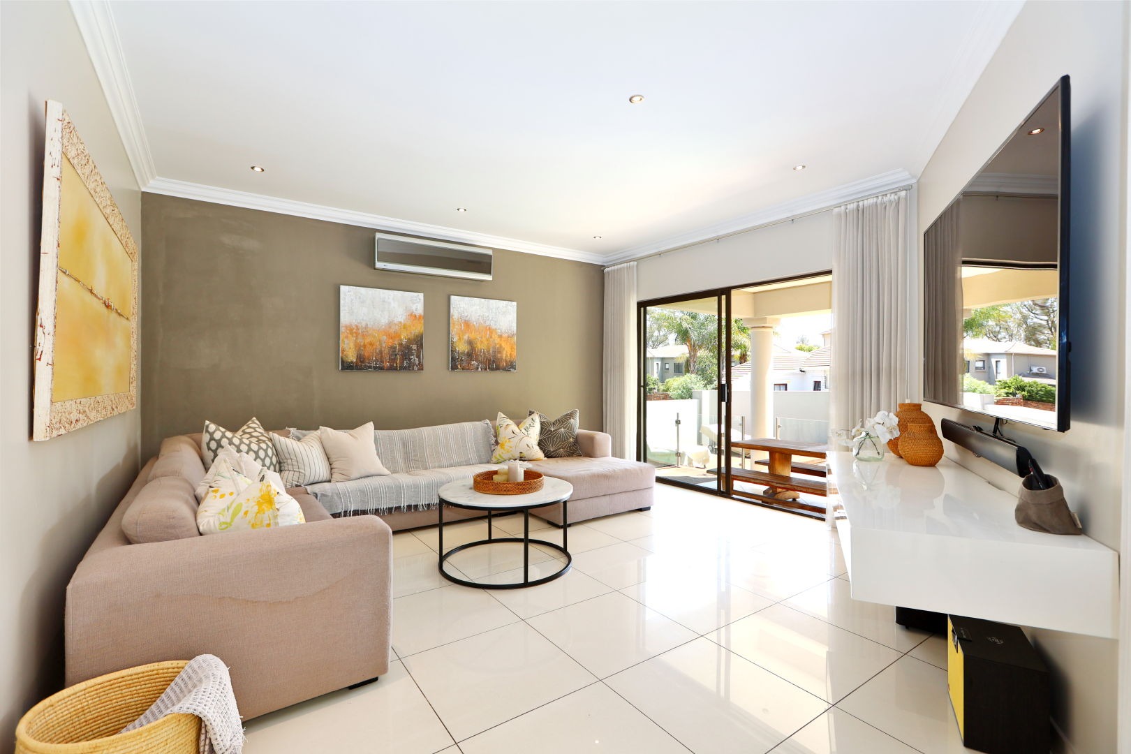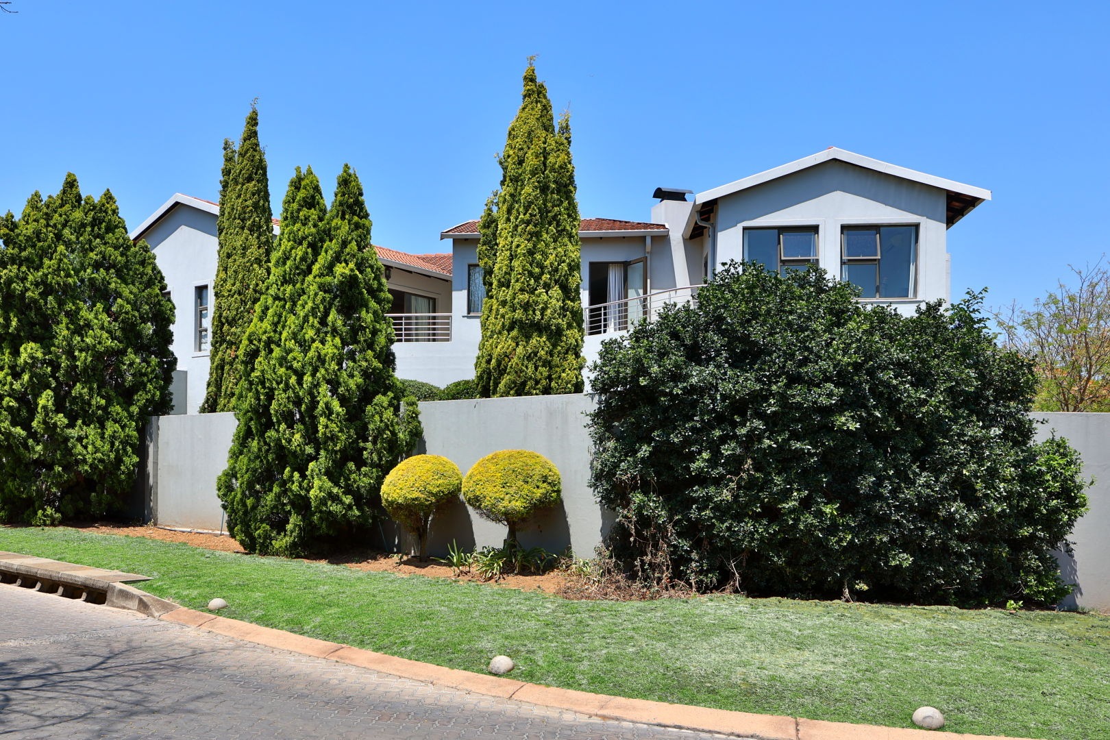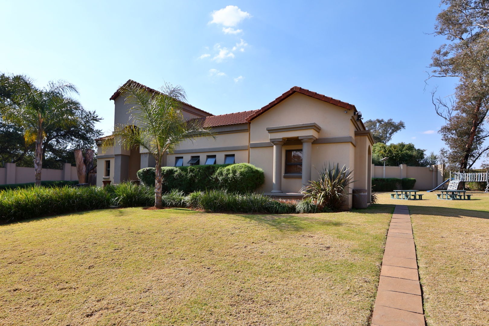 Discover this modern family residence nestled within a secure estate in the sought-after Woodmead, Sandton. Boasting a contemporary architectural style with a light grey facade and terracotta roof accents, the property presents excellent kerb appeal, complemented by mature, well-maintained landscaping and a private perimeter wall.