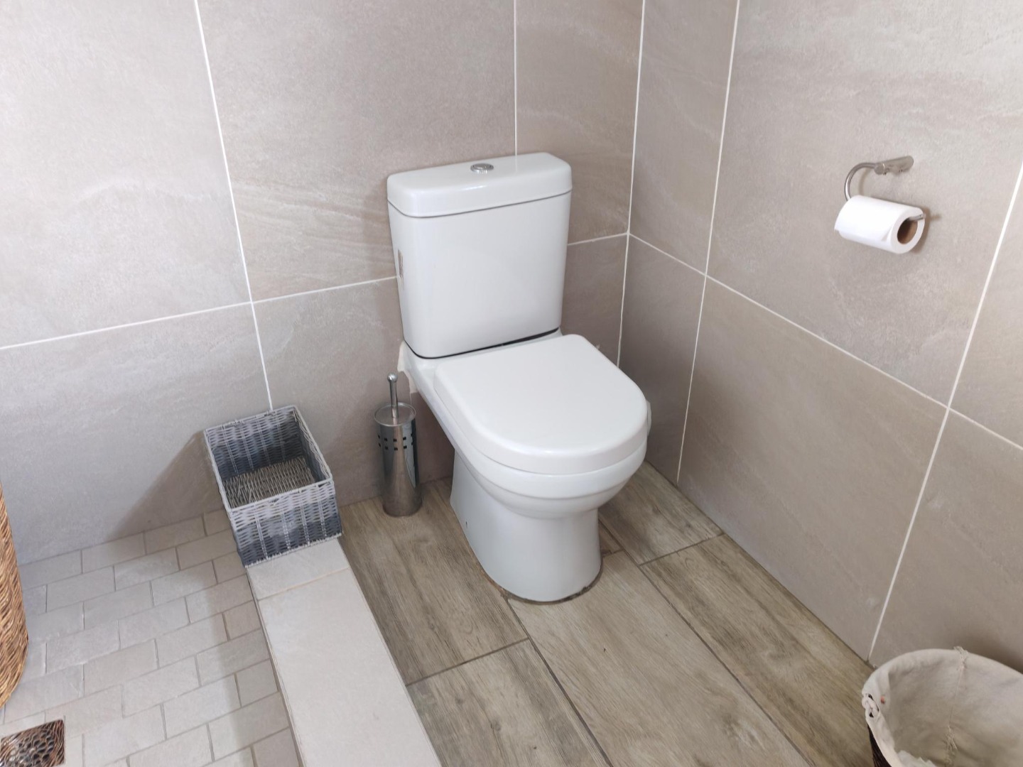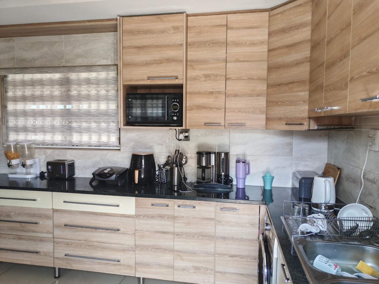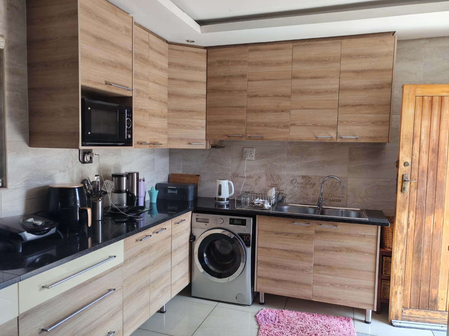 The heart of this home is its open-plan kitchen and dining area, designed for both functionality and style. The kitchen showcases extensive wood-grain cabinetry, sleek dark countertops, and a tiled backsplash, complete with an integrated washing machine and a convenient breakfast bar. Large windows throughout ensure abundant natural light, creating an airy and comfortable atmosphere. The three bedrooms offer comfortable accommodation, supported by two well-appointed bathrooms.