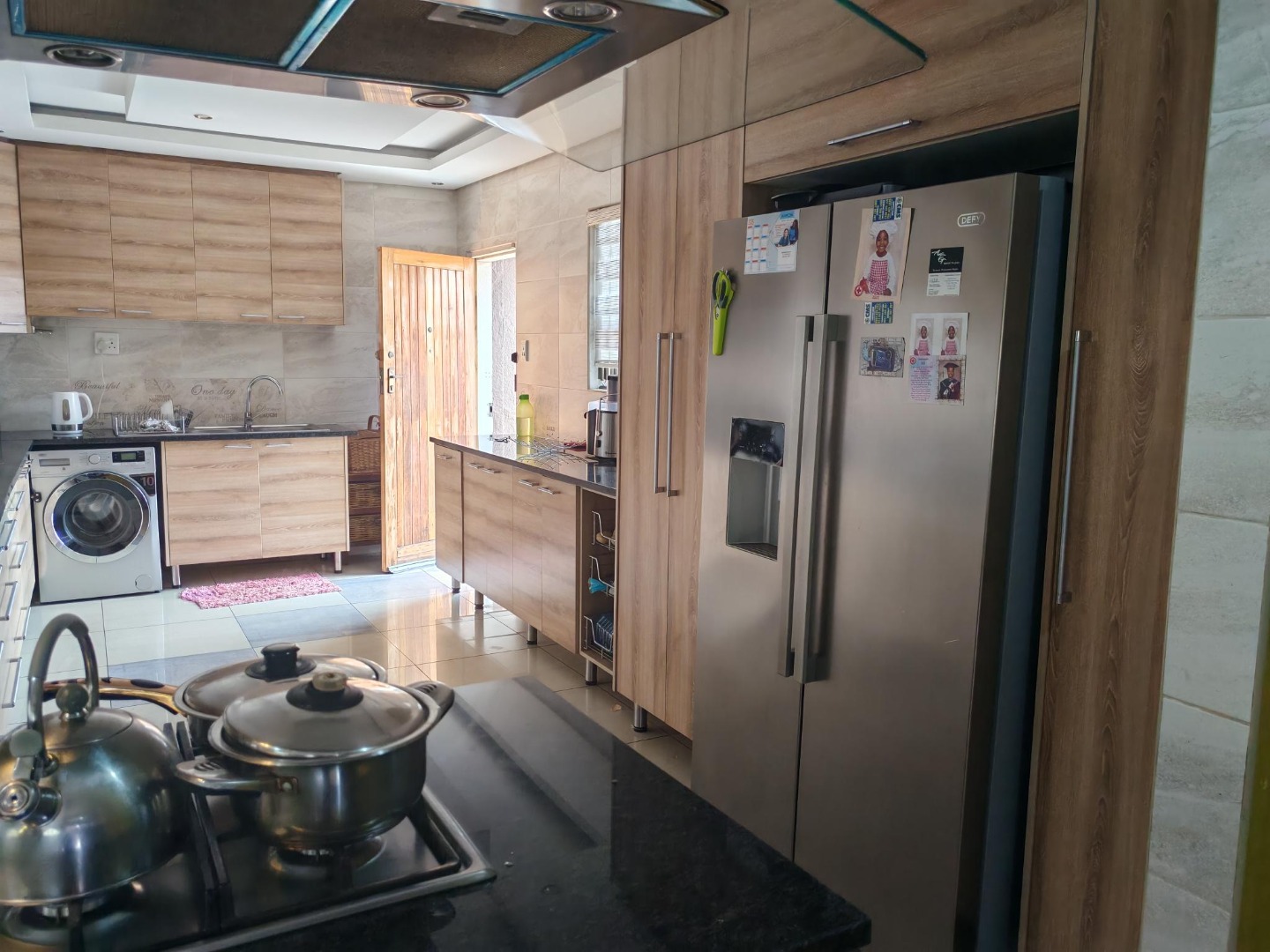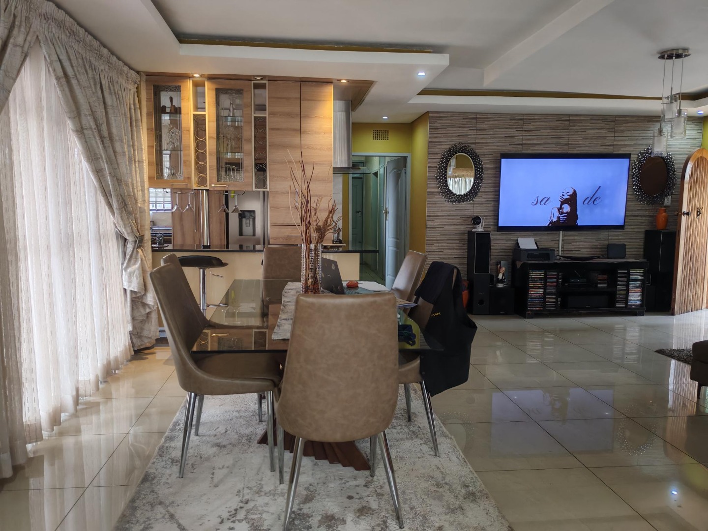 Discover this charming 3-bedroom, 2-bathroom residence located in the established Modder East suburb of Springs, South Africa. The home presents a welcoming kerb appeal with a well-maintained light brown stucco exterior, a classic red tile roof, and neatly trimmed landscaping, complemented by a brick paver pathway. Inside, the property boasts spacious, brightly lit living areas featuring modern tiled flooring and an inviting open-plan layout. The main living room is enhanced by a prominent stone-clad fireplace, creating a warm focal point, alongside recessed lighting and a contemporary chandelier.
