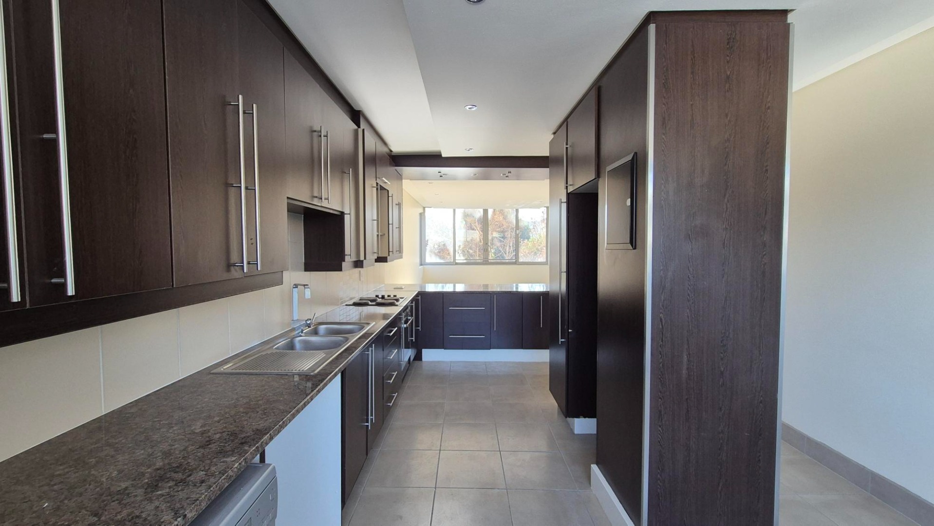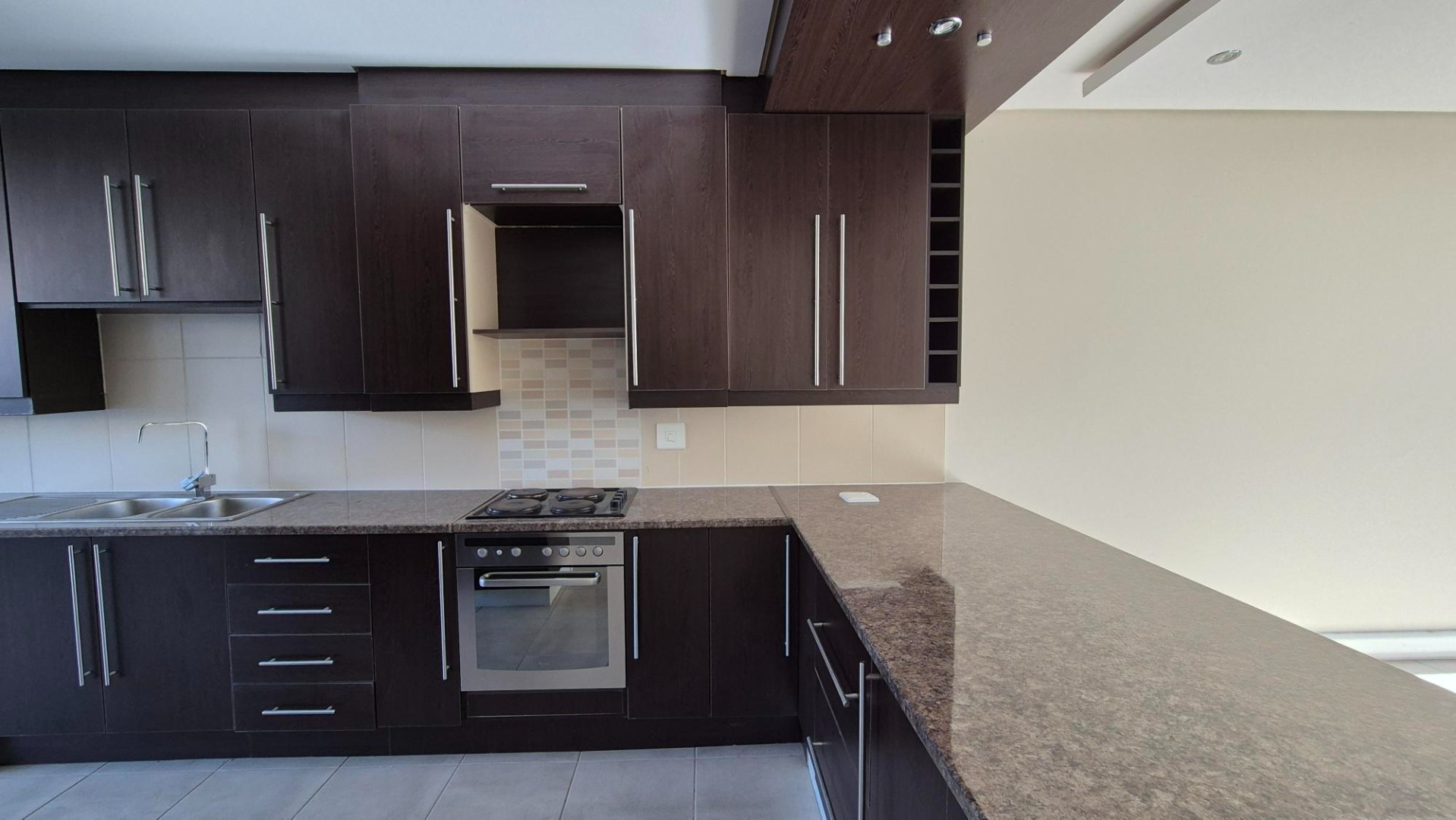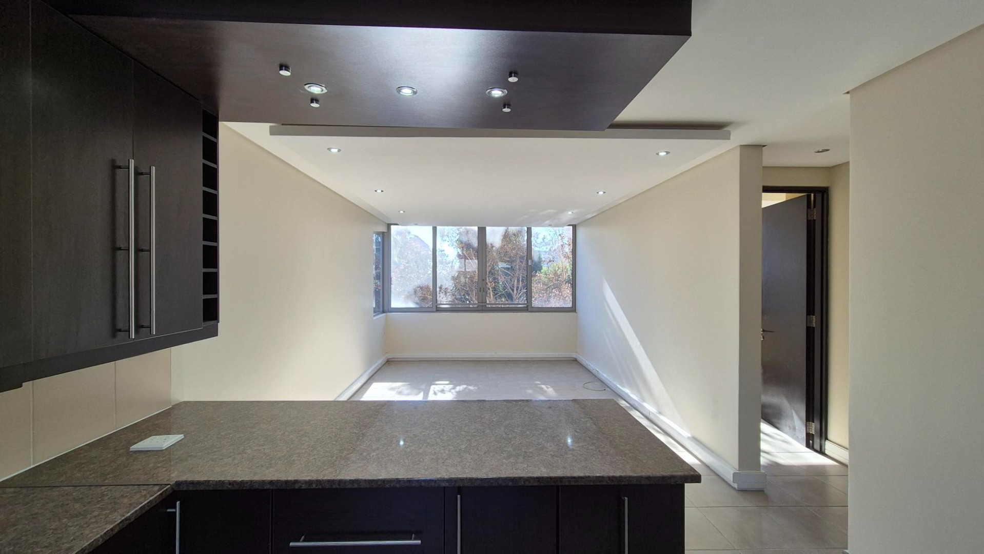 Discover modern living in this inviting 2-bedroom, 1-bathroom apartment, spanning 89 sqm, situated within a secure complex in Bedford Gardens. The residence features a contemporary open-plan layout, seamlessly connecting the living spaces. The kitchen is a highlight, boasting dark wood-grain cabinetry, granite-look countertops, and integrated appliances including a dishwasher, oven, and double sink, complemented by a built-in wine rack. Abundant natural light floods the tiled living and dining areas through large windows, enhanced by stylish ceiling bulkheads and recessed lighting, creating a bright and welcoming atmosphere.