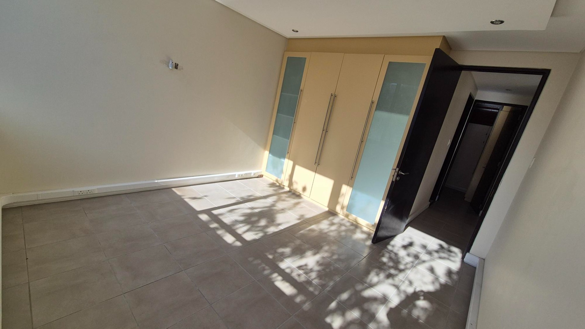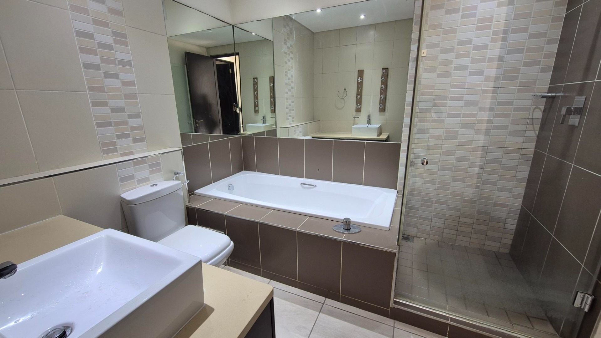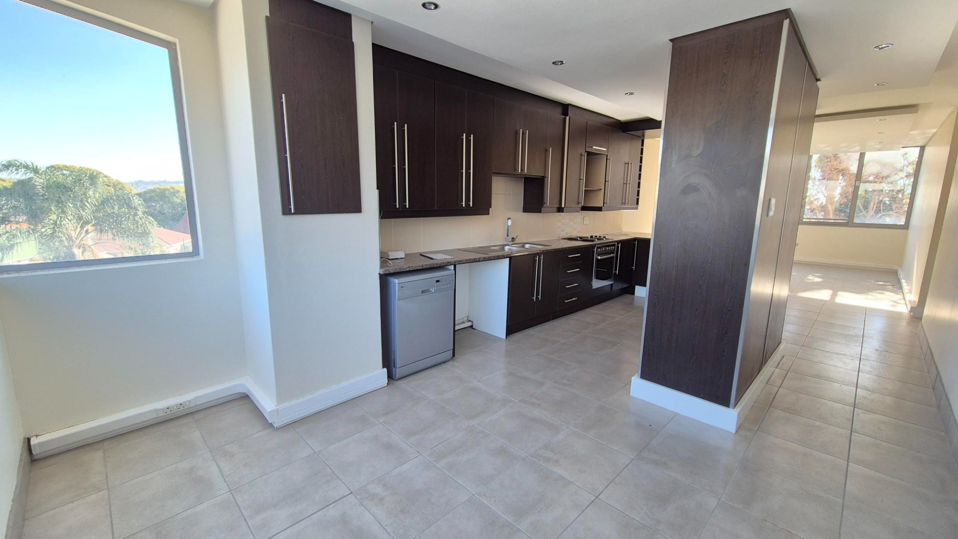 Discover modern living in this inviting 2-bedroom, 1-bathroom apartment, spanning 89 sqm, situated within a secure complex in Bedford Gardens. The residence features a contemporary open-plan layout, seamlessly connecting the living spaces. The kitchen is a highlight, boasting dark wood-grain cabinetry, granite-look countertops, and integrated appliances including a dishwasher, oven, and double sink, complemented by a built-in wine rack. Abundant natural light floods the tiled living and dining areas through large windows, enhanced by stylish ceiling bulkheads and recessed lighting, creating a bright and welcoming atmosphere.