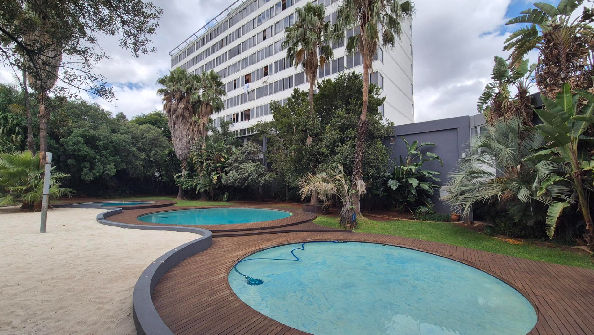 Residents will enjoy a resort-like lifestyle with access to exceptional communal amenities. The complex offers multiple distinct swimming pools, extensive wooden decking, and a unique sandy relaxation area, perfect for unwinding. Further enhancing the lifestyle offering are a fully equipped gym, a clubhouse, and a communal braai area, catering to both fitness and social needs. The apartment benefits from scenic views of greenery and distant landscapes, visible from its large windows, providing a tranquil backdrop to daily life.