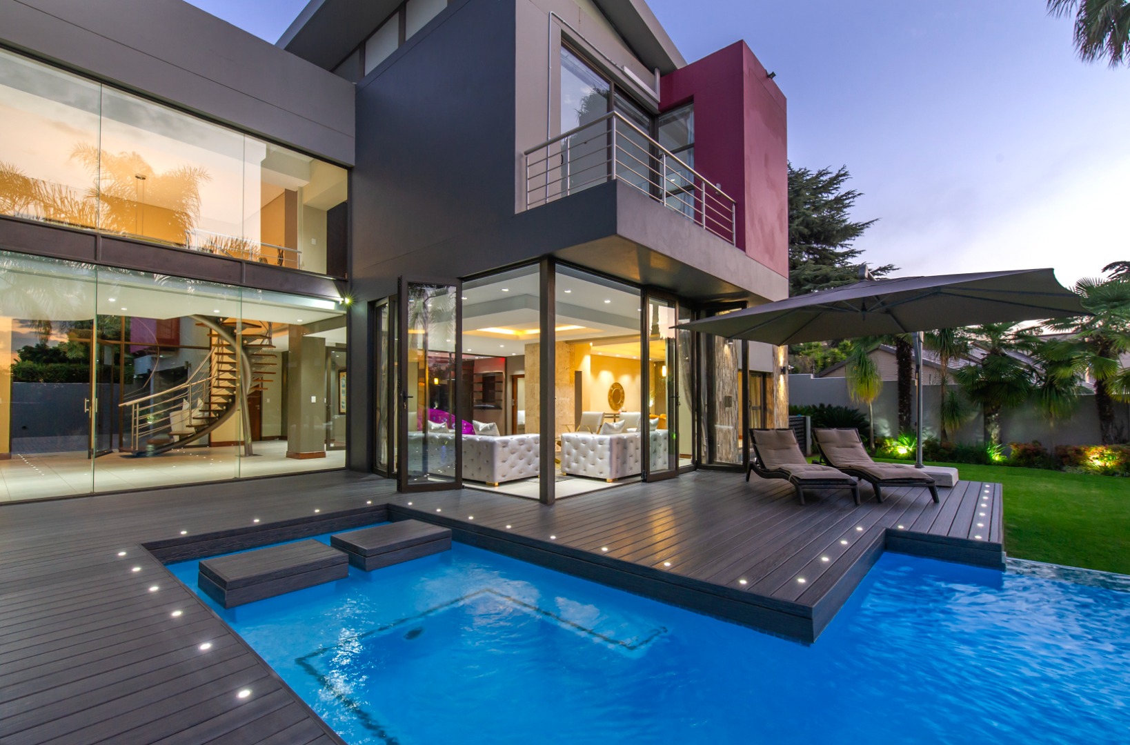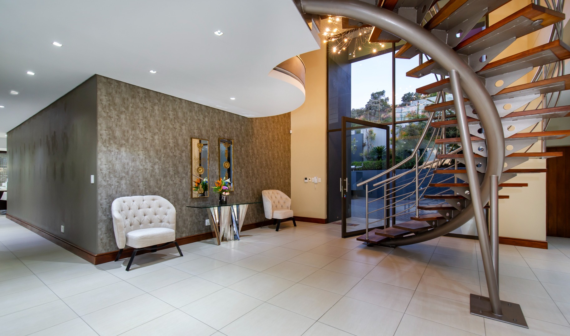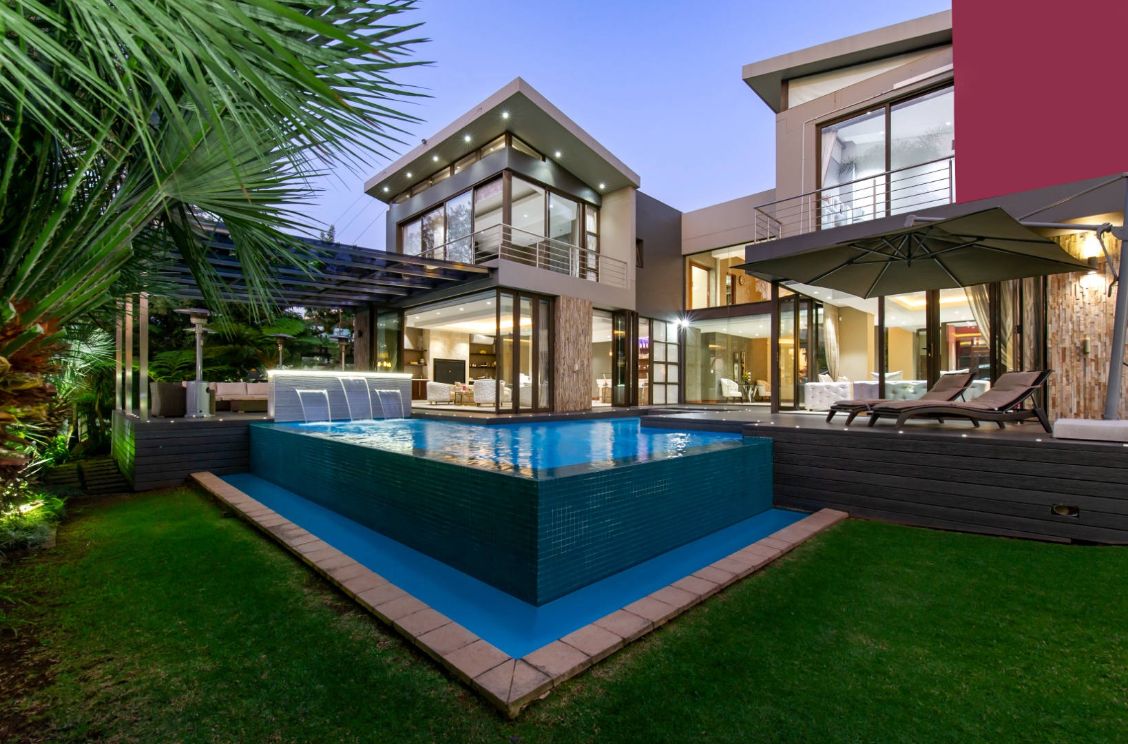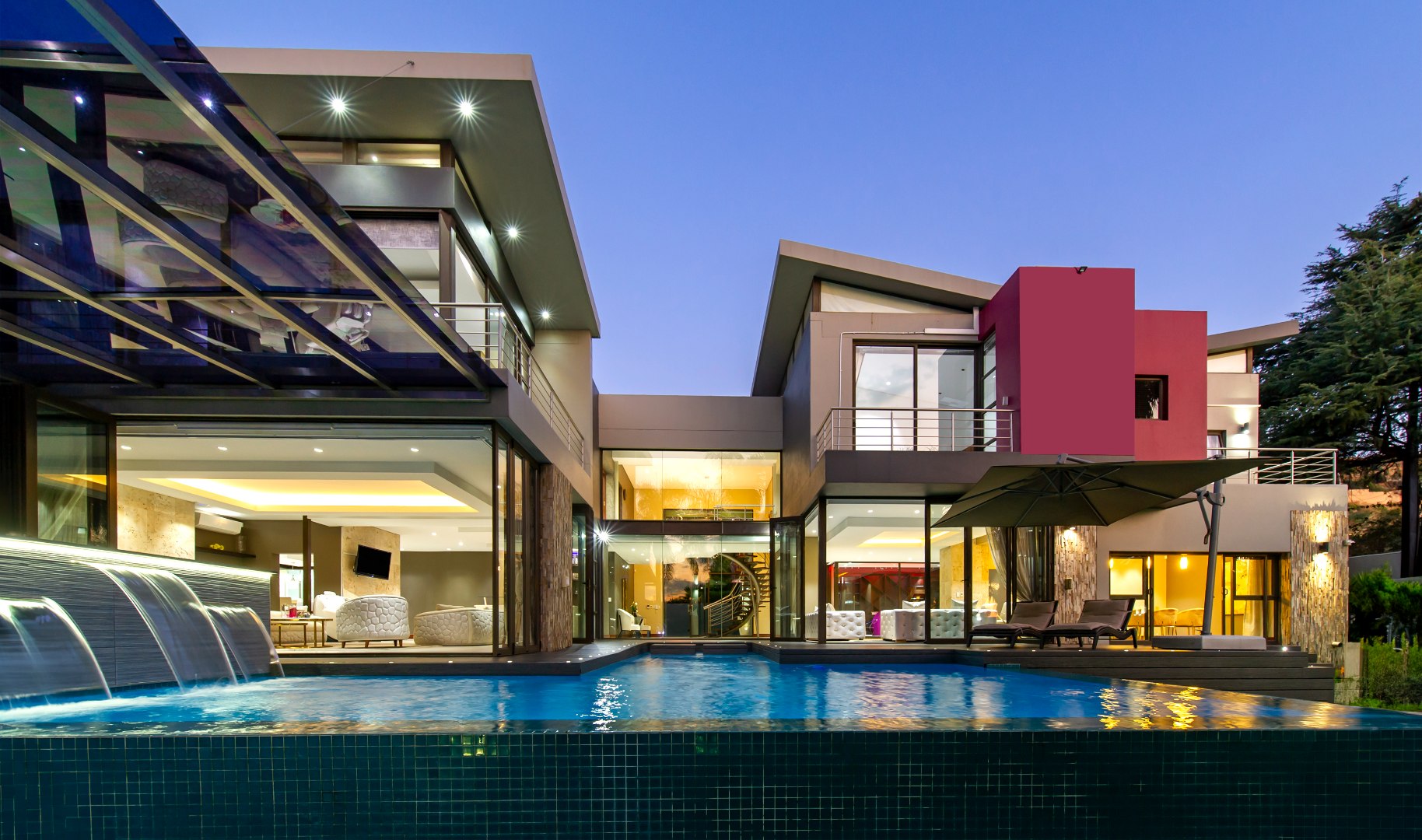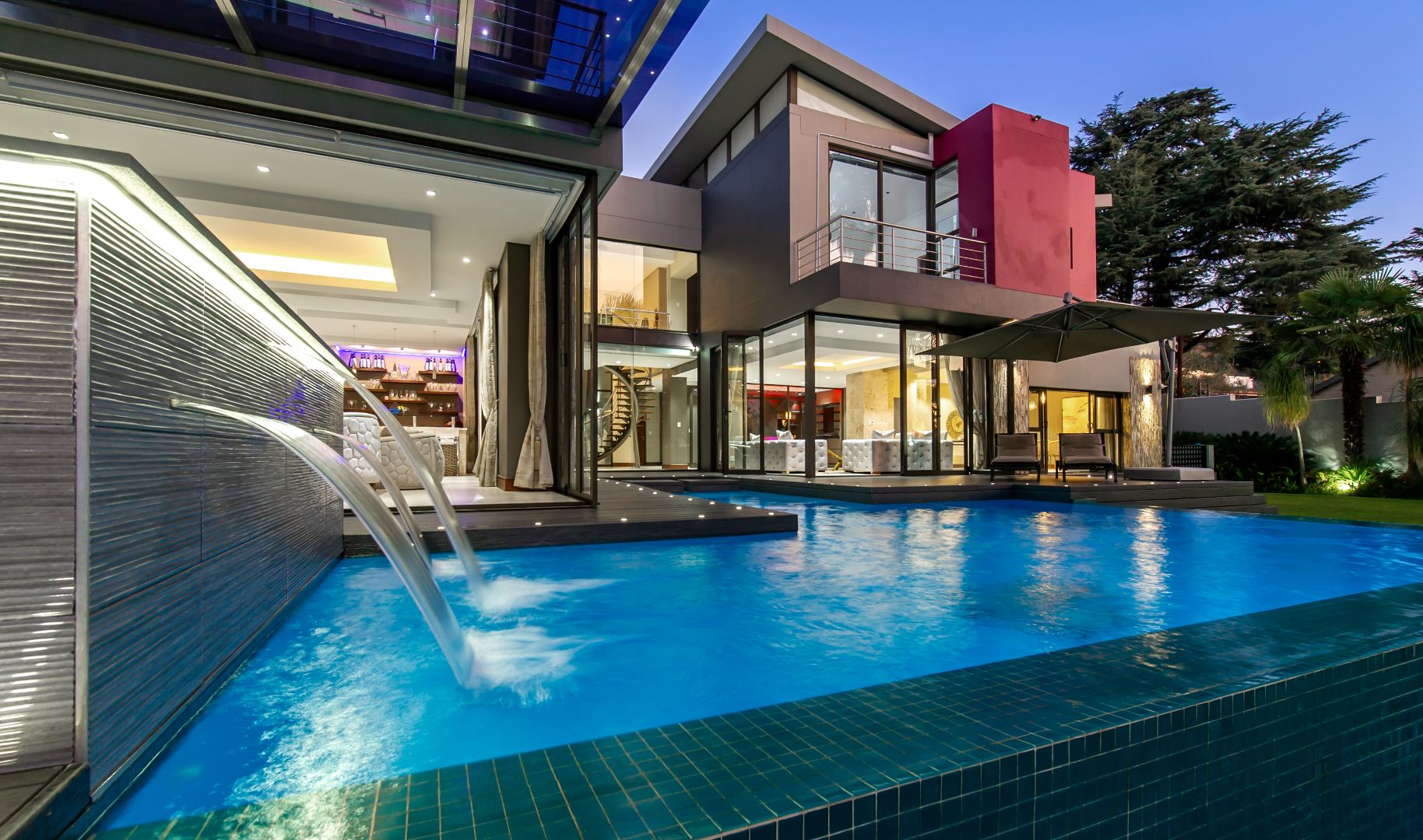 Situated in the elite suburb of Bedfordview, this breathtaking double-storey executive residence offers contemporary luxury at its finest. A striking glass-encased entrance hall with a sweeping natural-wood staircase sets the tone for the sophisticated interiors. Expansive windows frame the landscaped garden and newly installed swimming pool with cascading water feature.