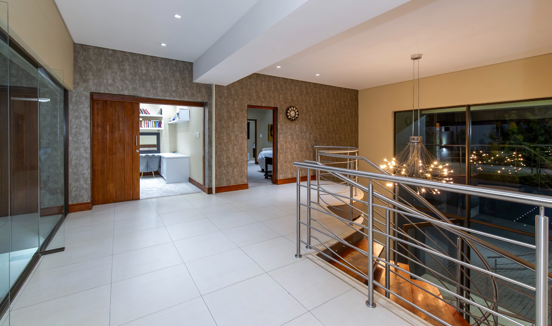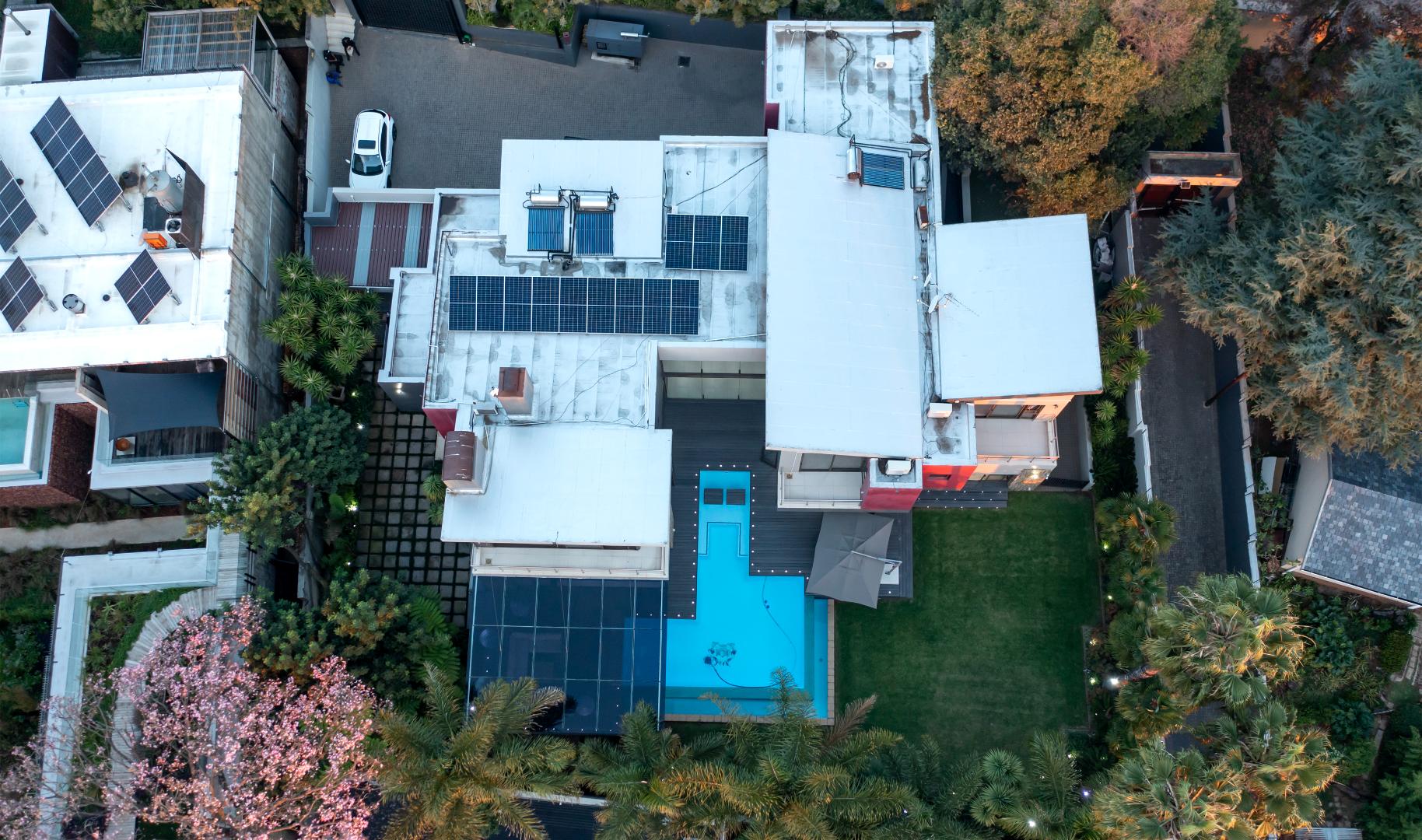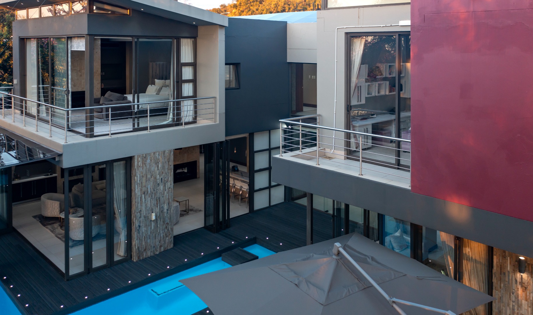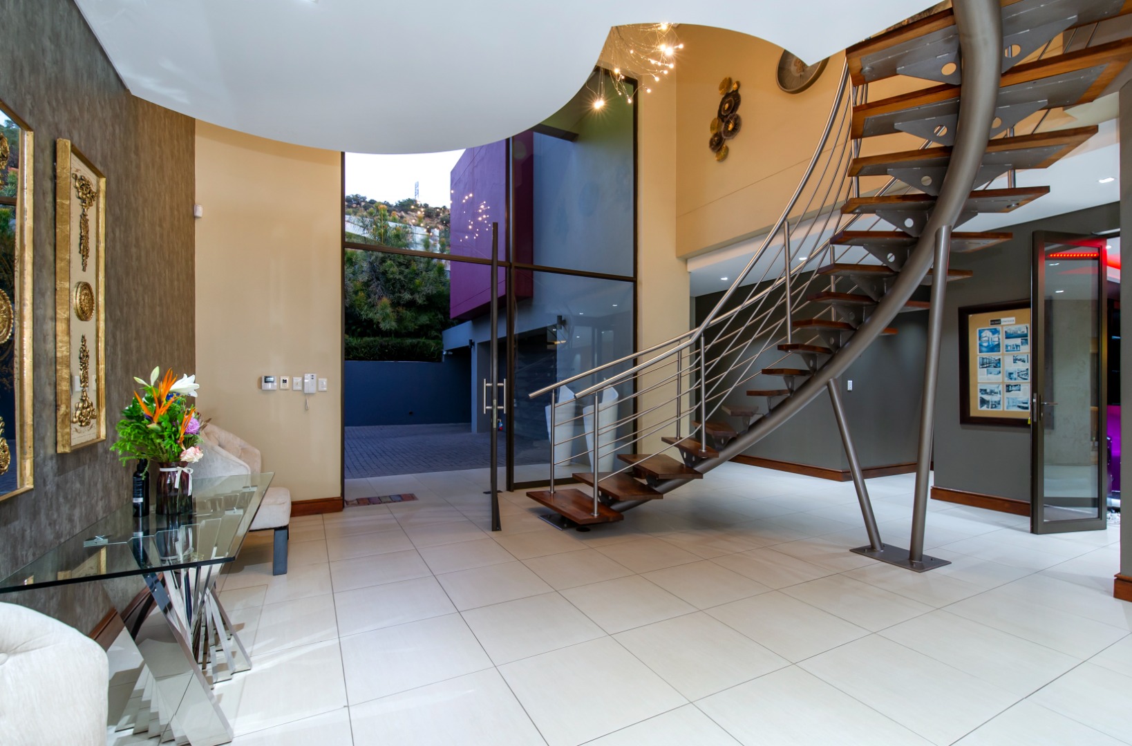 Situated in the elite suburb of Bedfordview, this breathtaking double-storey executive residence offers contemporary luxury at its finest. A striking glass-encased entrance hall with a sweeping natural-wood staircase sets the tone for the sophisticated interiors. Expansive windows frame the landscaped garden and newly installed swimming pool with cascading water feature.