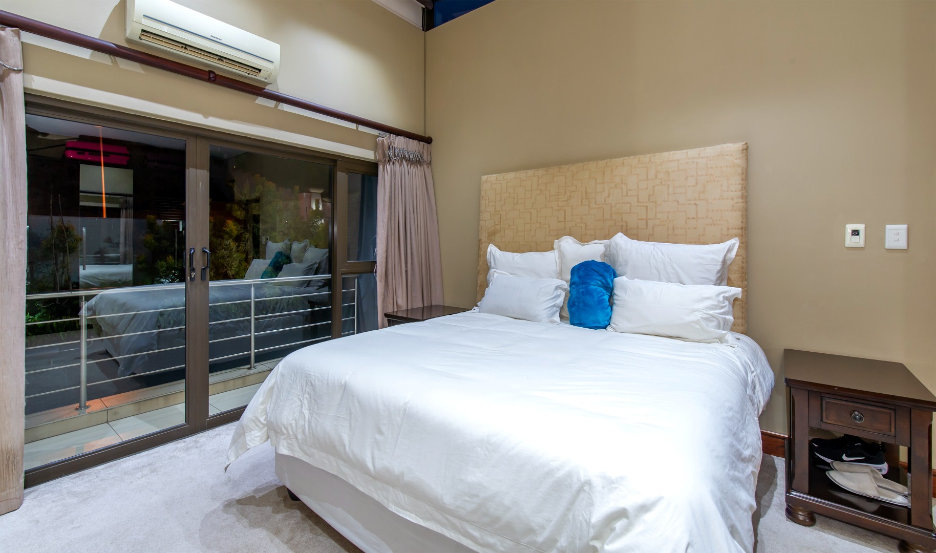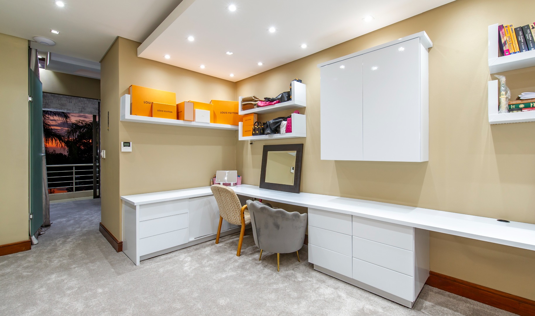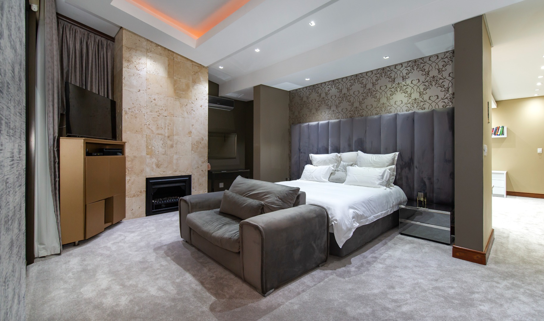Upstairs, five spacious en-suite bedrooms await, all with newly fitted carpets and balcony access. The magnificent master suite boasts a private lounge/study, floor-to-ceiling glass windows with 180-degree views, electric blinds, a fireplace, his-and-hers dressing rooms, and a luxurious spa-style bathroom. A large pyjama lounge completes the upper level.