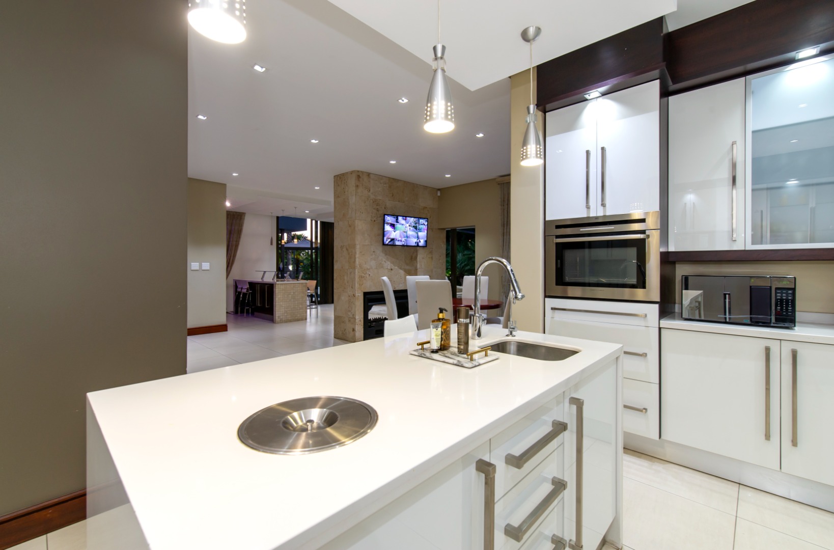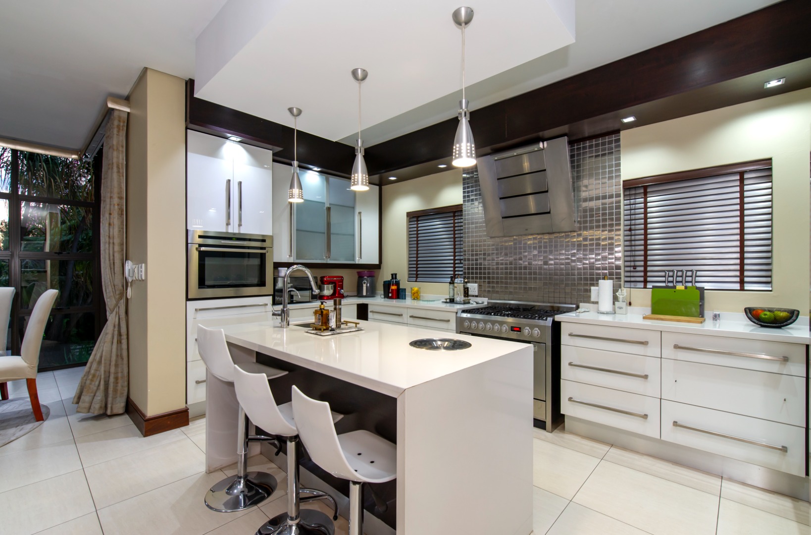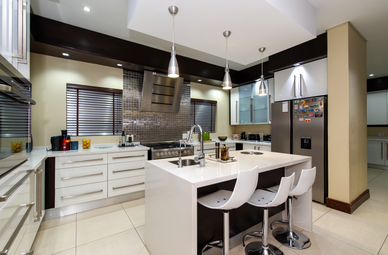 The gourmet kitchen includes premium appliances, a gas hob, high-gloss cabinetry, a walk-in pantry, and a separate scullery and laundry.