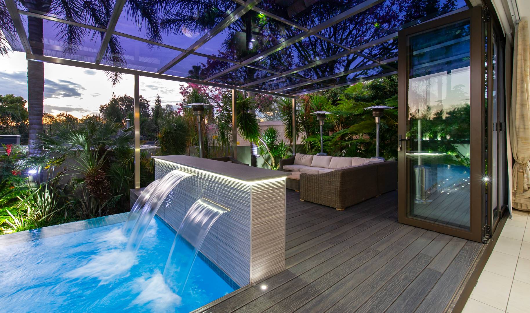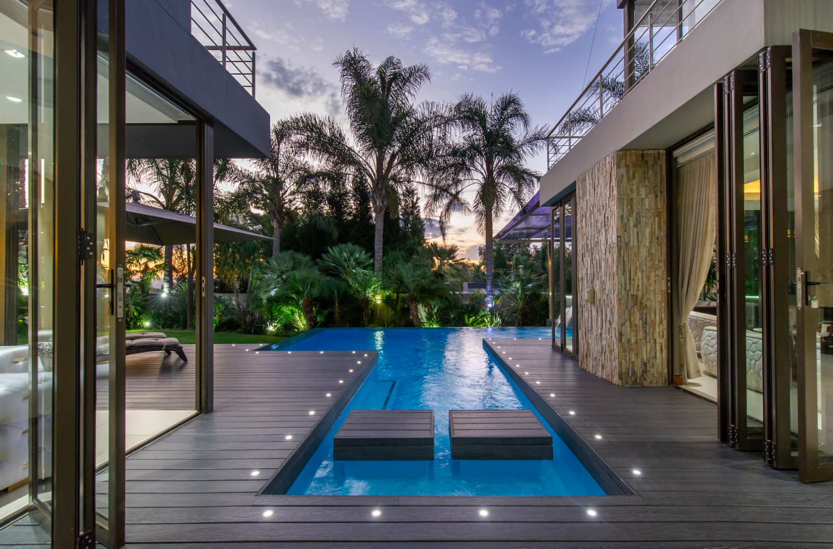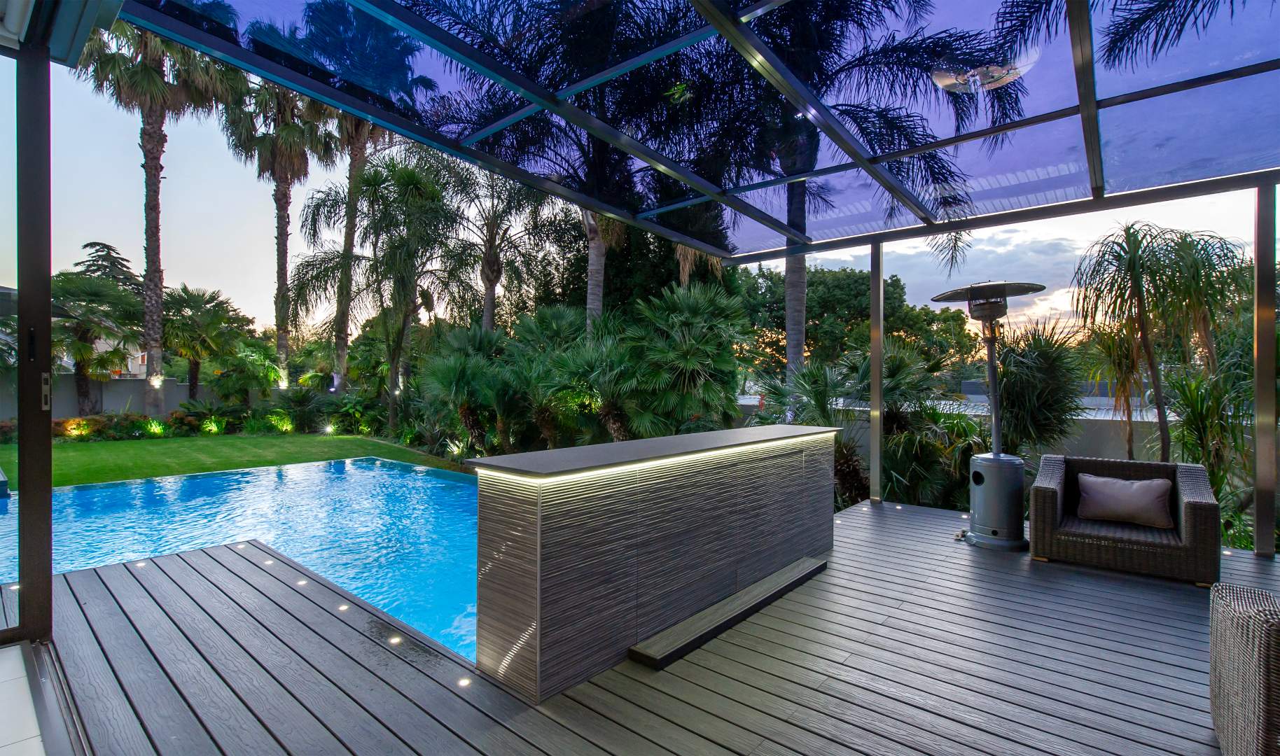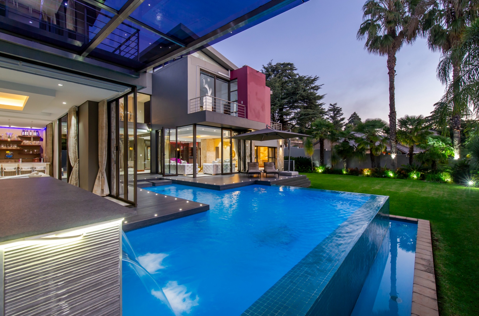 The everyday living spaces are ideal for relaxed, fluid entertainment—offering a family lounge, built-in gas griller, designer champagne bar, and a wraparound pool deck with covered glass-roof patio set amongst towering palm trees.