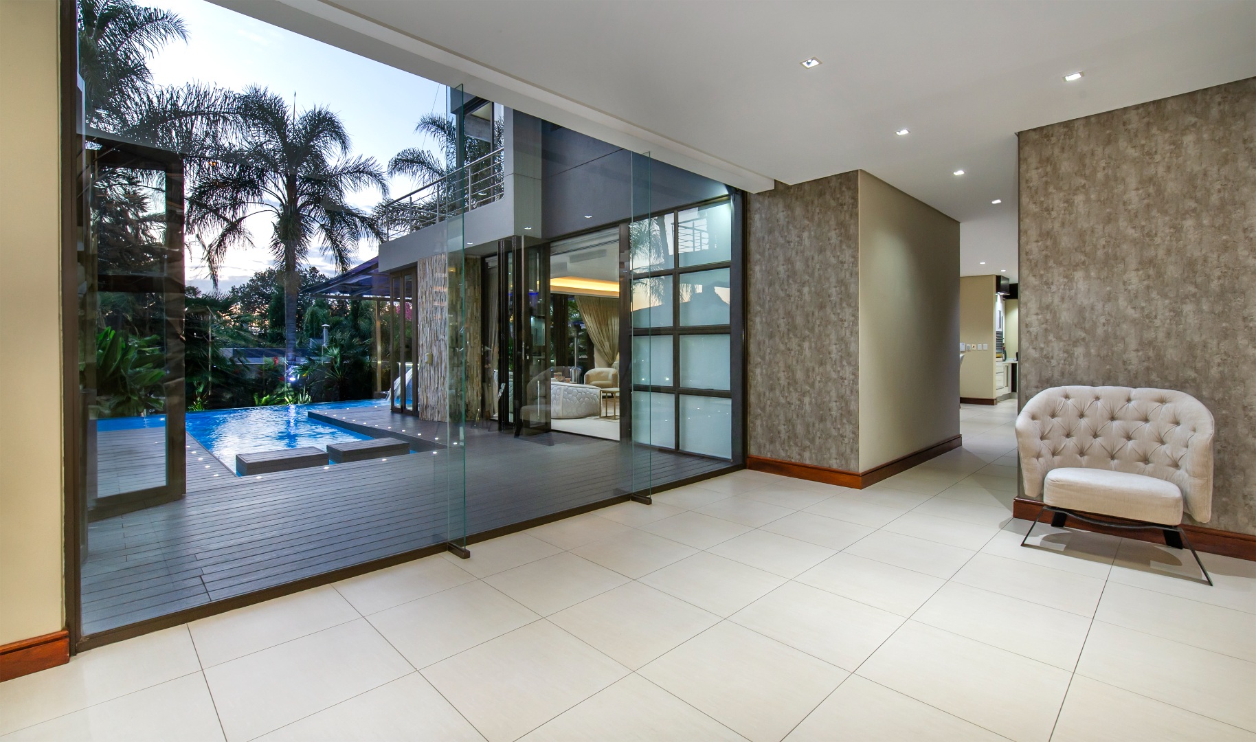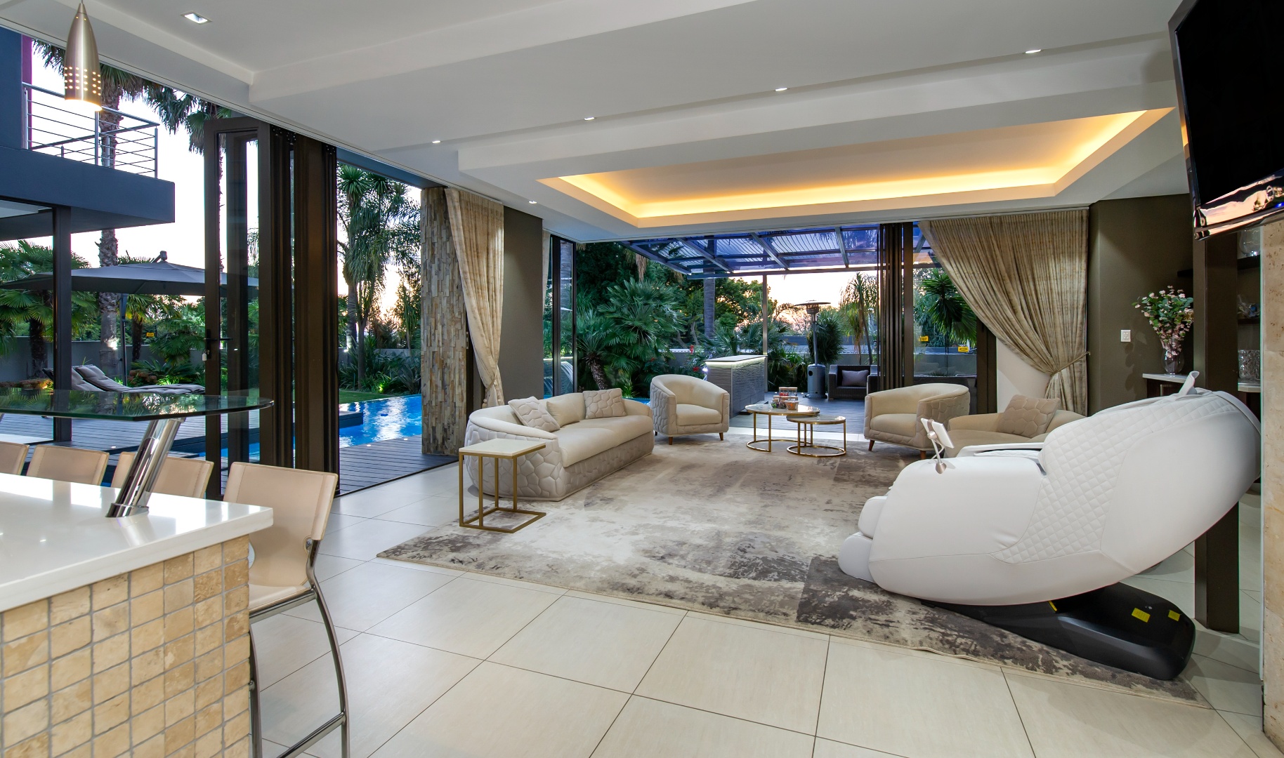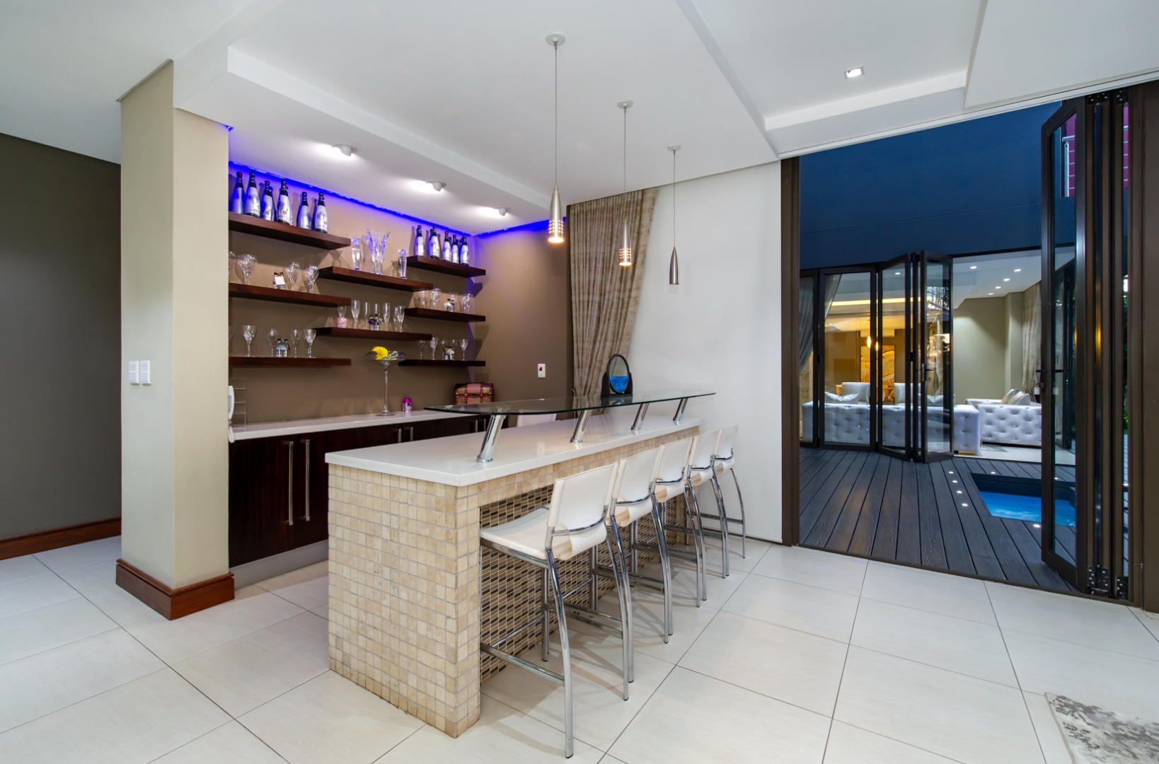 The everyday living spaces are ideal for relaxed, fluid entertainment—offering a family lounge, built-in gas griller, designer champagne bar, and a wraparound pool deck with covered glass-roof patio set amongst towering palm trees.