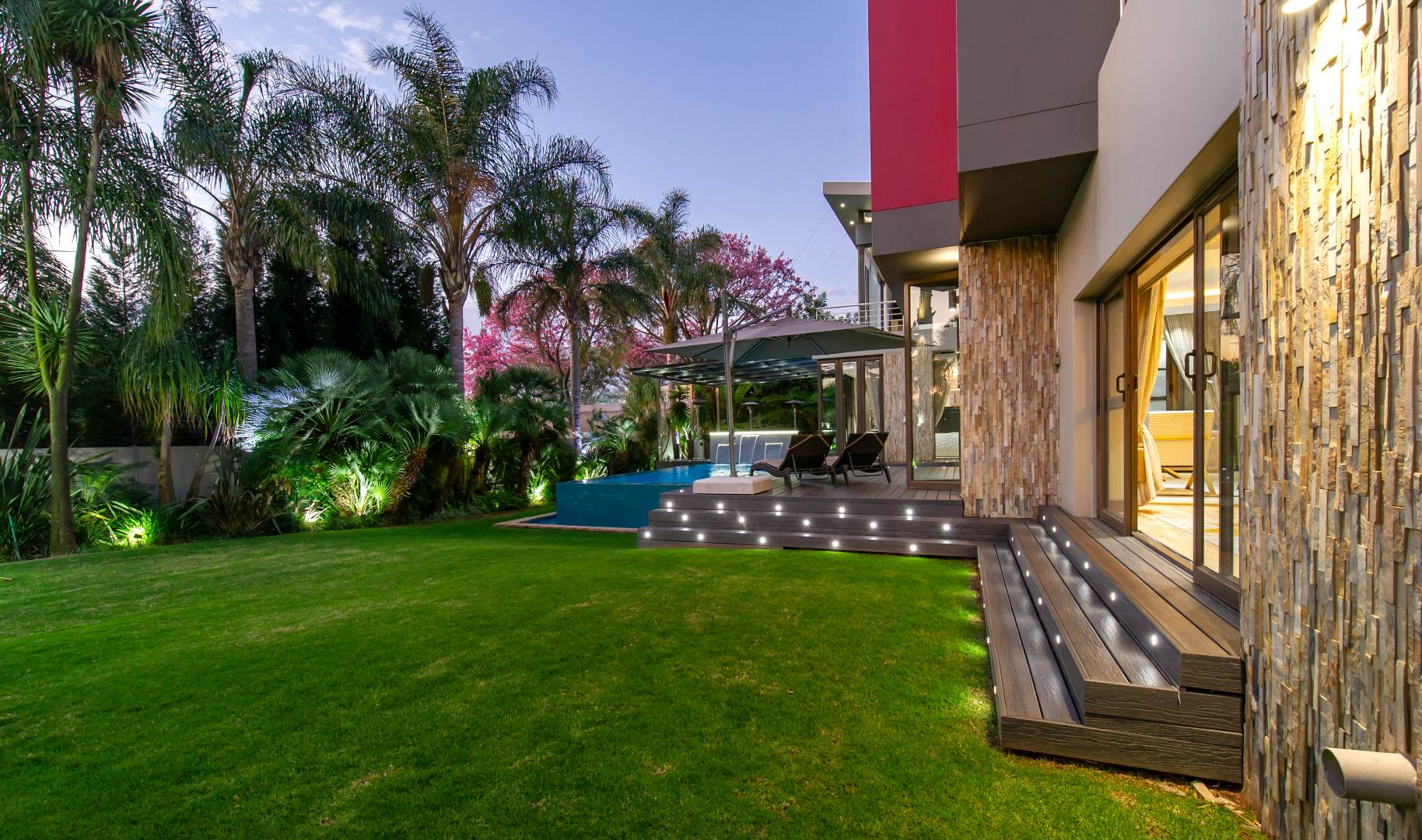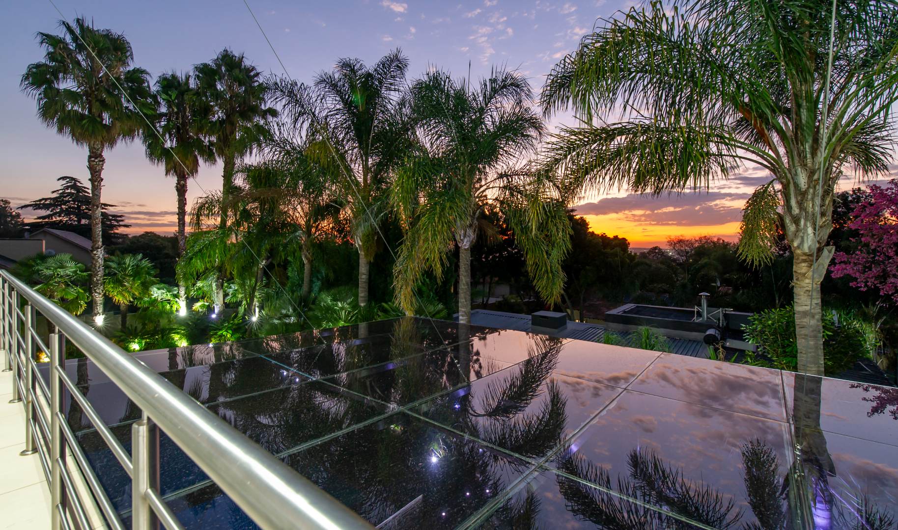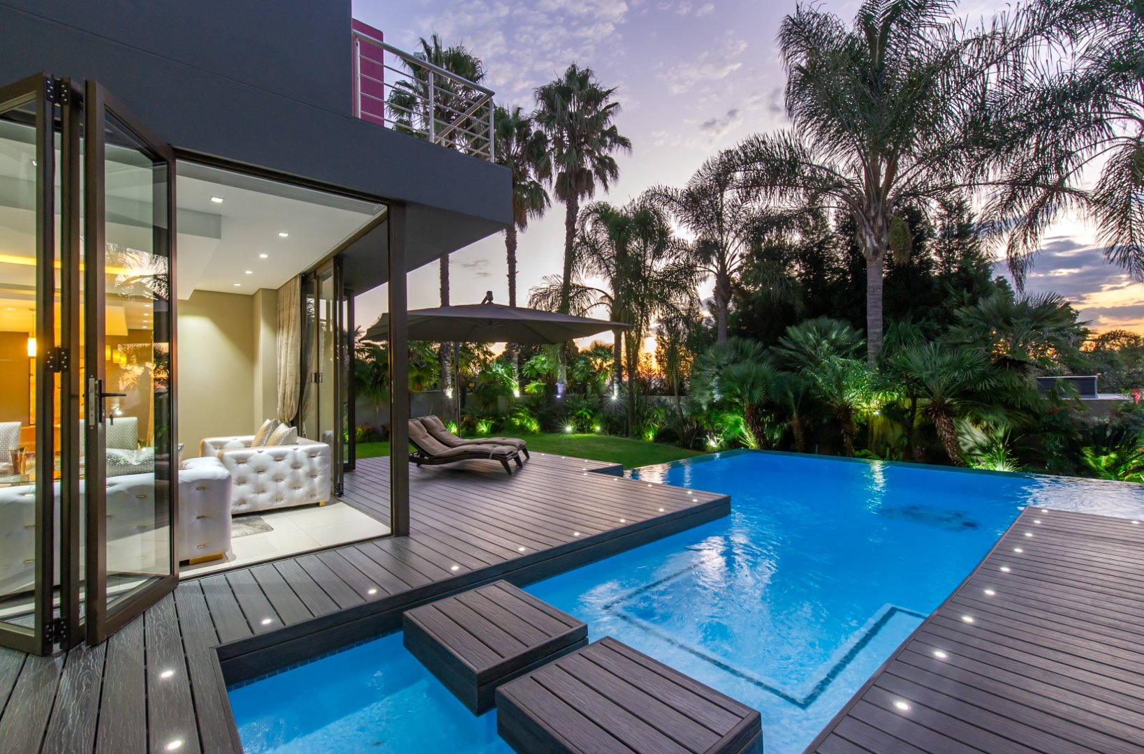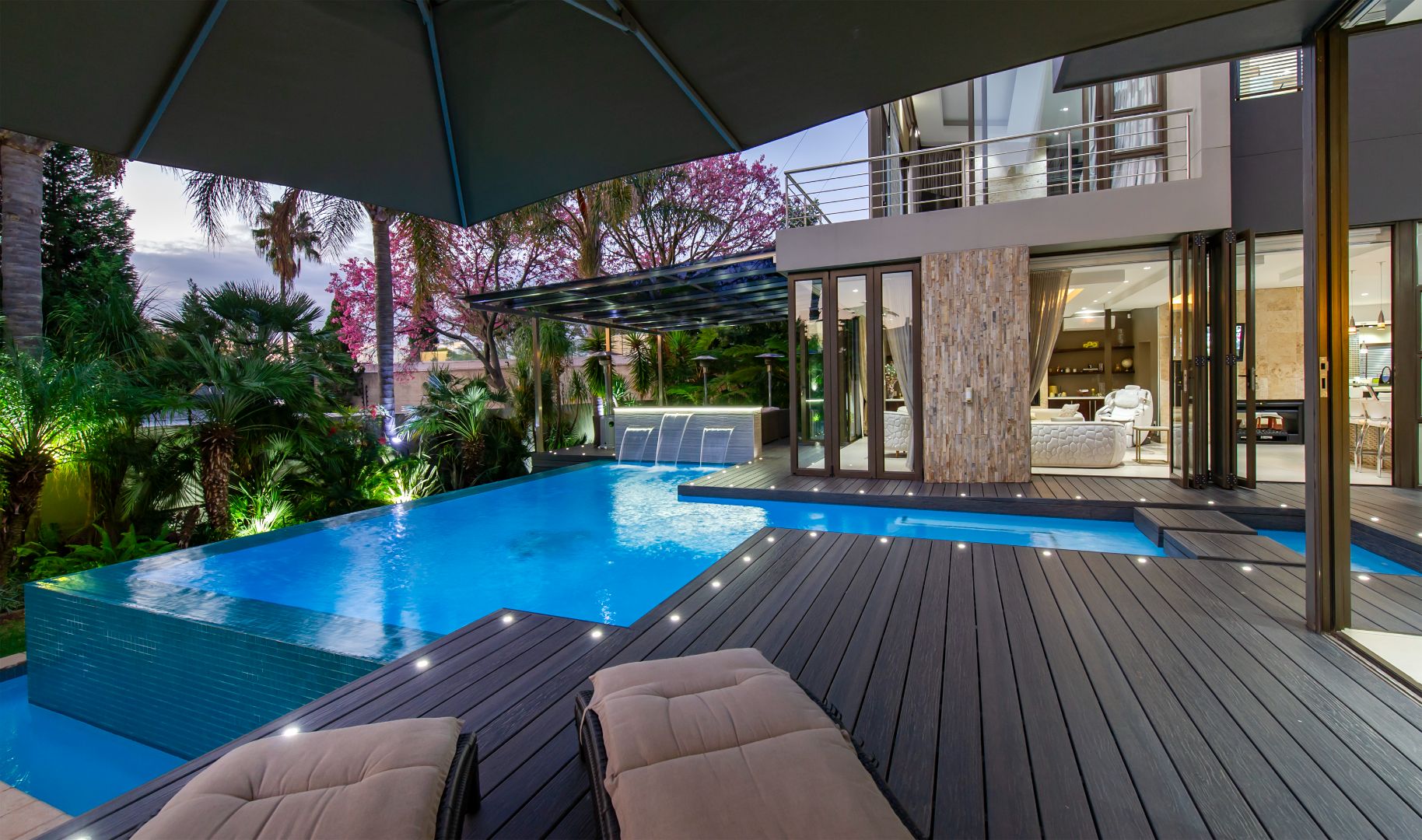 The everyday living spaces are ideal for relaxed, fluid entertainment—offering a family lounge, built-in gas griller, designer champagne bar, and a wraparound pool deck with covered glass-roof patio set amongst towering palm trees.