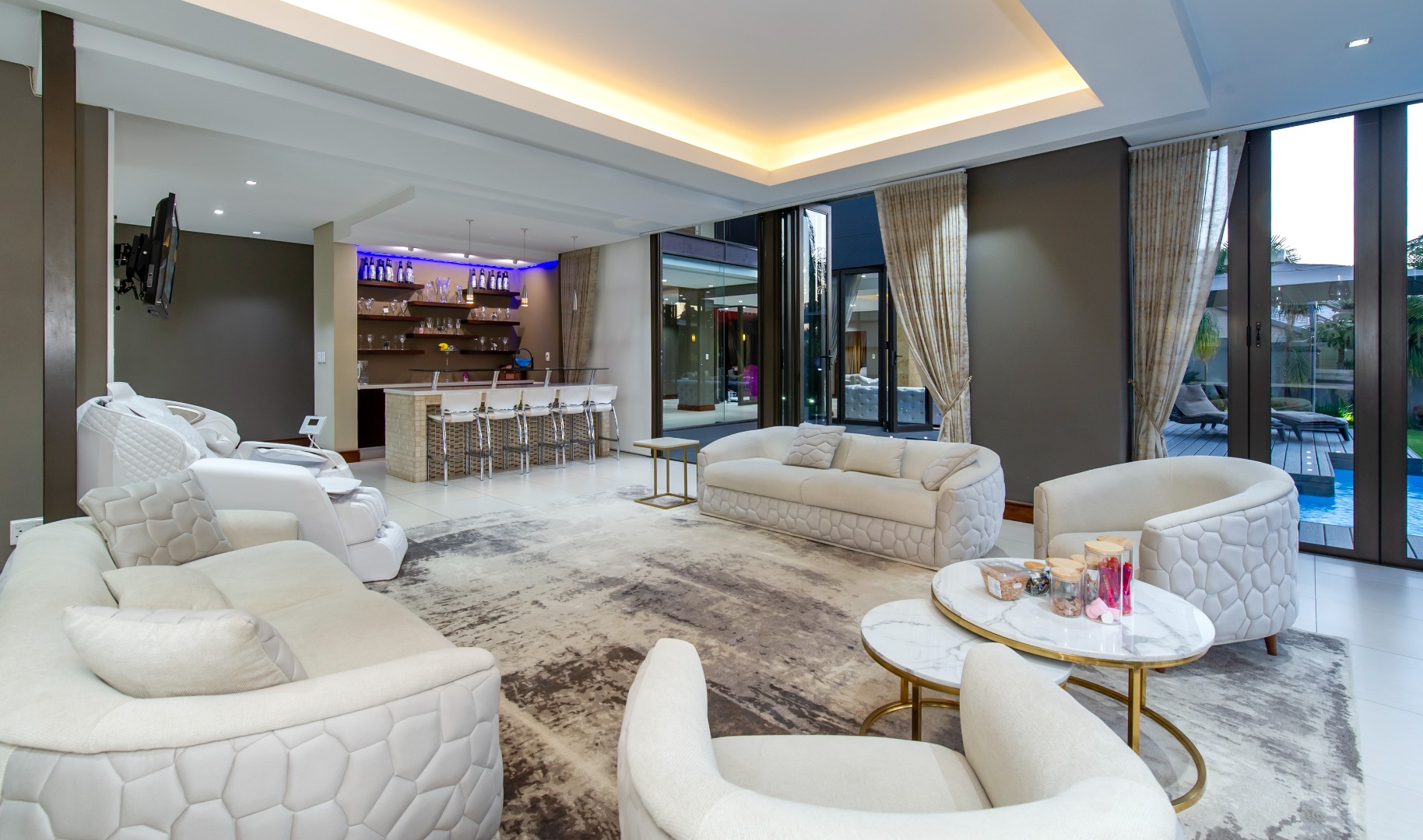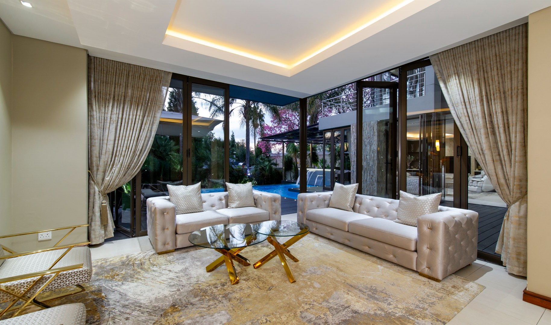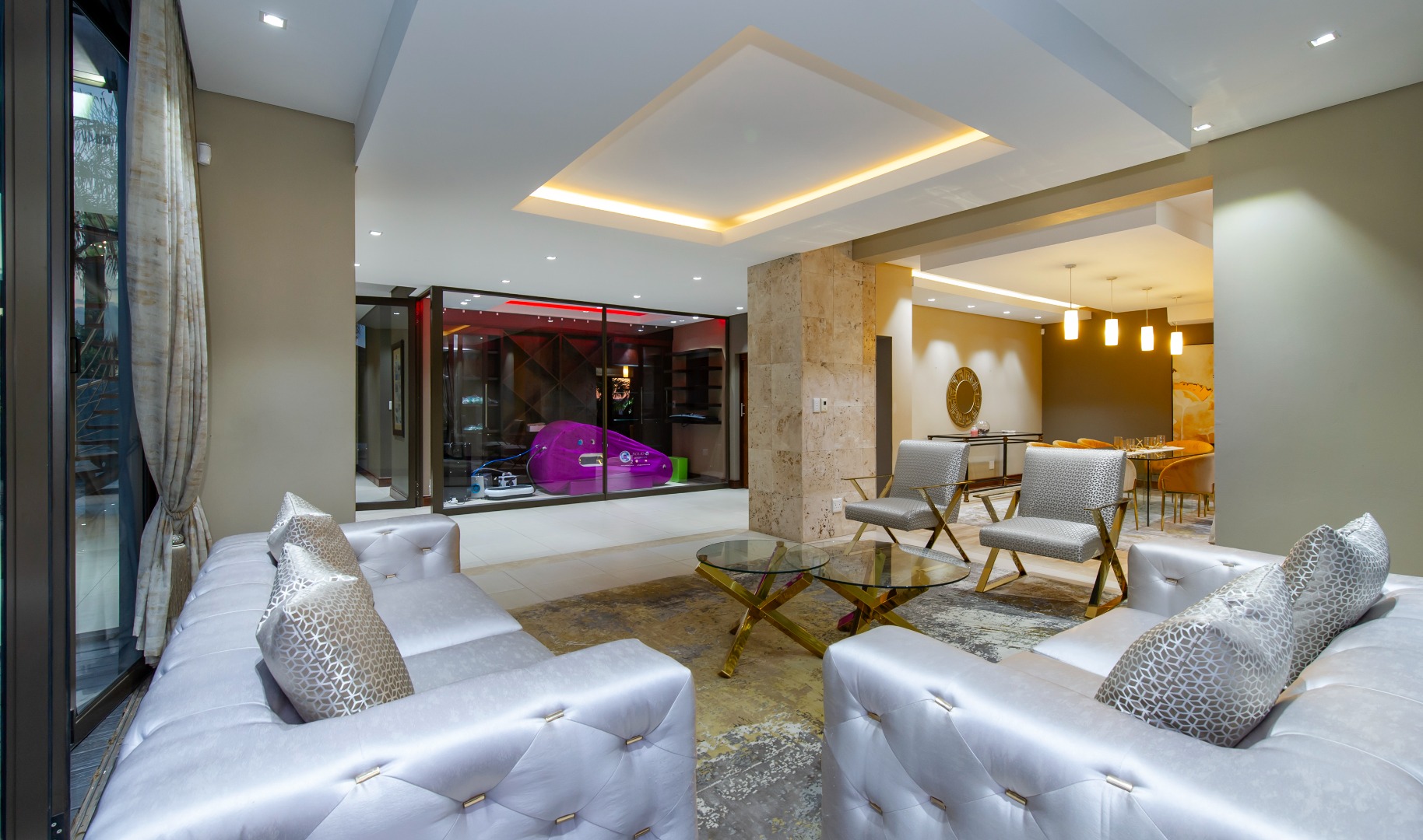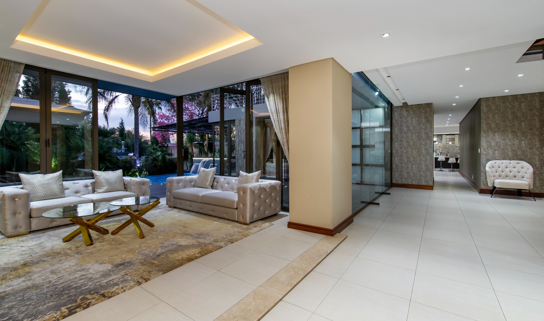 Designed for seamless entertaining, the home features a private formal wing with a sumptuous lounge, stackable doors opening onto the outdoors, and a formal dining area surrounded by lush greenery. A glass-encased wine cellar or memorabilia display adds a refined touch, while a private cinema lounge provides the perfect retreat.