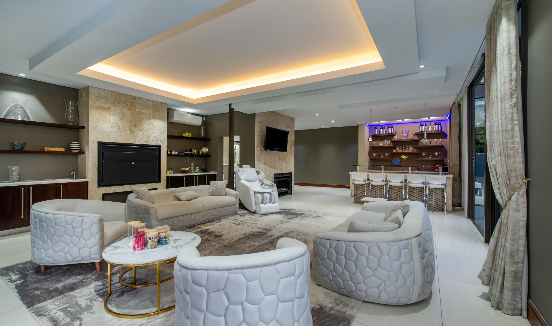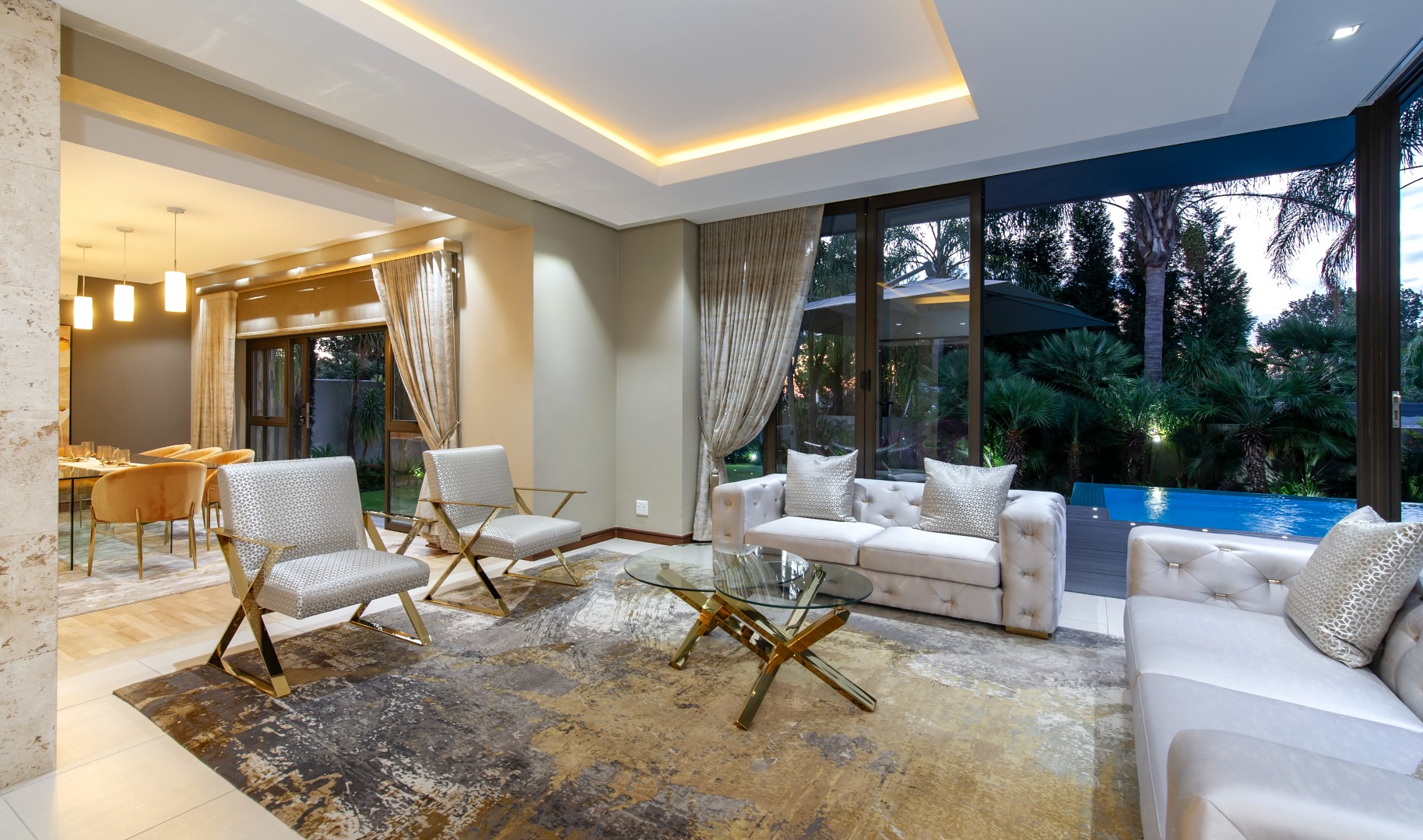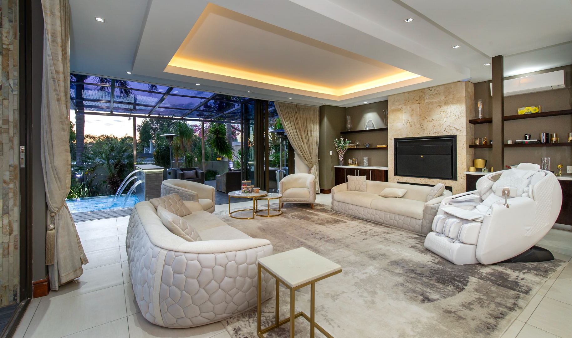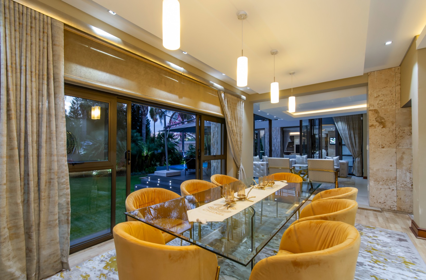 Designed for seamless entertaining, the home features a private formal wing with a sumptuous lounge, stackable doors opening onto the outdoors, and a formal dining area surrounded by lush greenery. A glass-encased wine cellar or memorabilia display adds a refined touch, while a private cinema lounge provides the perfect retreat.