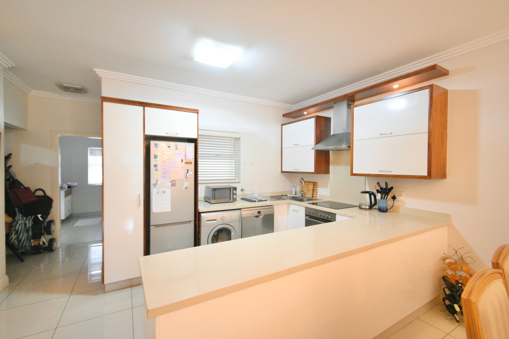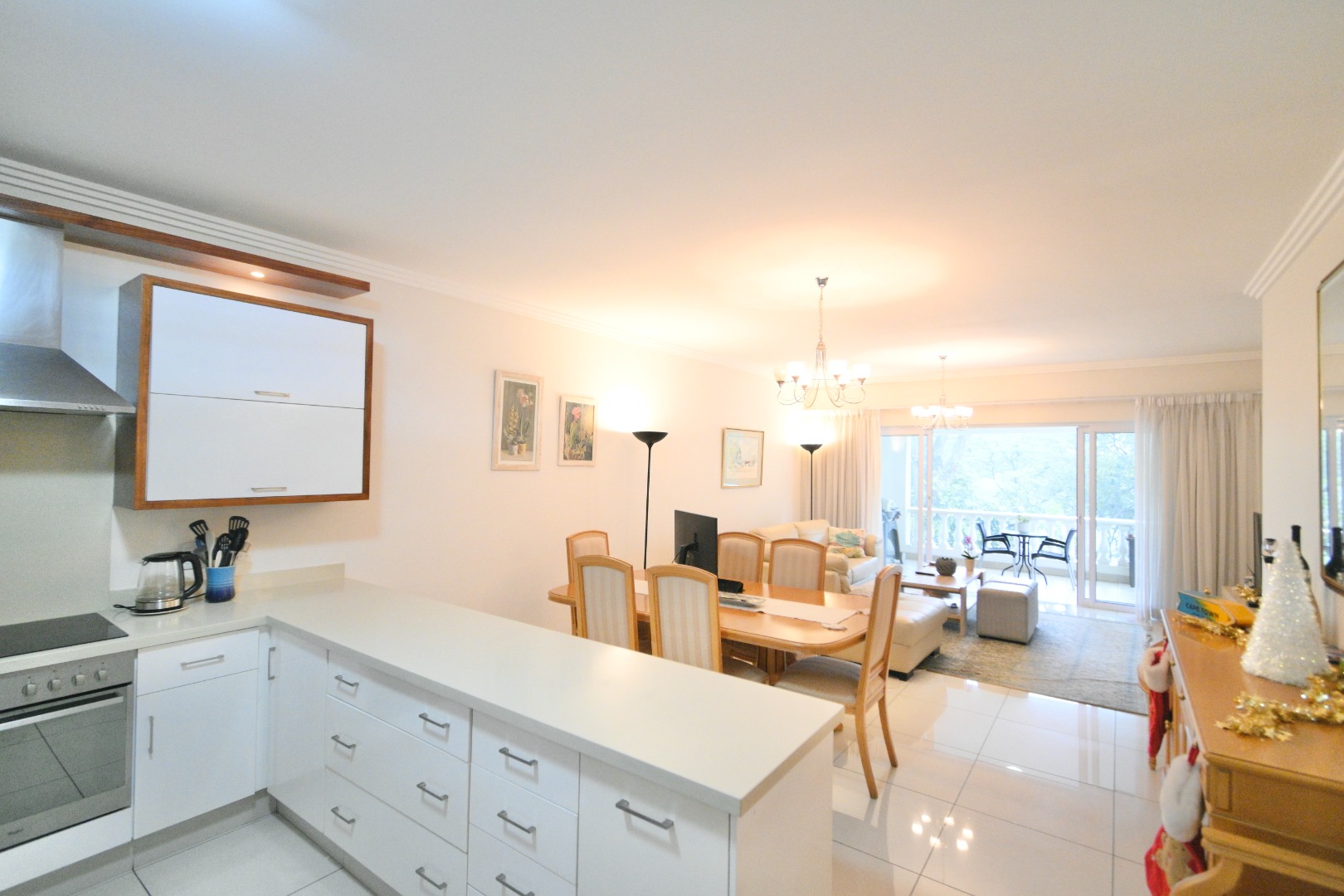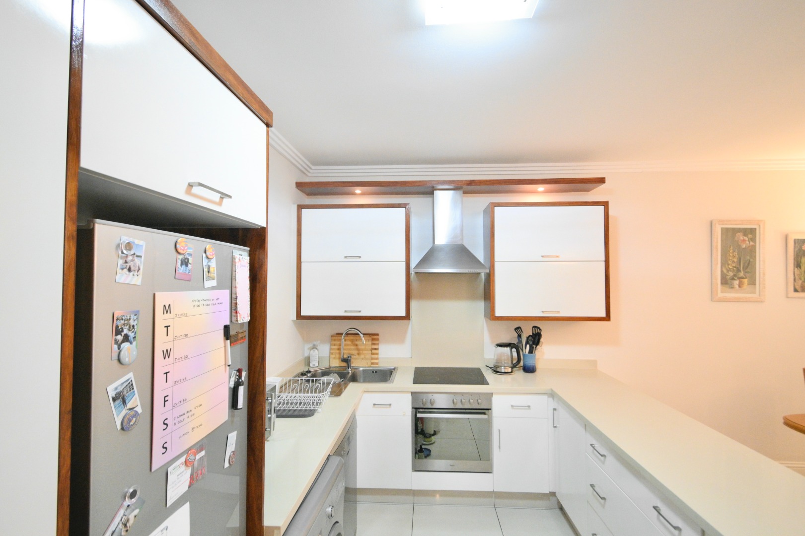 This fully furnished two-bedroom, two-bathroom apartment offers a contemporary living experience within a secure complex. Spanning 125 square metres, the residence features an intelligently designed open-plan layout that seamlessly integrates the lounge, dining area, and modern kitchen. The kitchen is well-appointed with sleek white and wood cabinetry, light-coloured countertops, and essential stainless steel appliances including an oven, hob, extractor fan, dishwasher, and washing machine, complemented by a functional breakfast bar. White tiled flooring and neutral decor create a bright and inviting atmosphere throughout the main living spaces.