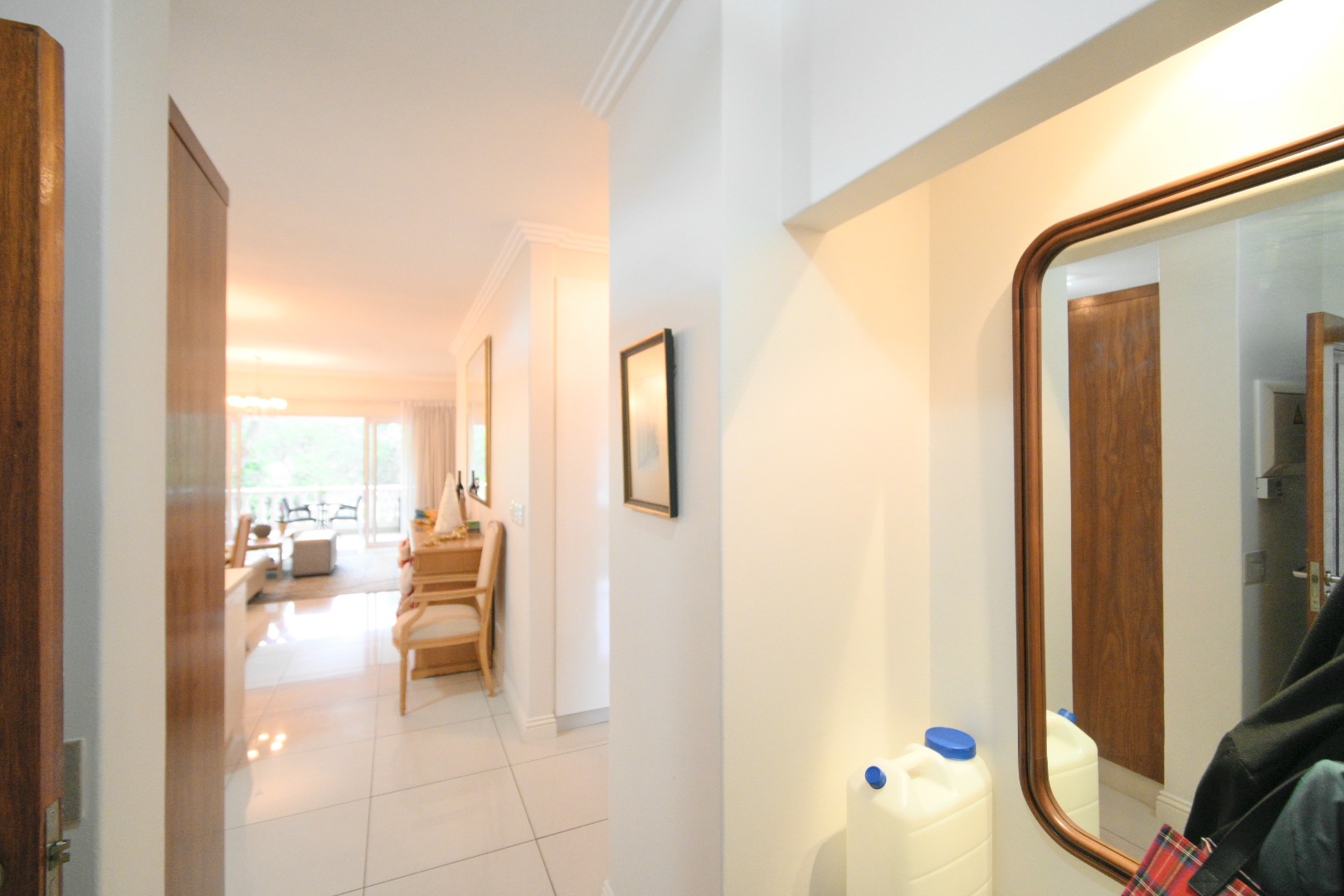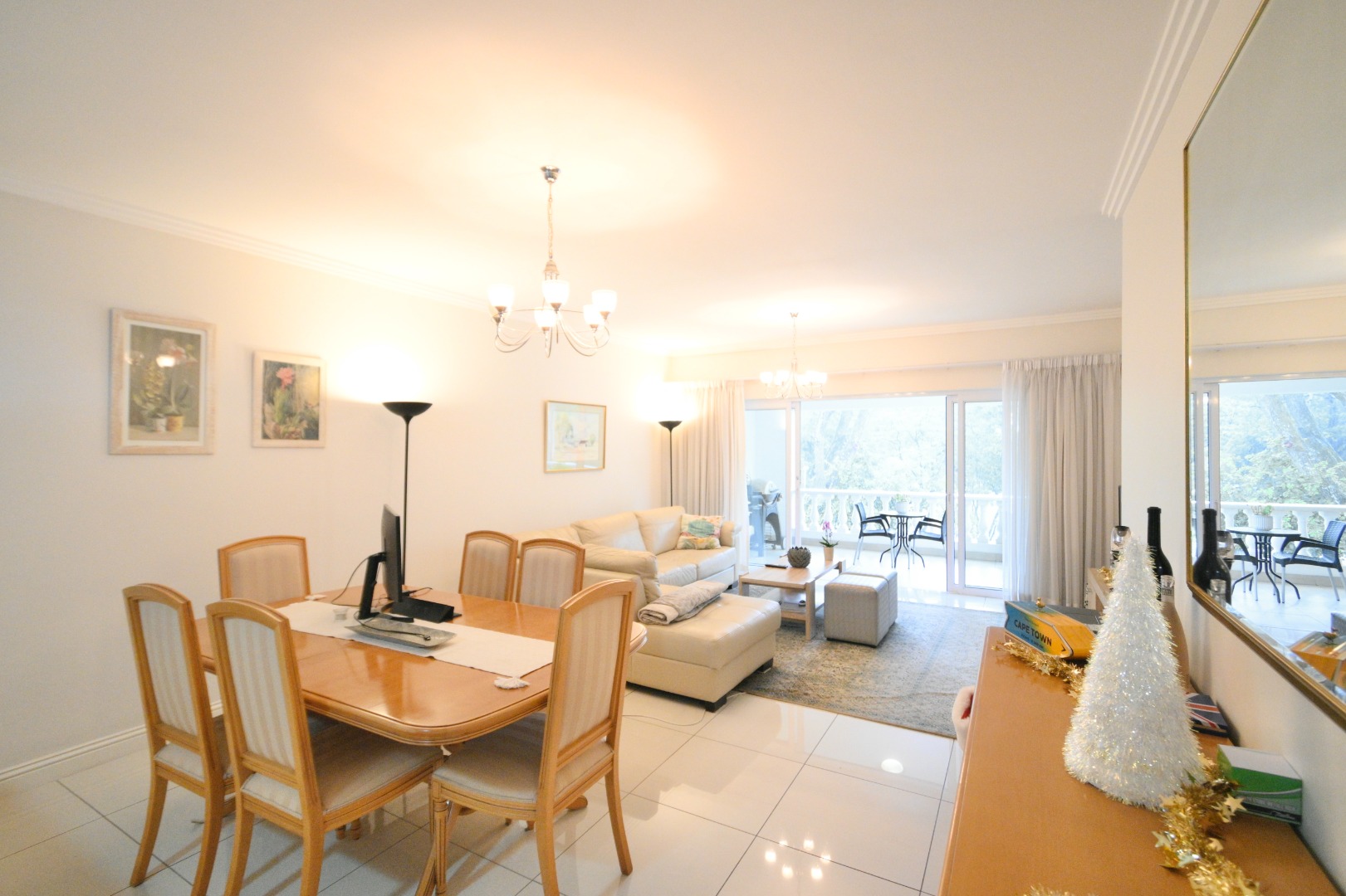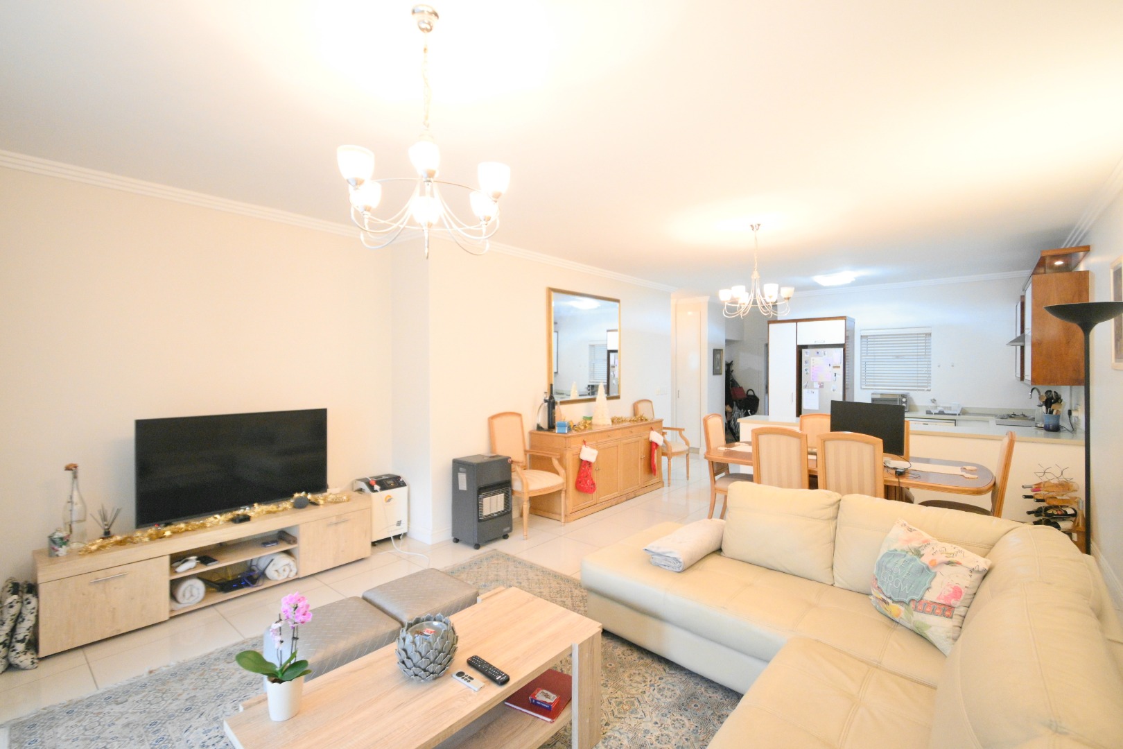 This fully furnished two-bedroom, two-bathroom apartment offers a contemporary living experience within a secure complex. Spanning 125 square metres, the residence features an intelligently designed open-plan layout that seamlessly integrates the lounge, dining area, and modern kitchen. The kitchen is well-appointed with sleek white and wood cabinetry, light-coloured countertops, and essential stainless steel appliances including an oven, hob, extractor fan, dishwasher, and washing machine, complemented by a functional breakfast bar. White tiled flooring and neutral decor create a bright and inviting atmosphere throughout the main living spaces.