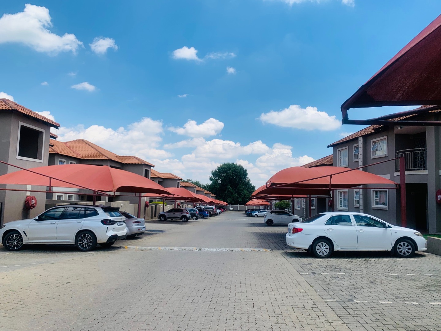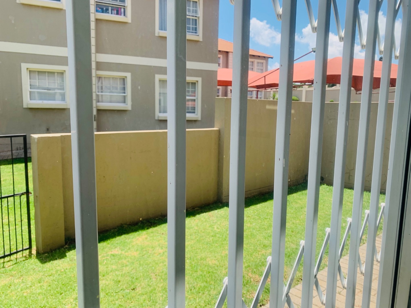 Security is a key feature of this complex, which benefits from a gated entrance with a guardhouse, providing controlled access. Additional security gates on the unit's exterior doors and windows enhance safety. The property includes one dedicated parking bay, with shaded carports available within the well-maintained paved driveways.