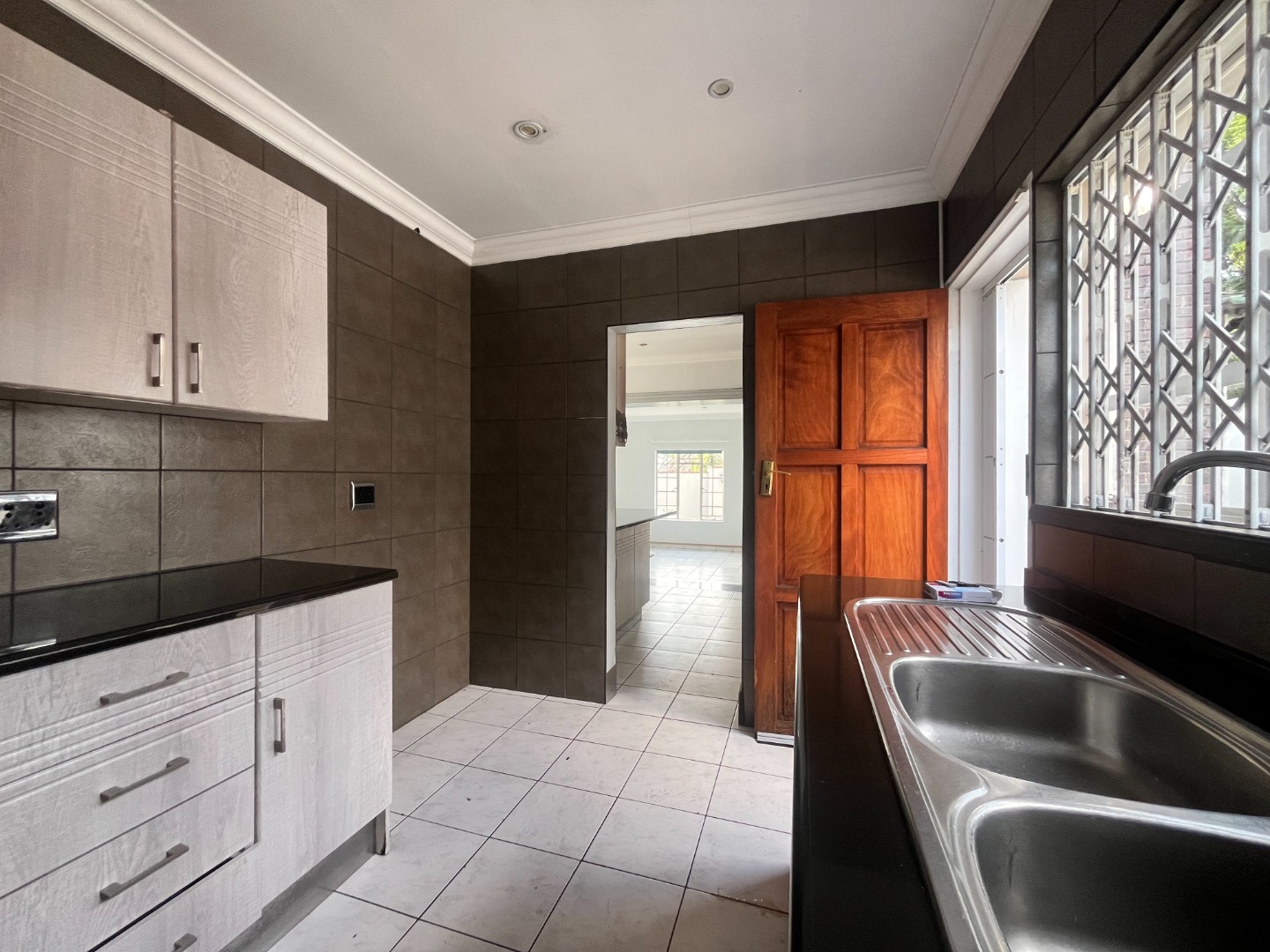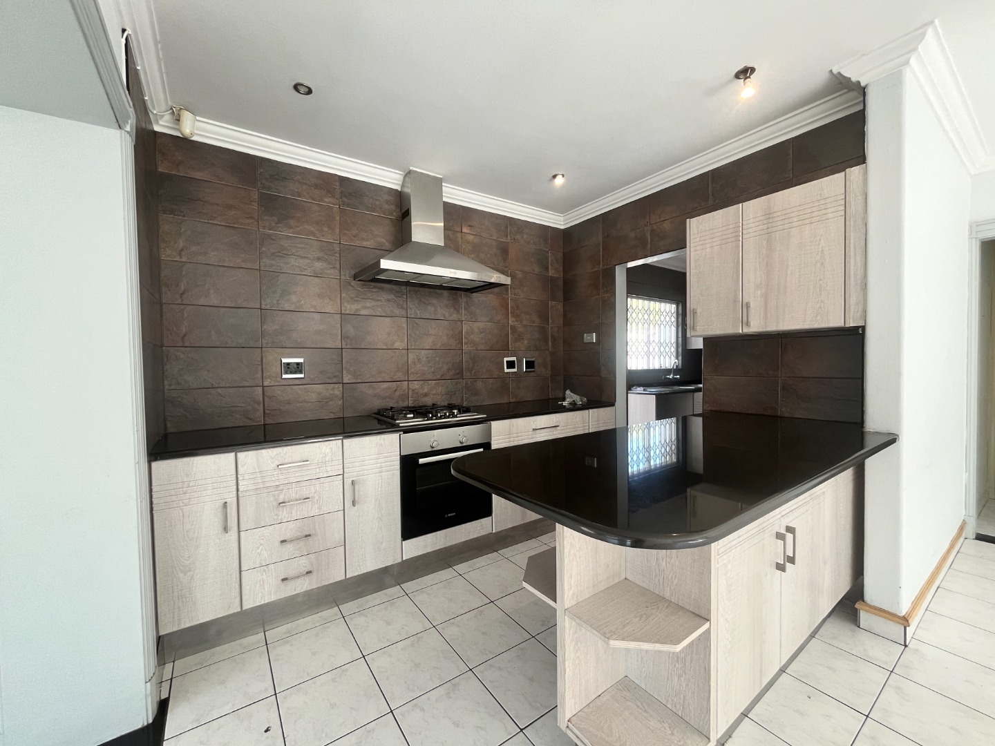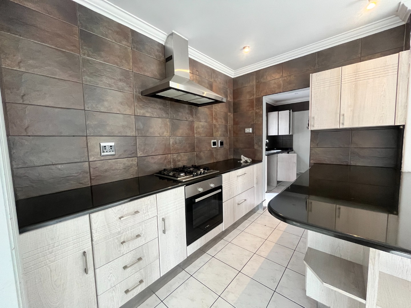 The modern kitchen is the heart of the home, featuring sleek black stone countertops, a gas hob with extractor, and ample space for a double-door fridge. An adjoining scullery adds practical utility with extra workspace and storage, keeping the kitchen clutter-free.