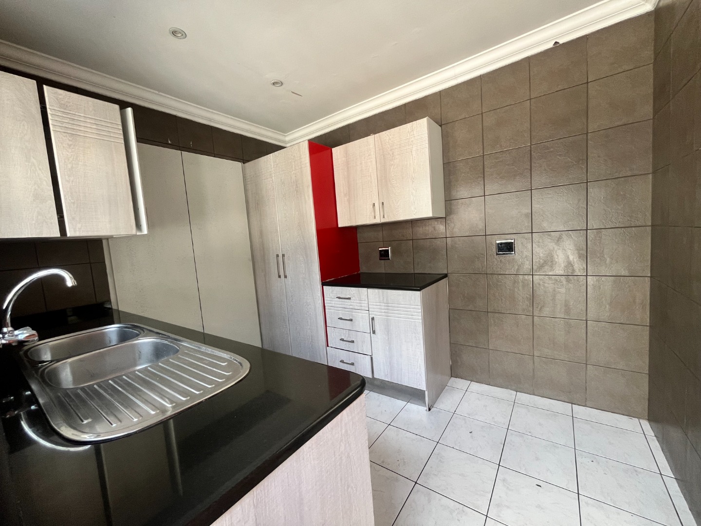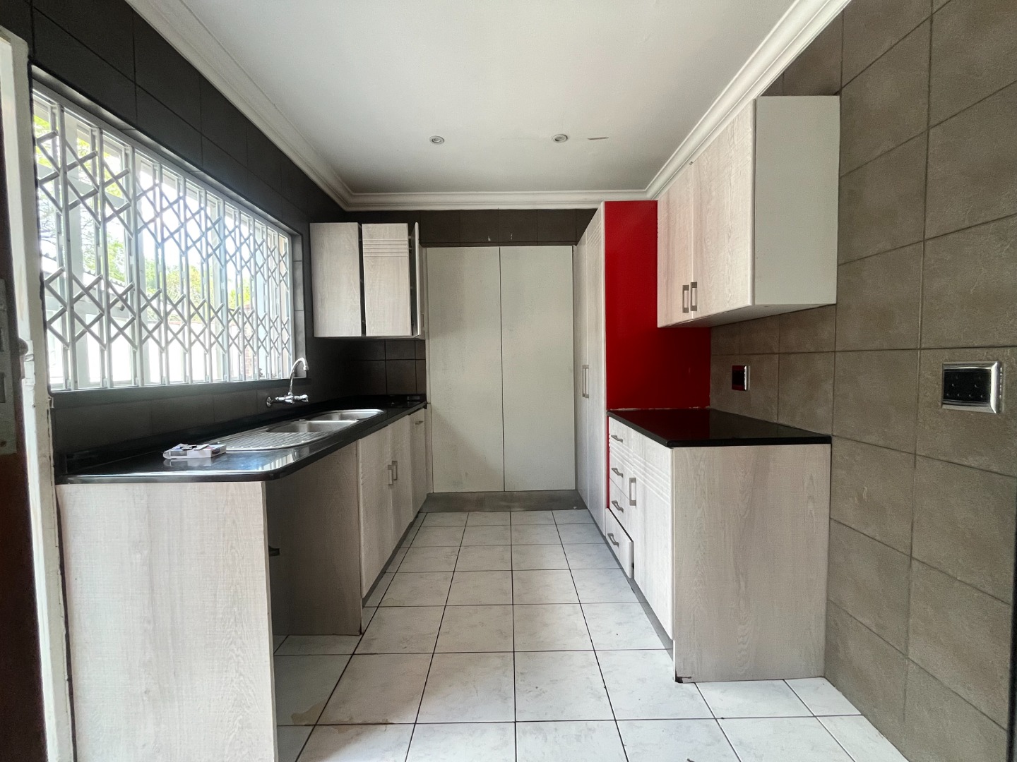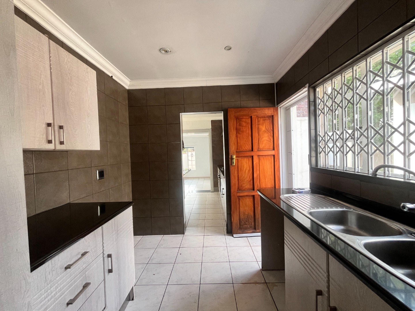 The modern kitchen is the heart of the home, featuring sleek black stone countertops, a gas hob with extractor, and ample space for a double-door fridge. An adjoining scullery adds practical utility with extra workspace and storage, keeping the kitchen clutter-free.