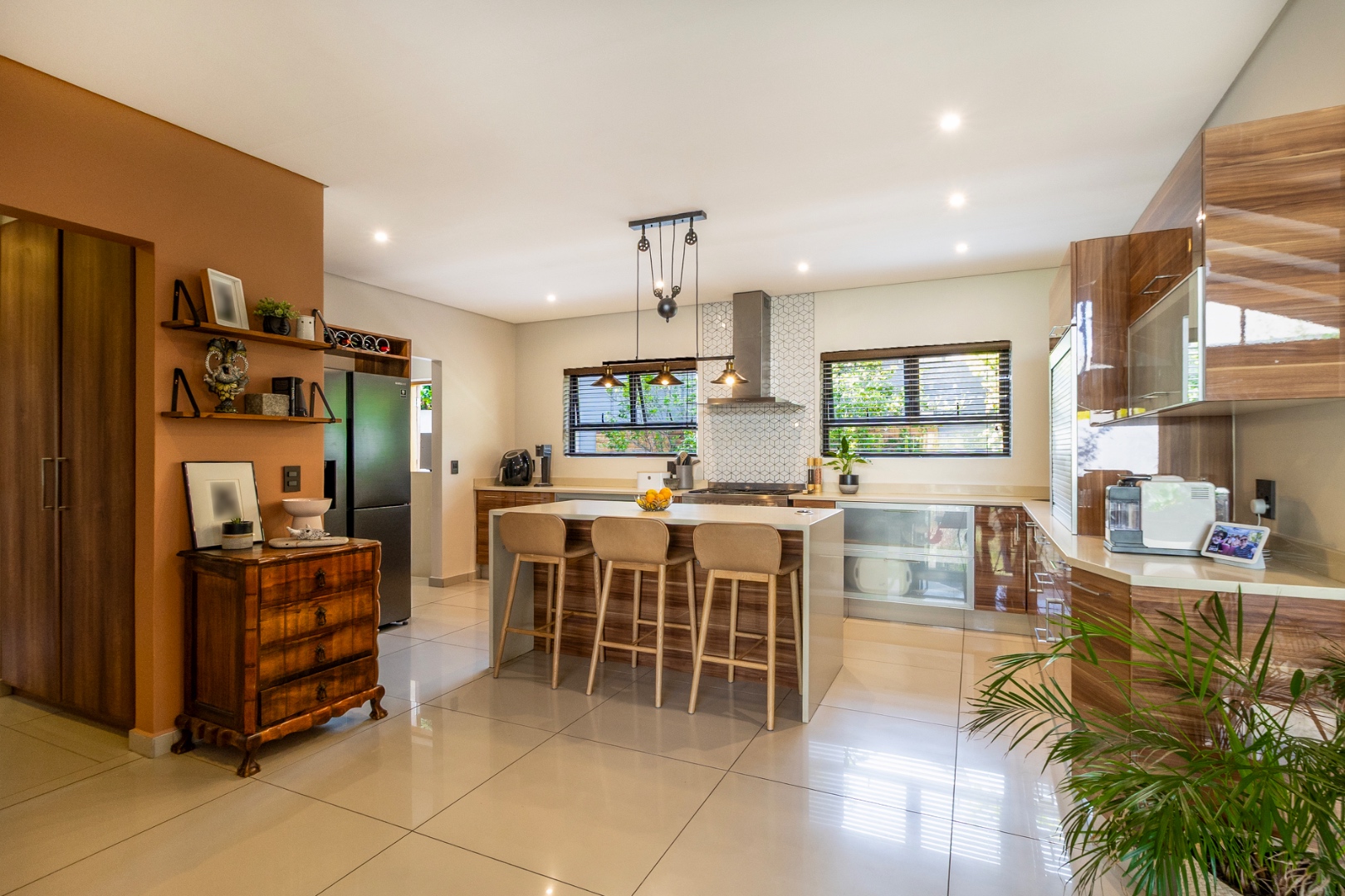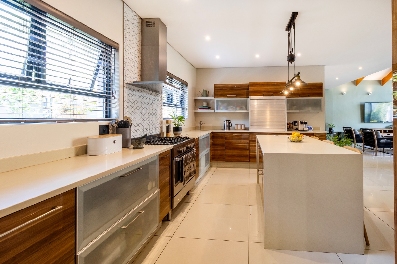 The heart of this magnificent home is its open-plan living concept, seamlessly integrating the lounge and dining areas. Tiled floors lend a contemporary edge, while large sliding doors effortlessly connect the interior to the serene outdoor spaces, fostering an idyllic indoor-outdoor lifestyle. The property features two state-of-the-art kitchens, catering to both grand entertaining and intimate culinary experiences. Dedicated office and study spaces, complete with built-in cabinetry and modern recessed lighting, provide the perfect environment for productivity and focus, with frosted windows ensuring privacy without sacrificing illumination.